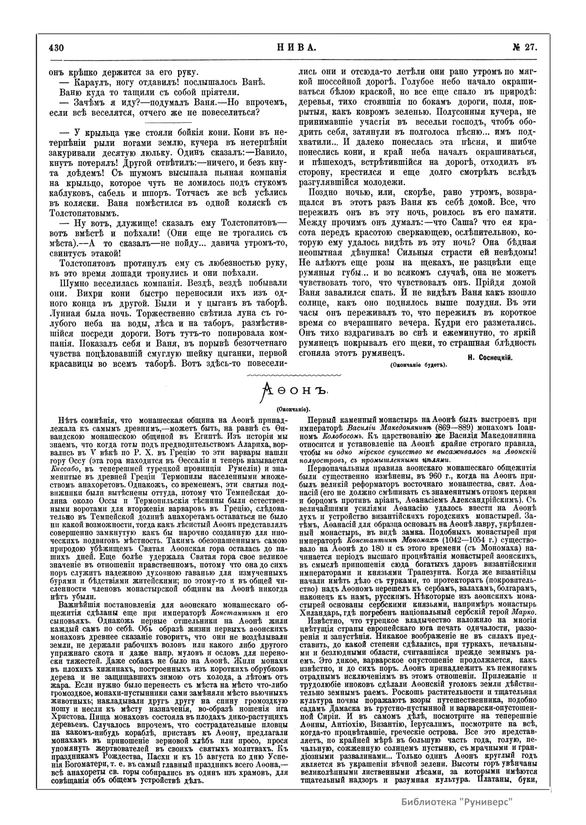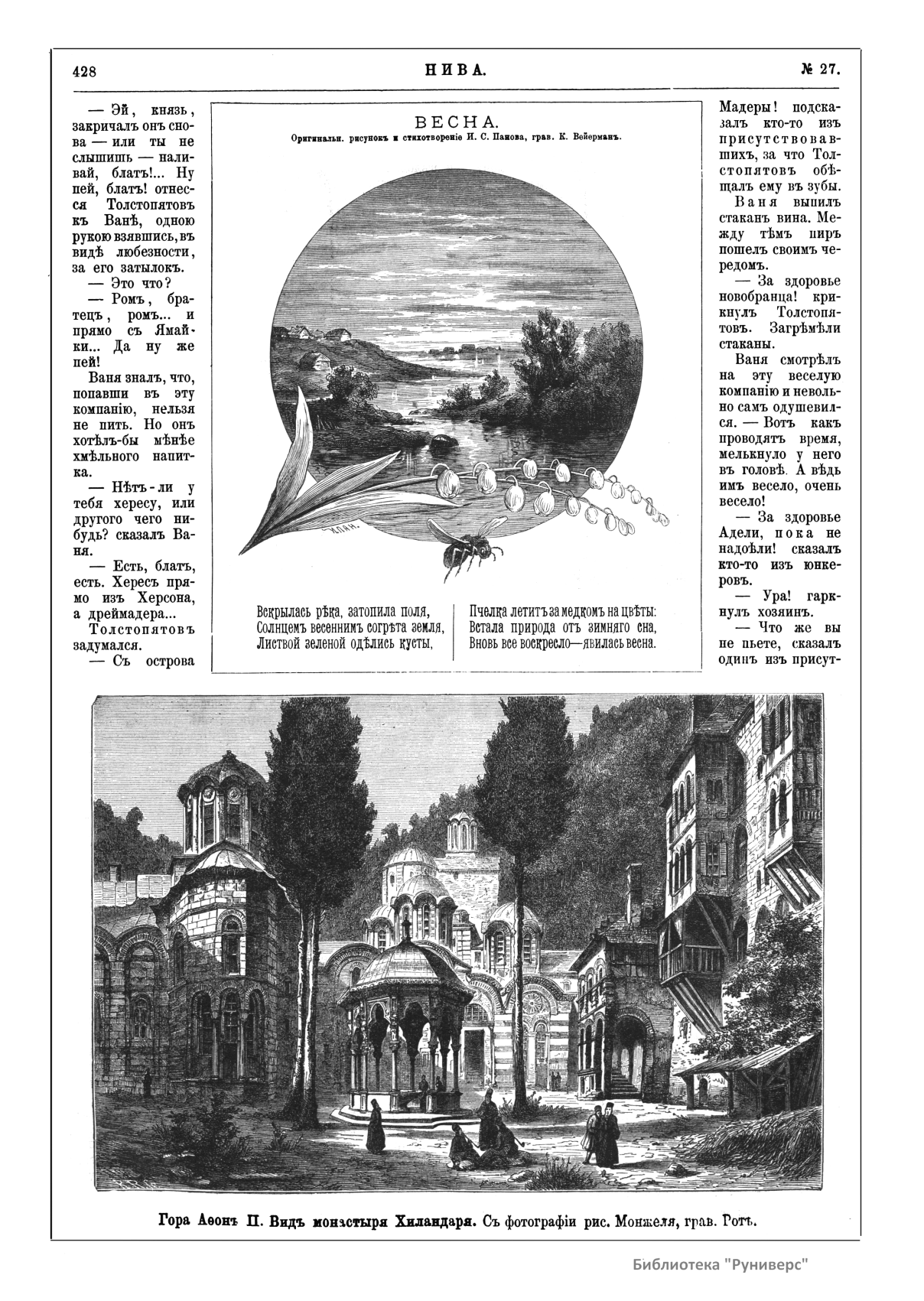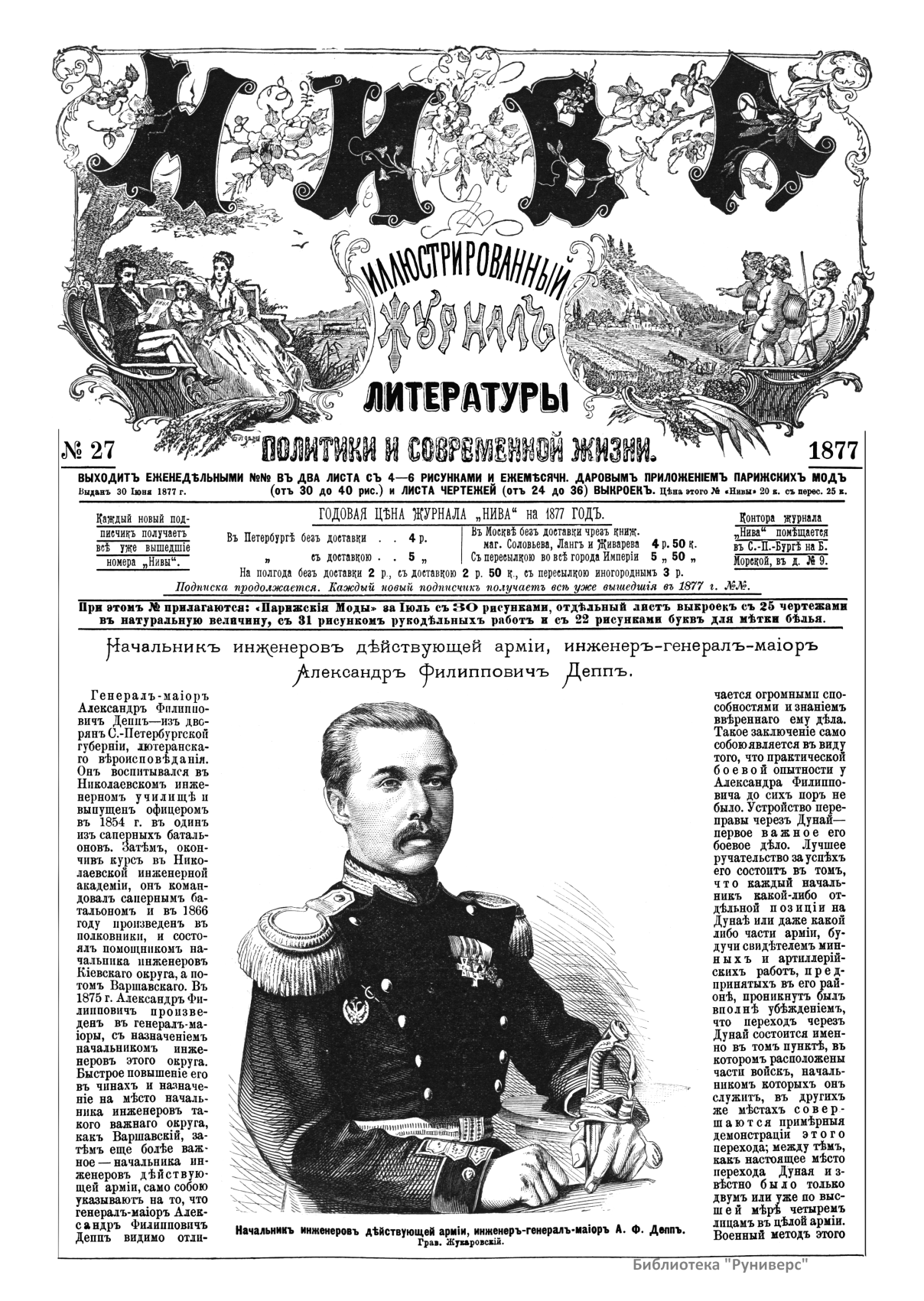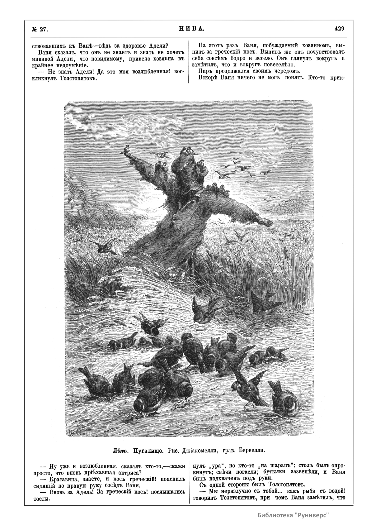 «Нива» — популярный еженедельный русский журнал с приложениями, издававшийся со второй половины XIX до начала XX века, носил подзаголовок «Журнал литературы, политики и современной жизни». Журнал был любимым детищем А. Ф. Маркса, возглавлявшего свое издательство вплоть до своей смерти в 1904 г. Позиционировалась «Нива» как иллюстрированный журнал для семейного чтения и был ориентирован, главным образом, на обывателя. В журнале публиковались литературные произведения, исторические, научно-популярные очерки, репродукции и гравюры картин современных художников. Материалы политического и общественного содержания также сопровождались многочисленными иллюстрациями. Среди известных литераторов, печатавшихся в журнале, были А. К. Толстой, Ф. И. Тютчев, Л. Н. Толстой, А. А. Фет, А. П. Чехов, Максим Горький, Корней Чуковский, Анна Ахматова, Иван Бунин и многие другие. Благодаря «Ниве» сочинения многих современных авторов добрались до самых отдаленных областей России.