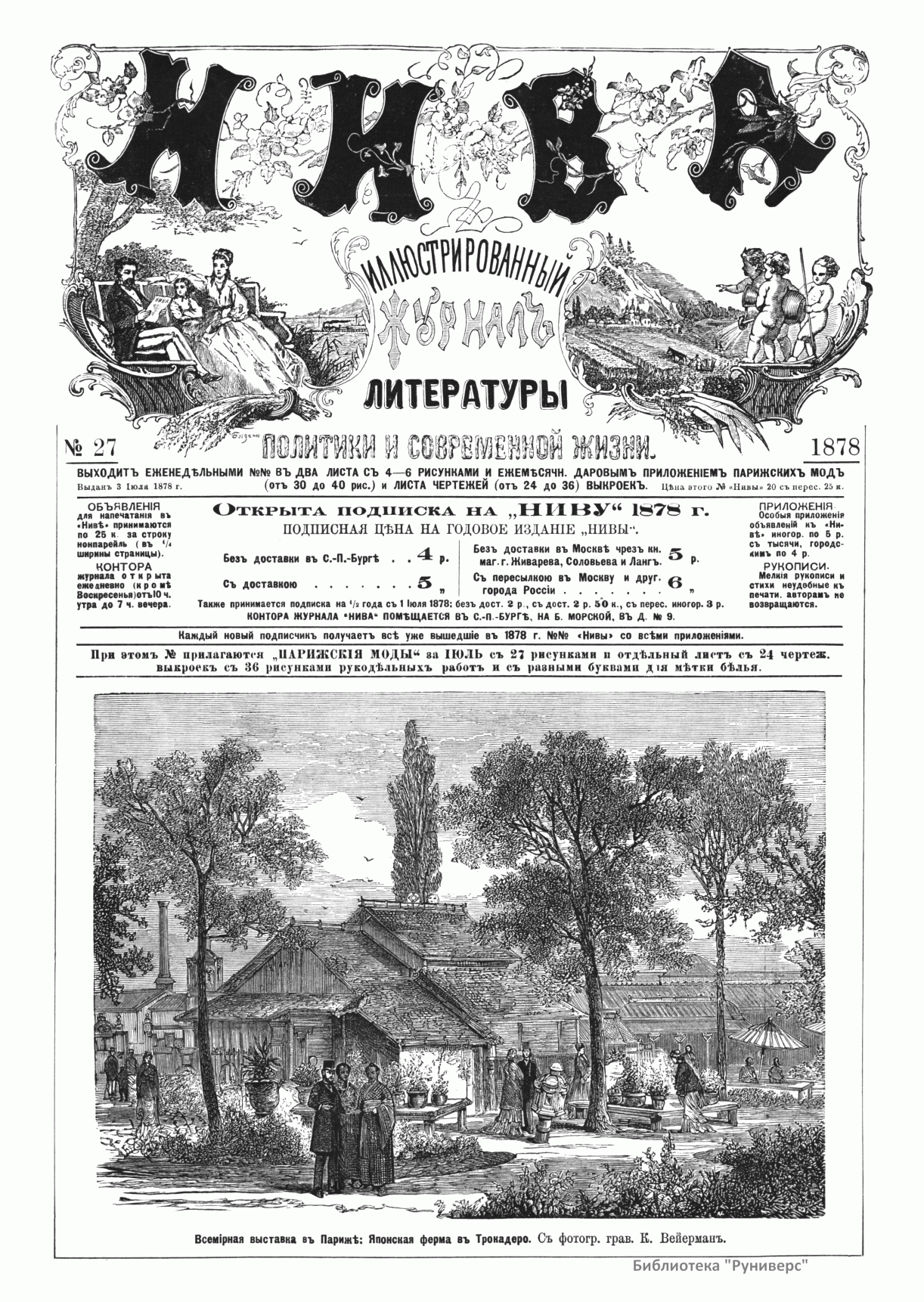 «Нива» — популярный еженедельный русский журнал с приложениями, издававшийся со второй половины XIX до начала XX века, носил подзаголовок «Журнал литературы, политики и современной жизни». Журнал был любимым детищем А. Ф. Маркса, возглавлявшего свое издательство вплоть до своей смерти в 1904 г. Позиционировалась «Нива» как иллюстрированный журнал для семейного чтения и был ориентирован, главным образом, на обывателя. В журнале публиковались литературные произведения, исторические, научно-популярные очерки, репродукции и гравюры картин современных художников. Материалы политического и общественного содержания также сопровождались многочисленными иллюстрациями. Среди известных литераторов, печатавшихся в журнале, были А. К. Толстой, Ф. И. Тютчев, Л. Н. Толстой, А. А. Фет, А. П. Чехов, Максим Горький, Корней Чуковский, Анна Ахматова, Иван Бунин и многие другие. Благодаря «Ниве» сочинения многих современных авторов добрались до самых отдаленных областей России.