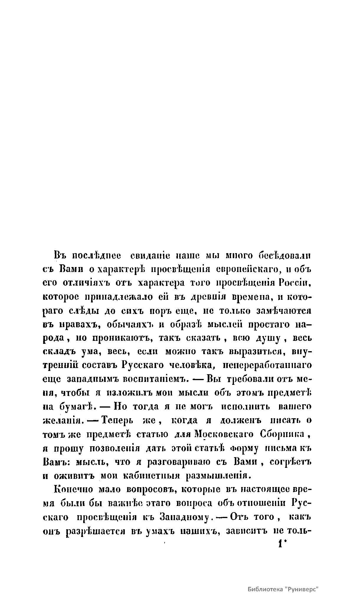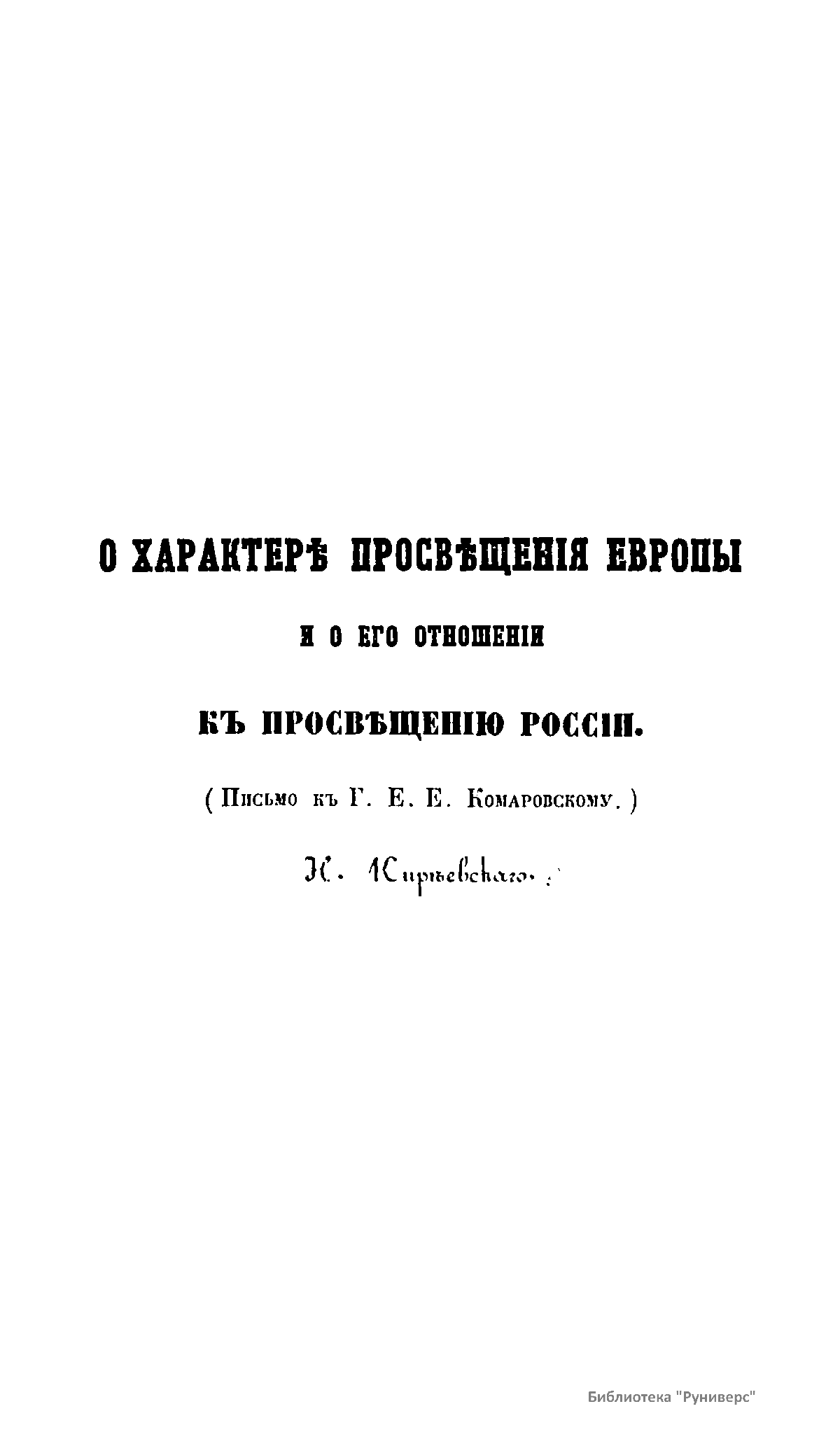 О характерѣ просвѣщенiя Европы и о его отношенiи къ просвѣщенiю Россiи