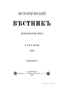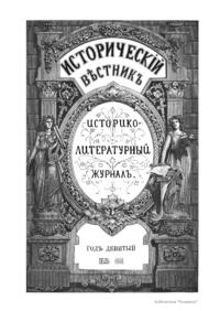 «Исторический вестник» - русский ежемесячный историко-литературный журнал. Издавался в Санкт-Петербурге с 1880-го по 1917 г. Журнал был основан А.С. Сувориным и С.Н. Шубинским с целью «знакомить читателей в живой, общедоступной форме с современным состоянием исторической науки и литературы в России и Европе». Вышло 150 тт. Каждый том состоял из трёх ежемесячных выпусков, имел свою нумерацию страниц, оглавление, список иллюстраций. Журнал приобрёл устойчивую популярность среди читателей, заняв прочное место в «триумвирате» русских исторических журналов наряду с «Русским архивом» и «Русской стариной». опережая их по количеству подписчиков. Отличием «Исторического вестника» было то, что он не помещал на своих страницах необработанных, сырых материалов. С другой стороны, журнал приближался по своему типу к журналам общелитературного образца, сочетая в себе коммерческий успех и доступное изложение материала.