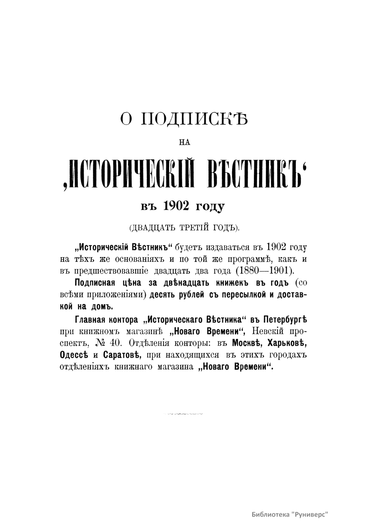 «Исторический вестник» - русский ежемесячный историко-литературный журнал. Издавался в Санкт-Петербурге с 1880-го по 1917 г. Журнал был основан А.С. Сувориным и С.Н. Шубинским с целью «знакомить читателей в живой, общедоступной форме с современным состоянием исторической науки и литературы в России и Европе». Вышло 150 тт. Каждый том состоял из трёх ежемесячных выпусков, имел свою нумерацию страниц, оглавление, список иллюстраций. Журнал приобрёл устойчивую популярность среди читателей, заняв прочное место в «триумвирате» русских исторических журналов наряду с «Русским архивом» и «Русской стариной». опережая их по количеству подписчиков. Отличием «Исторического вестника» было то, что он не помещал на своих страницах необработанных, сырых материалов. С другой стороны, журнал приближался по своему типу к журналам общелитературного образца, сочетая в себе коммерческий успех и доступное изложение материала.