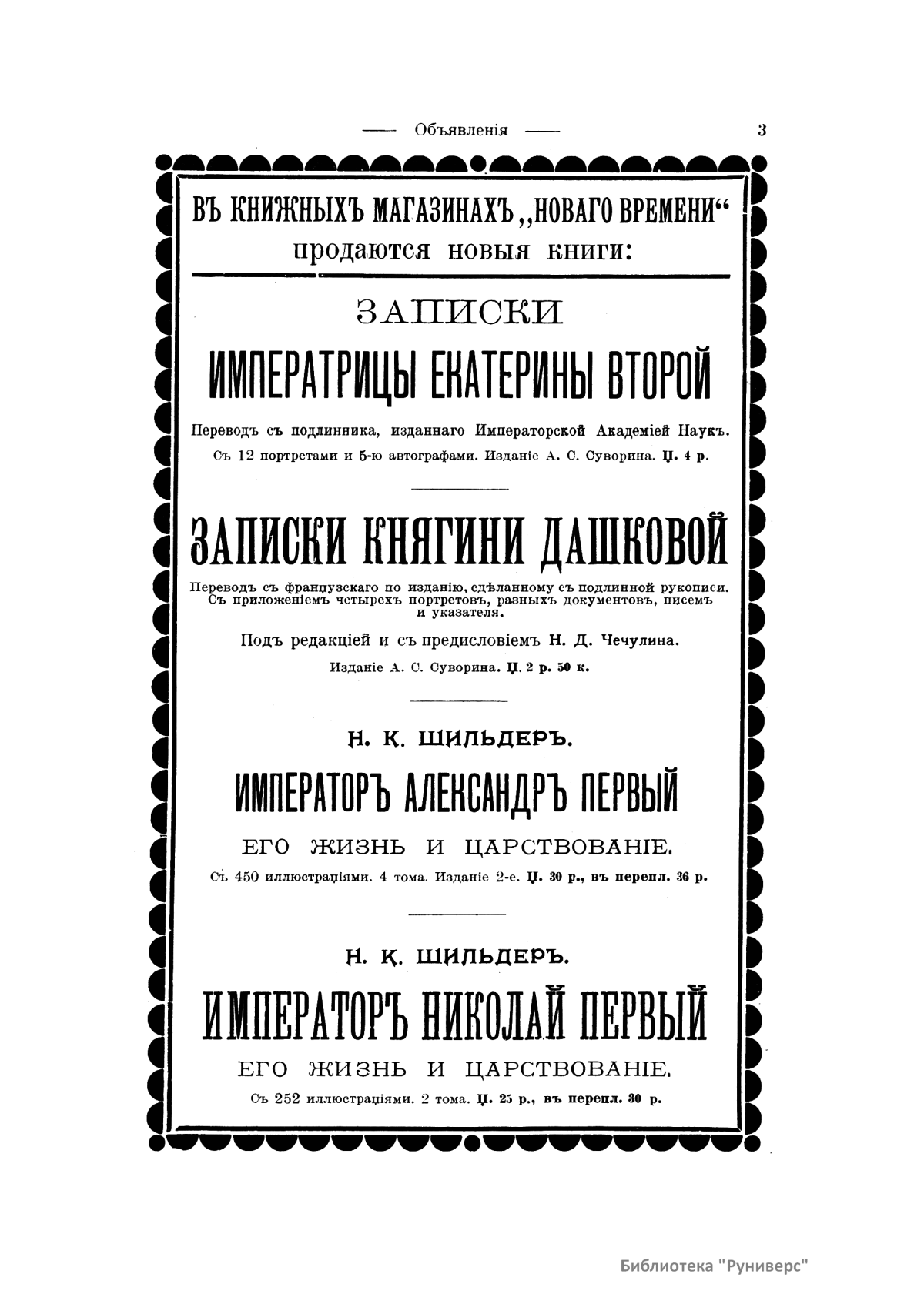 «Исторический вестник» - русский ежемесячный историко-литературный журнал. Издавался в Санкт-Петербурге с 1880-го по 1917 г. Журнал был основан А.С. Сувориным и С.Н. Шубинским с целью «знакомить читателей в живой, общедоступной форме с современным состоянием исторической науки и литературы в России и Европе». Вышло 150 тт. Каждый том состоял из трёх ежемесячных выпусков, имел свою нумерацию страниц, оглавление, список иллюстраций. Журнал приобрёл устойчивую популярность среди читателей, заняв прочное место в «триумвирате» русских исторических журналов наряду с «Русским архивом» и «Русской стариной». опережая их по количеству подписчиков. Отличием «Исторического вестника» было то, что он не помещал на своих страницах необработанных, сырых материалов. С другой стороны, журнал приближался по своему типу к журналам общелитературного образца, сочетая в себе коммерческий успех и доступное изложение материала.
