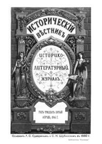 «Исторический вестник» - русский ежемесячный историко-литературный журнал. Издавался в Санкт-Петербурге с 1880-го по 1917 г. Журнал был основан А.С. Сувориным и С.Н. Шубинским с целью «знакомить читателей в живой, общедоступной форме с современным состоянием исторической науки и литературы в России и Европе». Вышло 150 тт. Каждый том состоял из трёх ежемесячных выпусков, имел свою нумерацию страниц, оглавление, список иллюстраций. Журнал приобрёл устойчивую популярность среди читателей, заняв прочное место в «триумвирате» русских исторических журналов наряду с «Русским архивом» и «Русской стариной». опережая их по количеству подписчиков. Отличием «Исторического вестника» было то, что он не помещал на своих страницах необработанных, сырых материалов. С другой стороны, журнал приближался по своему типу к журналам общелитературного образца, сочетая в себе коммерческий успех и доступное изложение материала.