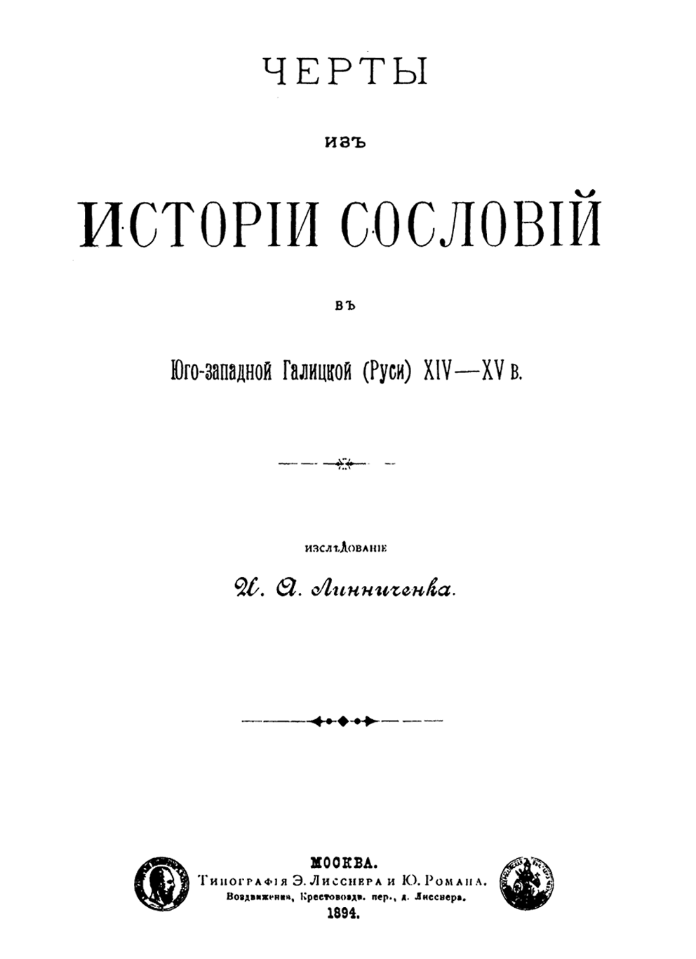 «Черты из истории сословий…» — докторская диссертация известного историка, профессора Московского университета, была защищена им в 1894 году. Изучая средневековую историю Юго-западных земель, И.А. Линниченко собрал самый обширный для его времени массив данных по этим периодам истории западных славян. Добросовестную подборку фактов и беспристрастный аналитический инструментарий ученого отмечали даже его оппоненты их числа сторонников теории украинского партикуляризма, с которыми И.А. Линниченко всю жизнь увлеченно полемизировал