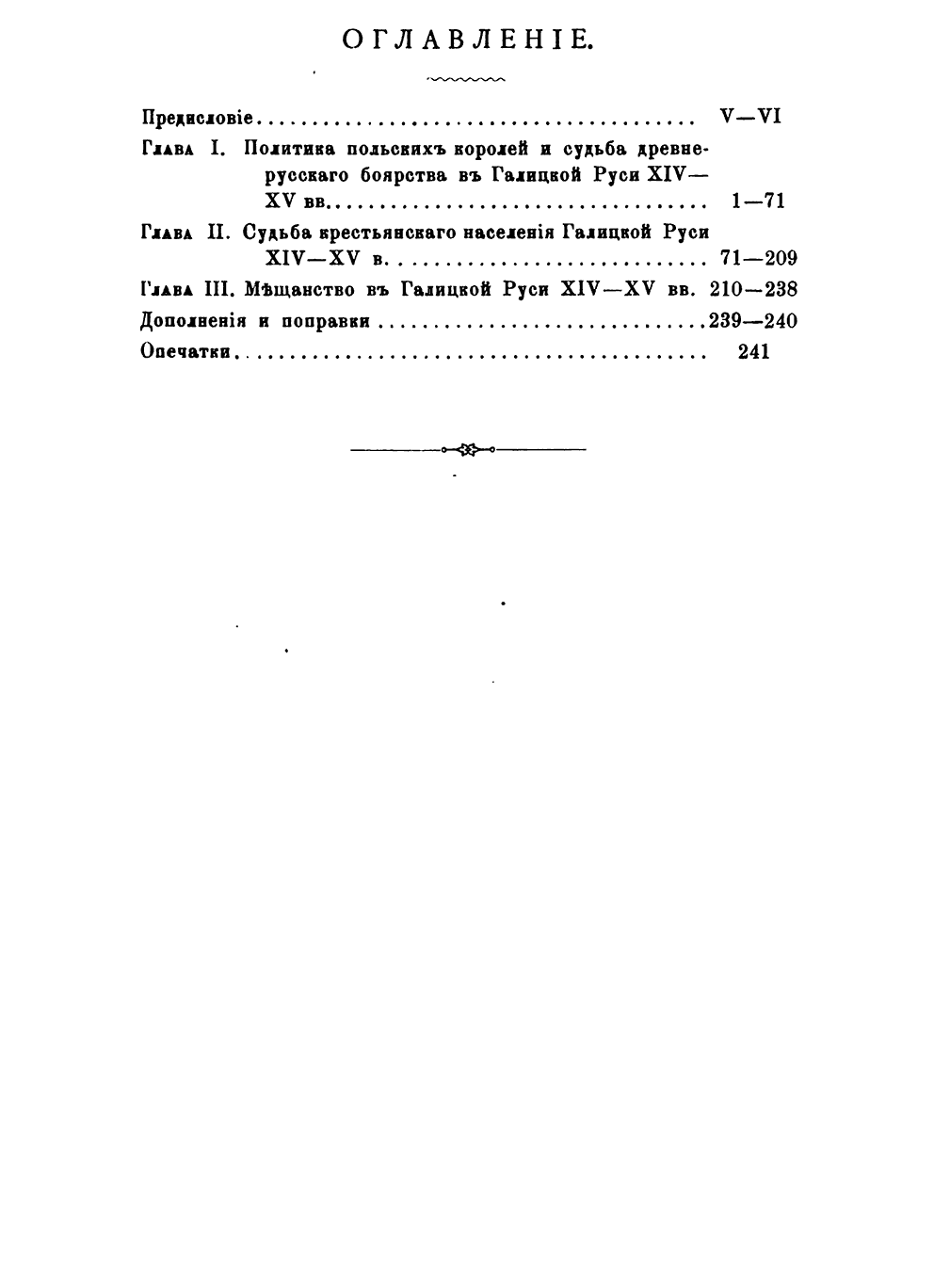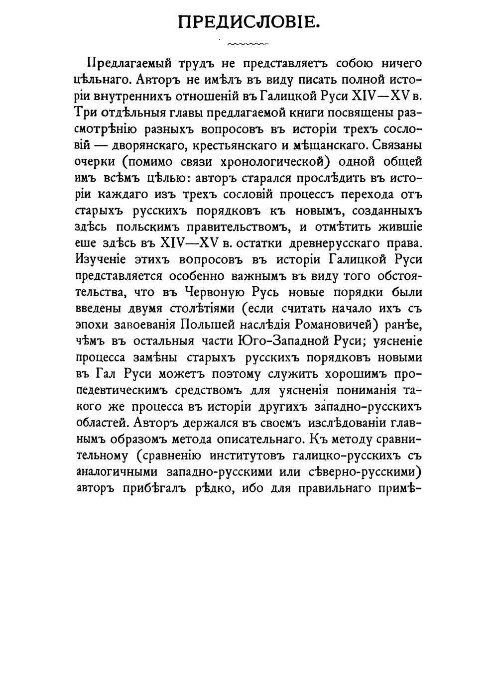 «Предлагаемый труд не представляет собой ничего цельного. Три отдельные главы посвящены рассмотрению разных вопросов в истории трех сословий — дворянского, крестьянского и мещанского. Связаны очерки одной общей им всем целью: автор старался проследить в истории каждого из трех сословий процесс перехода от старых русских порядков к новым, созданным здесь польским правительством, и отметить жившие еще здесь в XIV –XV вв. остатки древнерусского права».