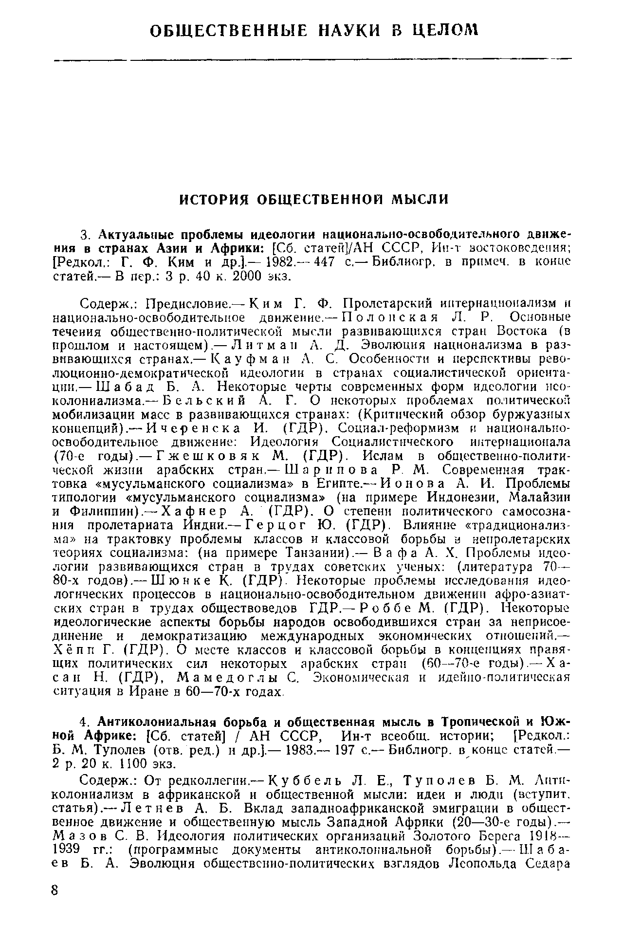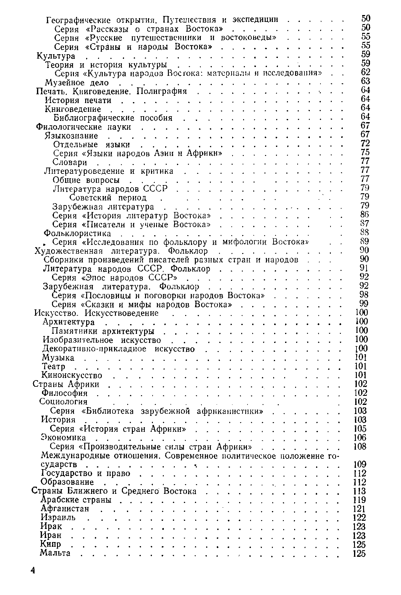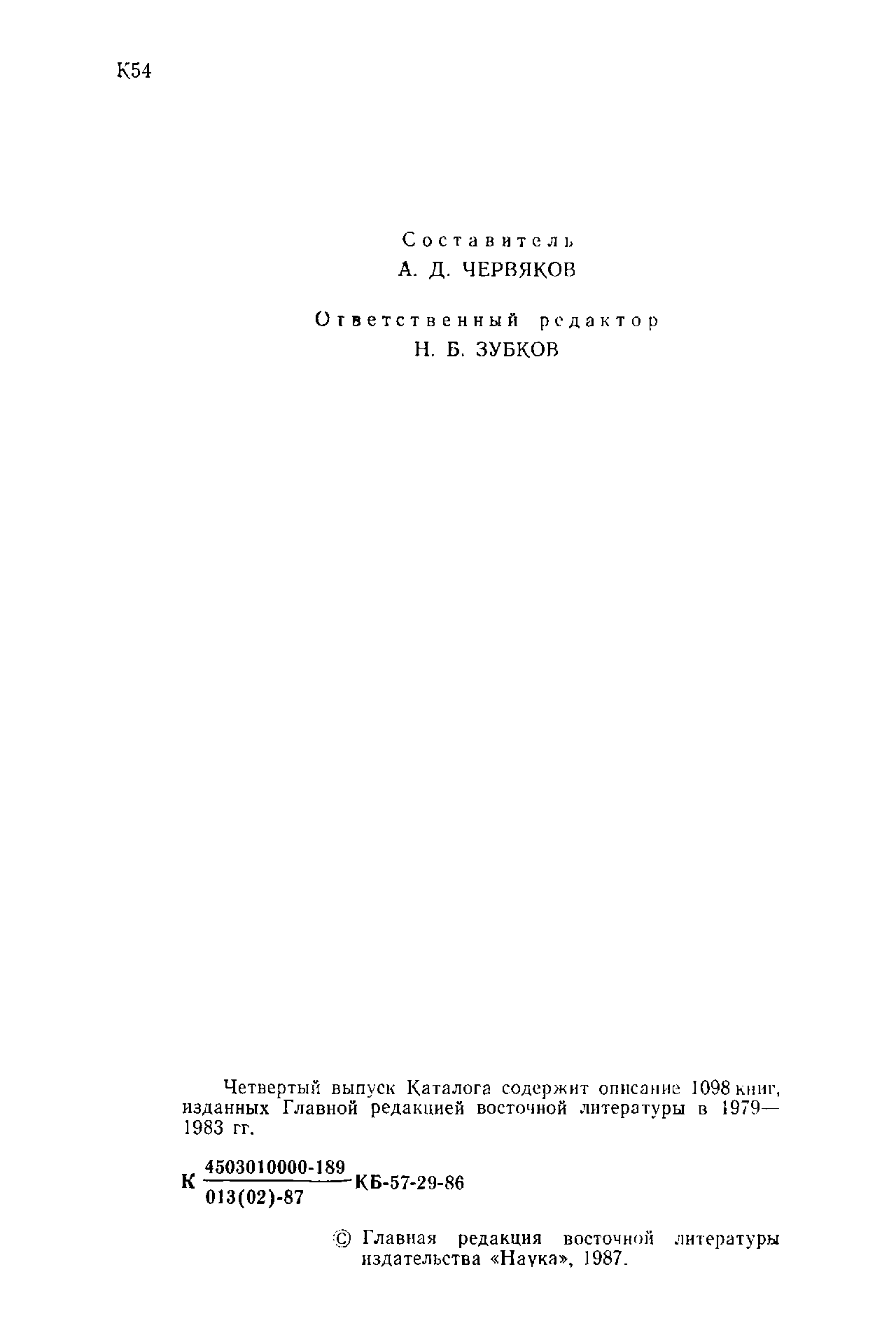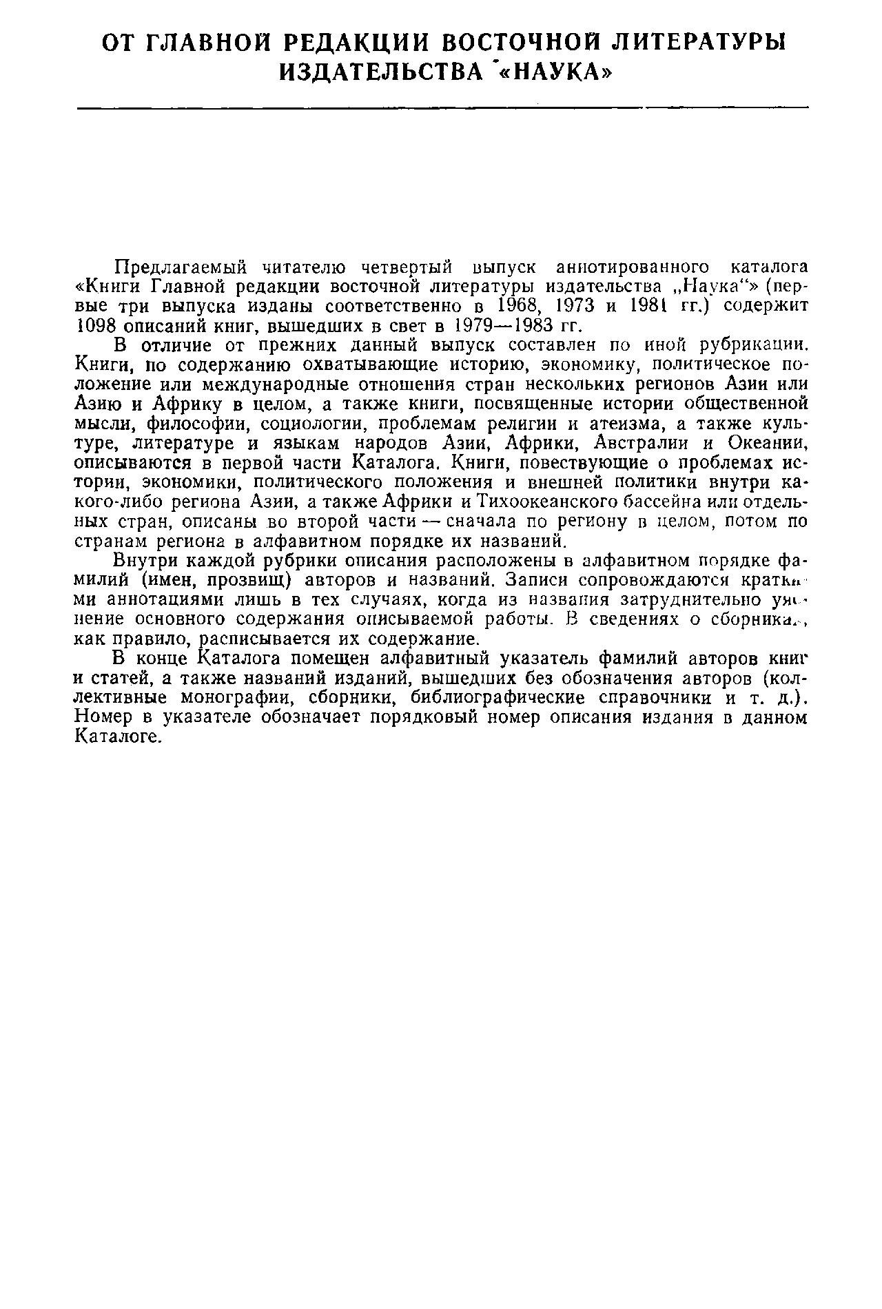 Четвертый выпуск аннотированного каталога "Книги Главной редакции восточной литературы издательства "Наука"" (первые три выпуска изданы соответственно в 1968, 1973, 1981 гг.) содержит 1098 описаний книг, вышедших в свет в 1979 - 1983 гг. В отличие от прежних выпусков данный выпуск составлен по иной рубрикации. Книги, по содержанию охватывающие историю, экономику, политическое положение и международные отношения стран нескольких регионов Азии или Азию и Африку в целом, а также книги, посвященные истории общественной мысли, философии, социологии, проблема религии и атеизма, а также культуре, литературе и языкам народов Азии, Африки, Австралии и Океании, описываются в первой части Каталога. Книги, повествующие о проблемах истории, экономики, политического положения и внешней политики внутри какого-либо региона Азии, а также Африки и Тихоокеанского бассейна или отдельных стран, описаны во второй части - сначала в целом, потом по странам региона в алфавитном порядке их названий.