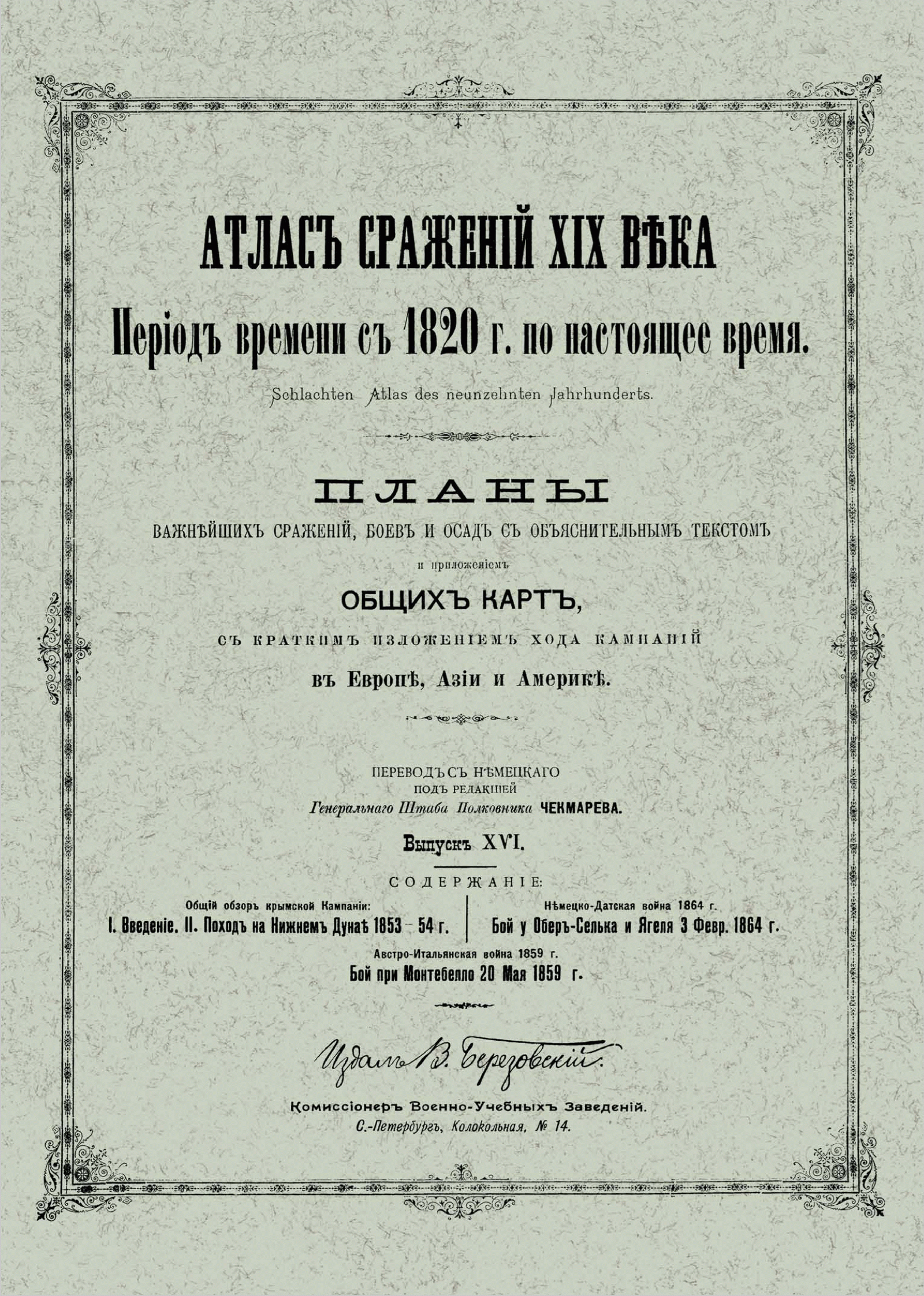 Второе издание «Атласа сражений XIX века» в 20-ти выпусках, представляет собой перевод на русский язык, выпускавшегося в военно-научном комитете Главного штаба на немецком языке с 1830-х гг., разрозненного собрания карт и планов военных кампаний армий мира в XIX века. Переводчиком данного издания является Виктор Иванович Чекмарев (1861–1939) — генерал-лейтенант (1912), видный военный деятель российской императорской армии, историк, участник Первой мировой войны и белого движения на юге России, впоследствии в эмиграции. С 1894 г., занимая должность делопроизводителя, а затем столоначальника канцелярии военно-ученого комитета Главного Штаба, подполковник Генерального Штаба Чекмарев, в результате кропотливой работы собрал воедино «Атлас сражений XIX века», каждый выпуск которого посвящен одной или нескольким военным кампаниям Европы, Азии и Америки, содержит подробное описание расположения войск и хода боевых действий противников, хронологию событий, снабжен картами и планами сражений. Это издание имеет большую историко-культурную ценность, интересно как ученым-историкам, так и любителям военно-исторической литературы.