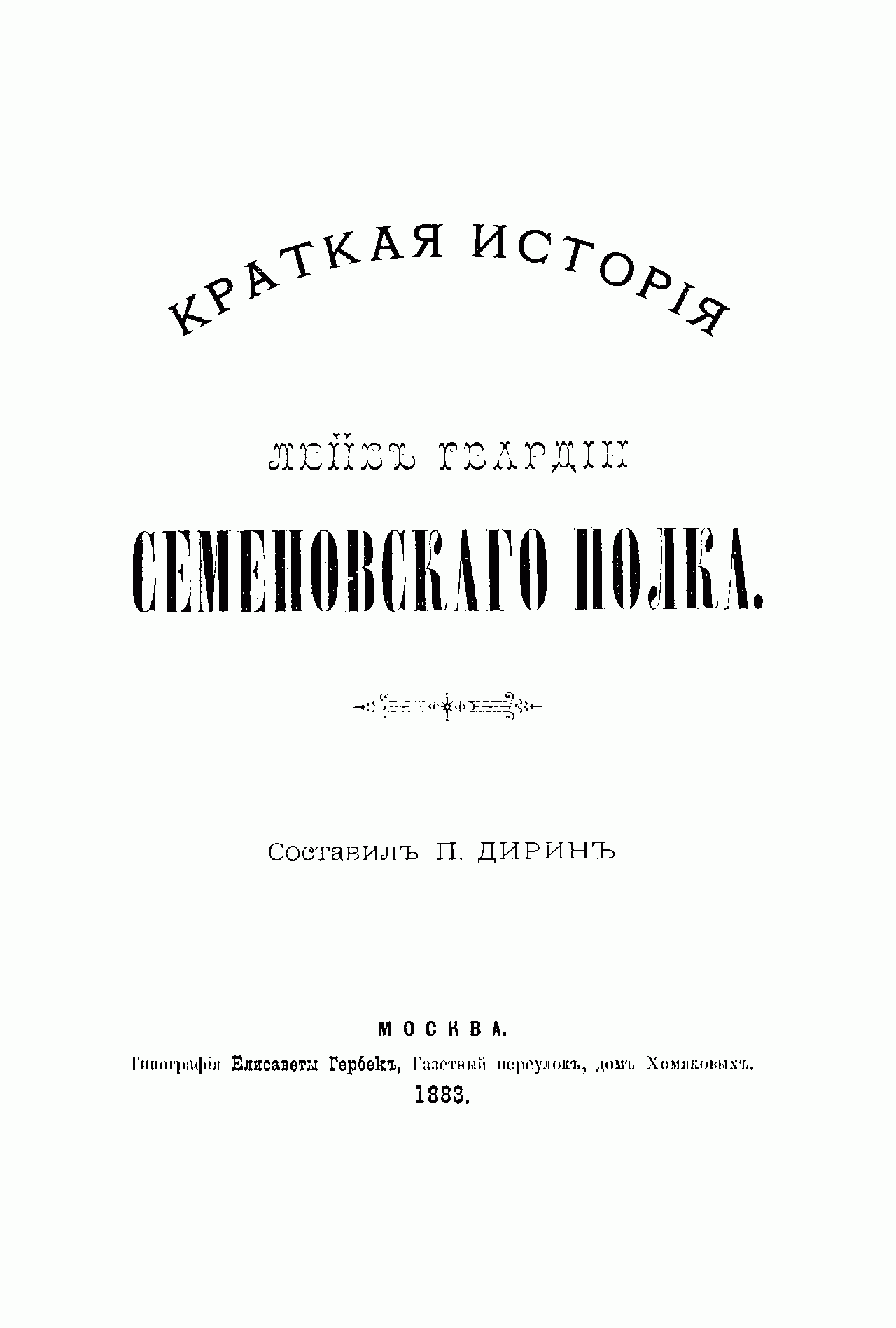 В Санкт-Петербурге в 1883 г. вышло в свет двухтомное издание, посвященное 200-летней годовщине лейб-гвардии Семёновского полка. Как указывалось в предисловии: «Авторам предстояло или продолжать историю полка, напечатанную еще в 1854 году штабс-капитаном П. П. Карцовым и доведенную до царствования императрицы Екатерины II, или составить всю вновь. Авторы остановились на последней мысли…». На основе данного исследования поручиком лейб-гвардии Петром Николаевичем Дириным в Москве в мае 1883 г. была издана краткая полковая история, специально предназначенная для нижних чинов.