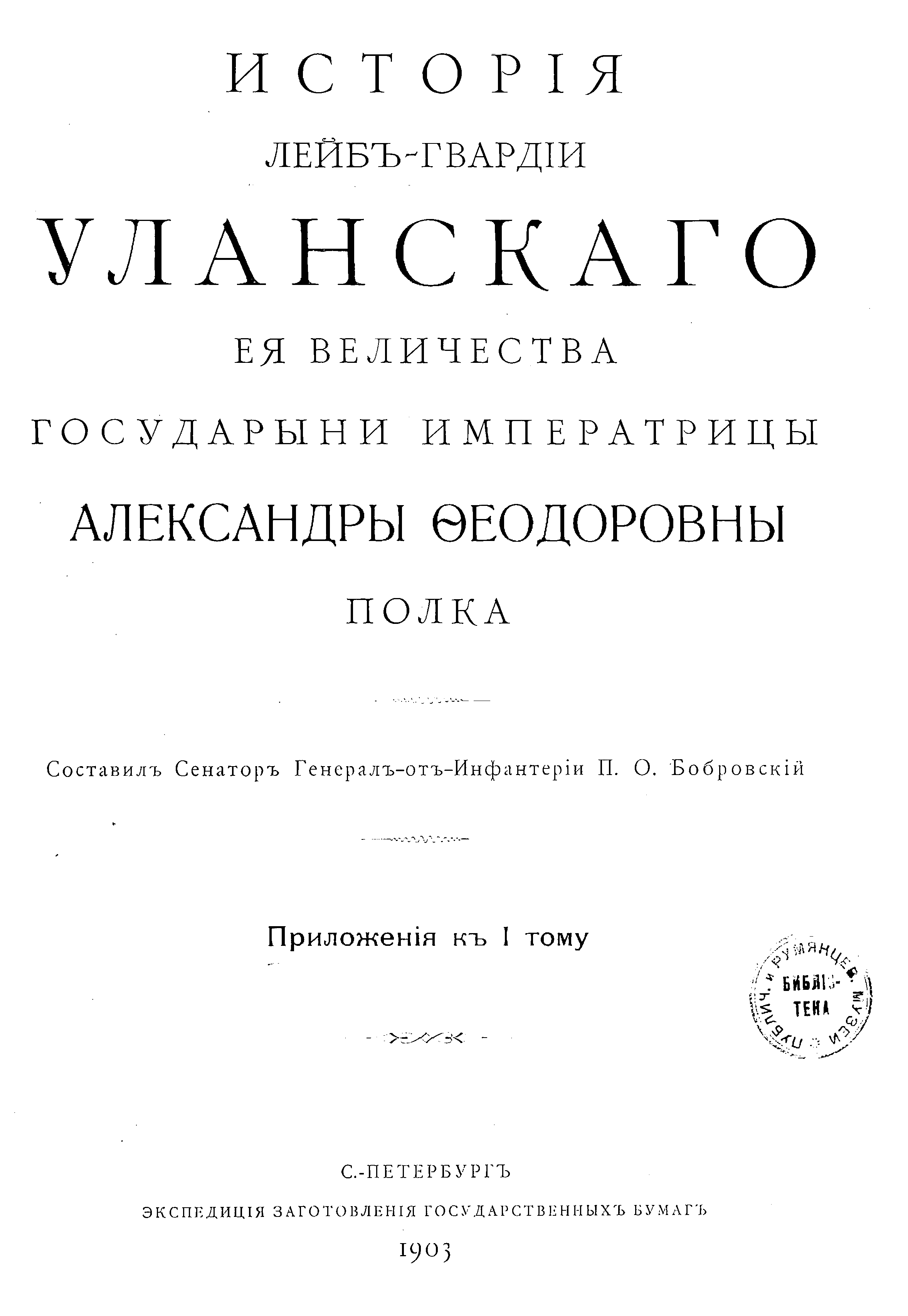 Исторiя Лейбъ-гвардiи Уланскаго Ея Величества Государыни Императрицы Александры ѳедоровны полка. Приложенiя к I тому