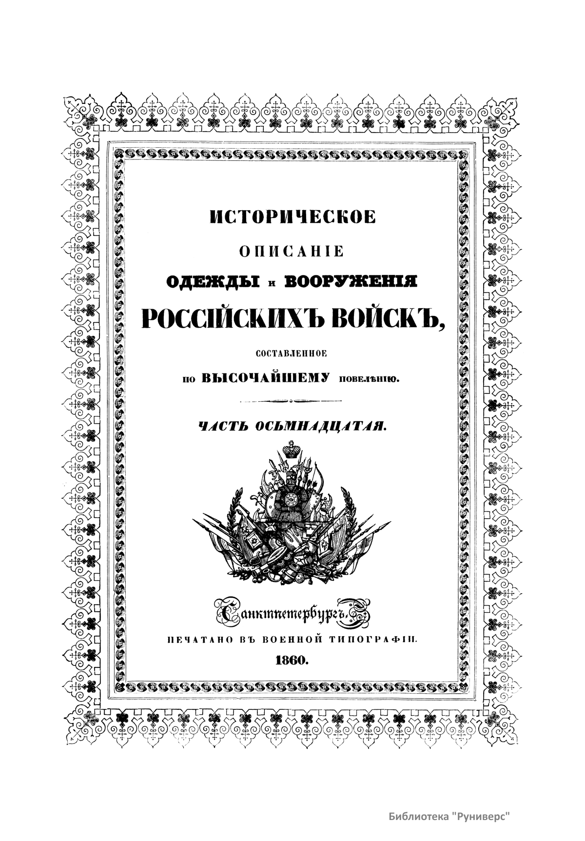 Многотомный труд «Историческое описание одежды и вооружения Российских войск, с рисунками, был составлен по высочайшему повелению» выходил в Санкт-Петербурге в