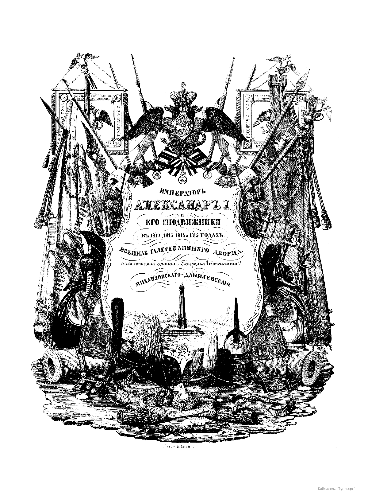 Александр Иванович Михайловский-Данилевский (1790–1848) — участник Отечественной войны 1812 г., генерал-лейтенант, военный историк и академик Санкт-Петербургской академии наук. Автор многих трудов по истории войн Российской империи. В последние годы своей жизни А. И. Михайловский-Данилевский был главным редактором «Военной галереи Зимнего дворца». Война 1812 г. получила название Отечественной и стала ярчайшей страницей российской истории и культуры. В Зимнем дворце столицы император Александр I повелел создать Военную галерею 1812 г. Ни в одном из дворцов Европы не существовало портретной галереи подобной той, что должна была украсить парадную резиденцию русских императоров. В Военной галерее Зимнего дворца должны были разместиться более 300 портретов, для исполнения которых в Петербург весной 1819 г. приехал известный английский живописец Джордж Доу (Даву). В создании портретной галереи принимали участие и русские художники — В. А. Голике, А. В. Поляков. Торжественное открытие галереи состоялось уже в царствование Николая I, в годовщину изгнания французов из России, 25 декабря 1826 г. Шеститомное издание «Император Александр I и его сподвижники в 1812, 1813, 1814 и 1815 гг.: Военная галерея Зимнего дворца, издаваемая с высочайшего соизволения» выходило на протяжении 1845–1849 гг. в петербургской типографии Карла Крайя. Издание объединило портреты и биографии российских генералов, участвовавших в Отечественной войне и заграничных походах. Главным редактором, а также составителем многих биографий стал А. И. Михайловский-Данилевский. Портреты с живописных оригиналов были гравированы на стали парижскими художниками Гюо и Долле. На страницах издания почетное место отведено императору Александру I, представлены биографии и портреты М. И. Кутузова, М. Б. Барклая-де-Толли, вел. кн. Константина Павловича, А. А. Аракчеева, П. П. Коновницына, Д. П. Немировского, Д. С. Дохтурова, П. И. Багратиона, Н. Н. Раевского, А. П. Ермолова, М. И. Платова и многих других героев. Труд А. И. Михайловского-Данилевского содержит обширный документальный и мемуарный материал, представляет подробное описание и анализ военных действий России и Франции на протяжении Отечественной войны 1812 г.