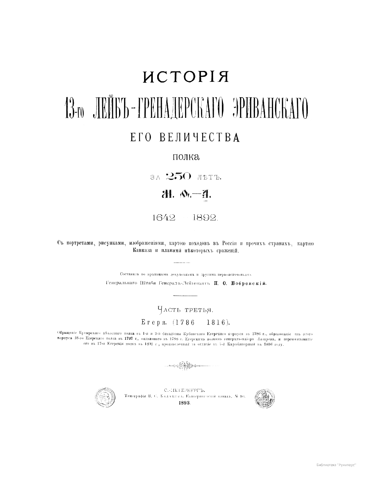 В 1892 году в Санкт-Петербурге вышло в свет пятитомное издание Генерального Штаба генерал-лейтенанта Павла Осиповича Бобровского, посвященное 250-летию 13-го лейб-гренадерского Эриванского eго величества полка – старейшего из регулярных полков российской армии.