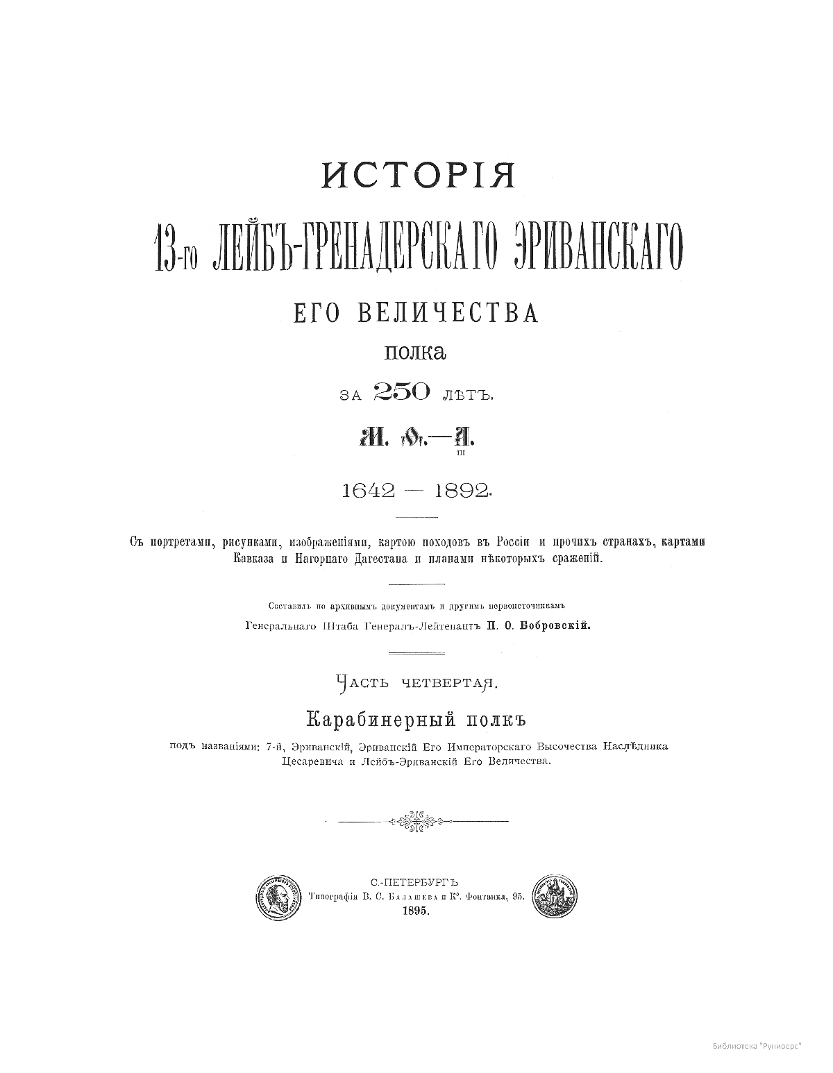 В 1892 году в Санкт-Петербурге вышло в свет пятитомное издание Генерального Штаба генерал-лейтенанта Павла Осиповича Бобровского, посвященное 250-летию 13-го лейб-гренадерского Эриванского eго величества полка – старейшего из регулярных полков российской армии.