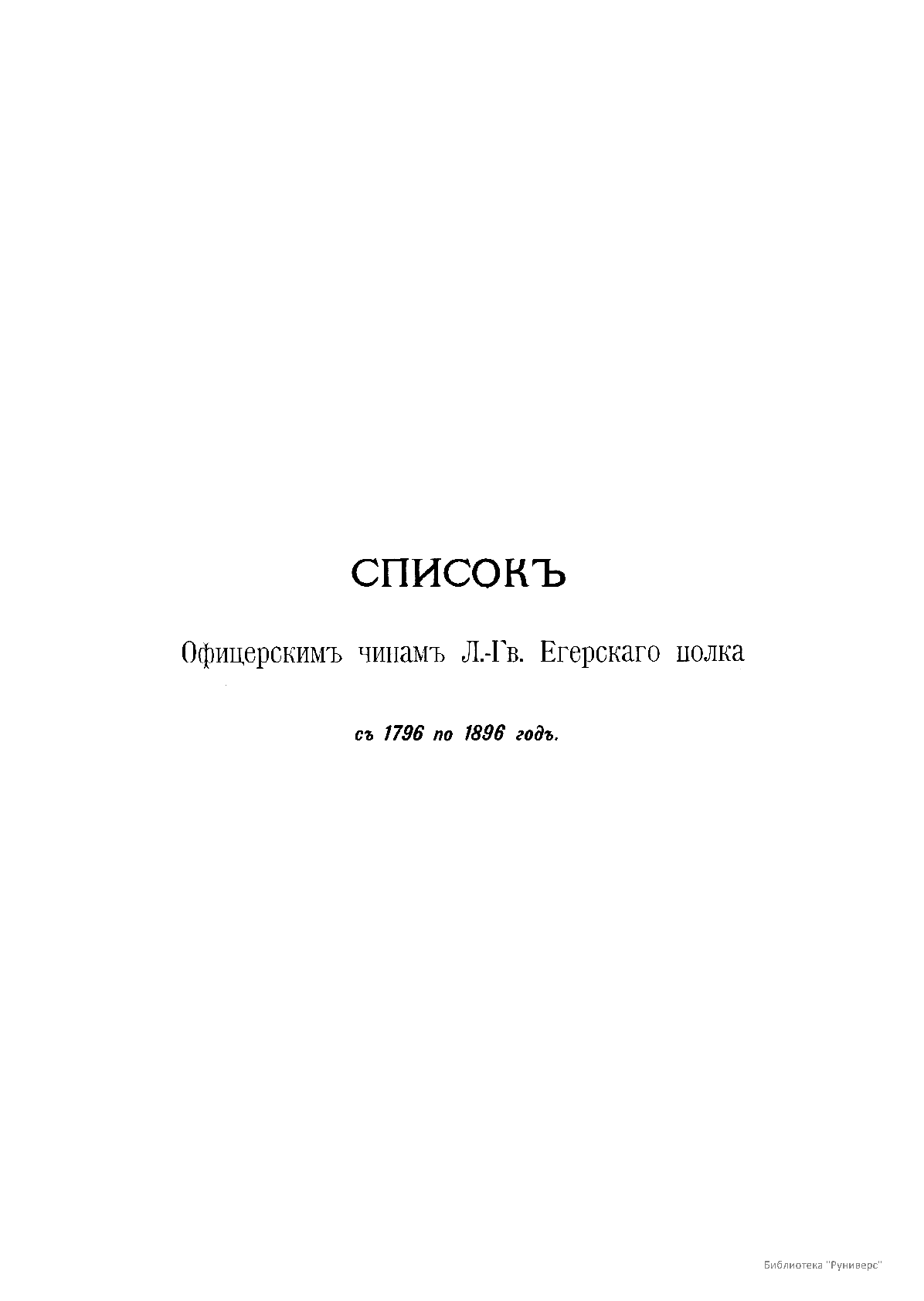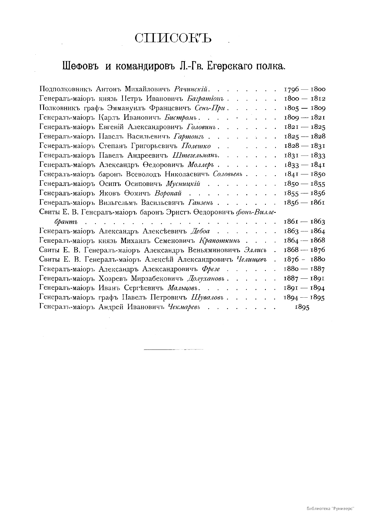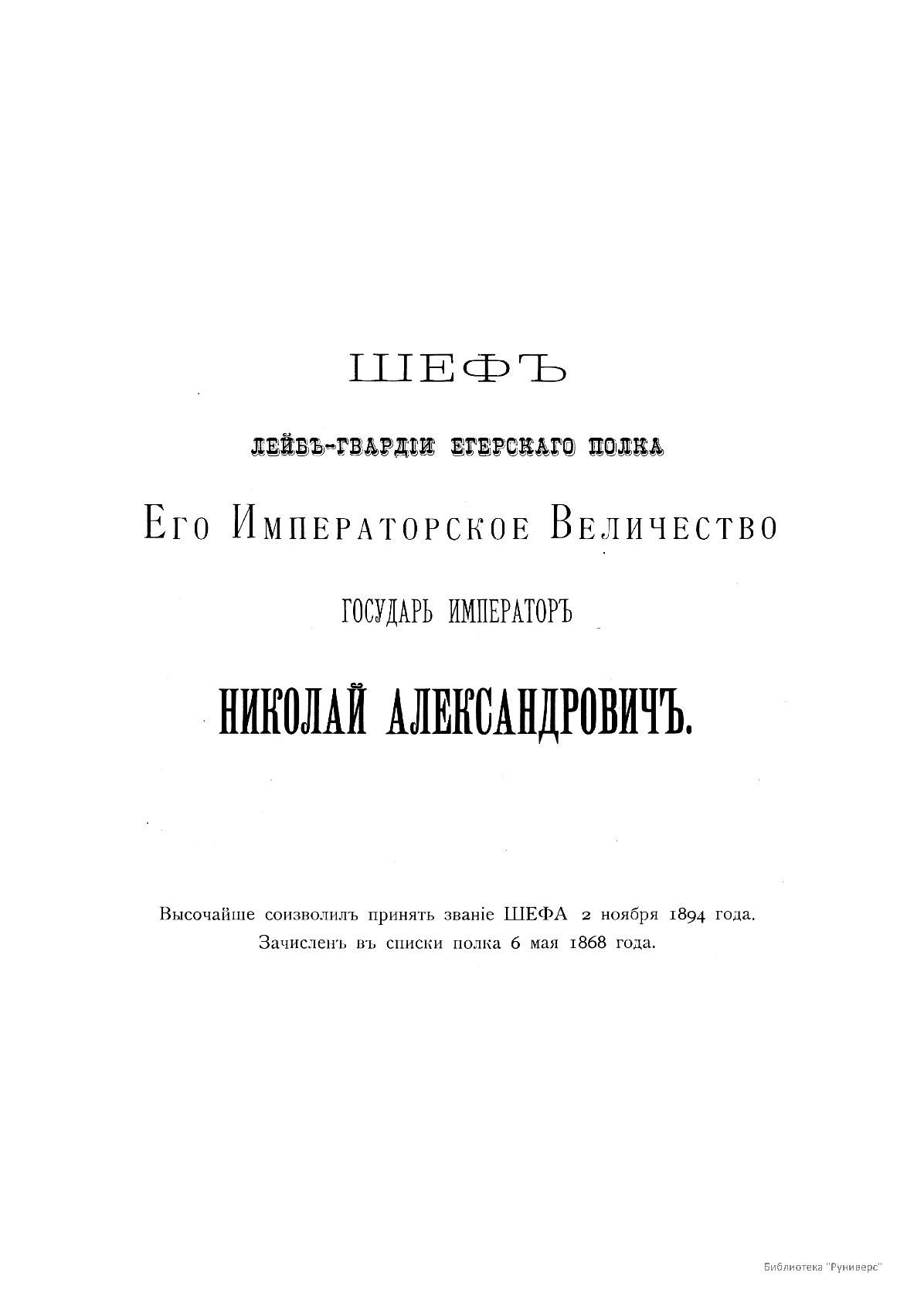 В 1896 г. вышло в свет двухтомное юбилейное издание «История лейб-гвардии Егерского полка за сто лет: 1796–1896», составленное офицерами полка на основании архивных документов, статей из периодических изданий и мемуаров.