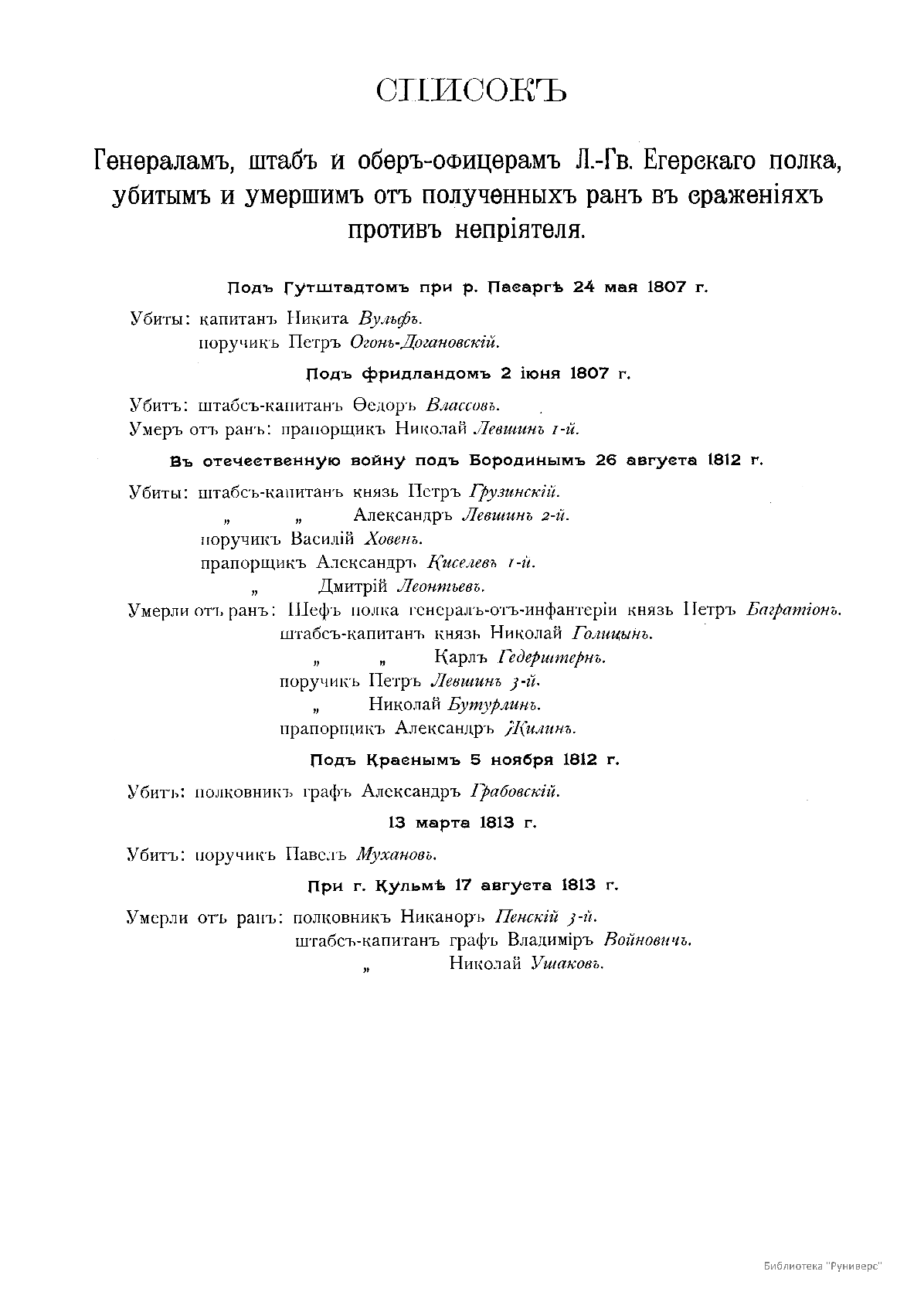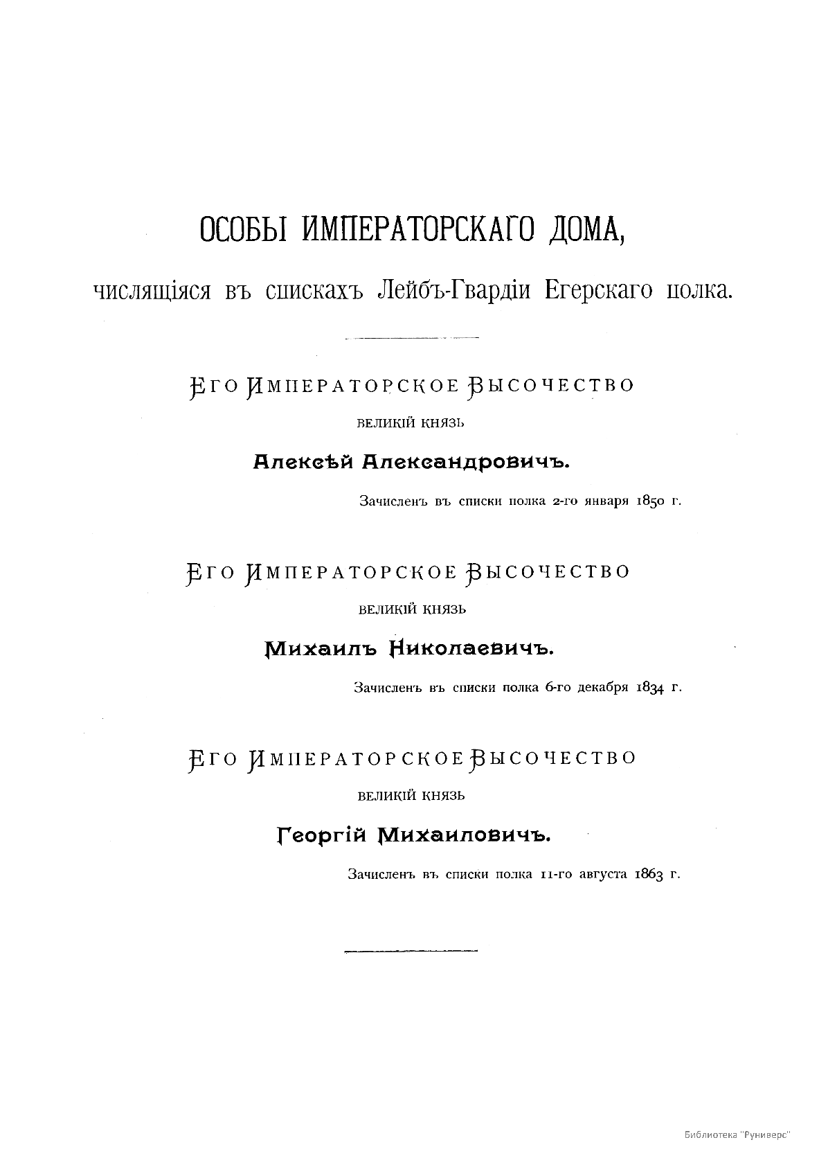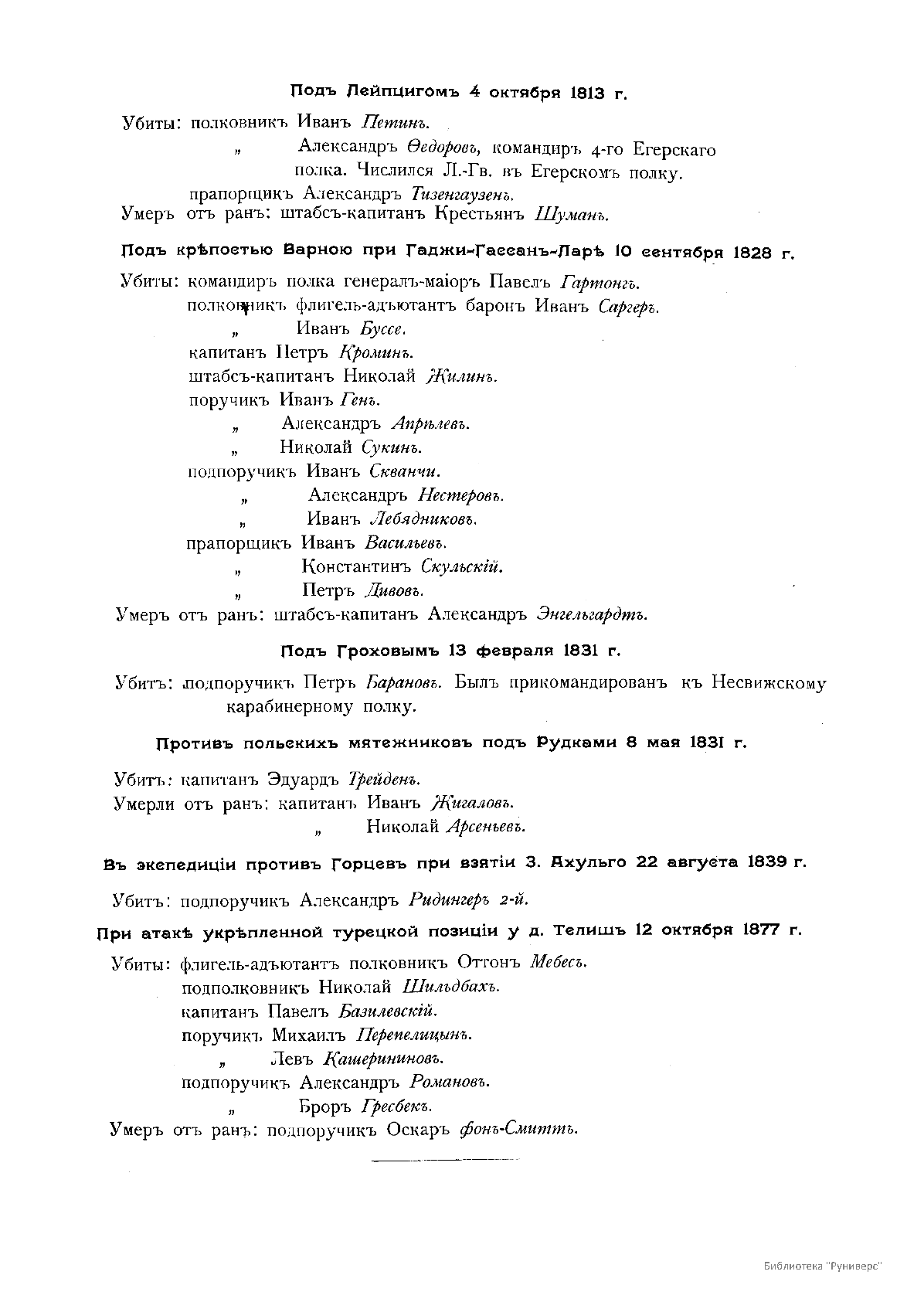 В 1896 г. вышло в свет двухтомное юбилейное издание «История лейб-гвардии Егерского полка за сто лет: 1796–1896», составленное офицерами полка на основании архивных документов, статей из периодических изданий и мемуаров.