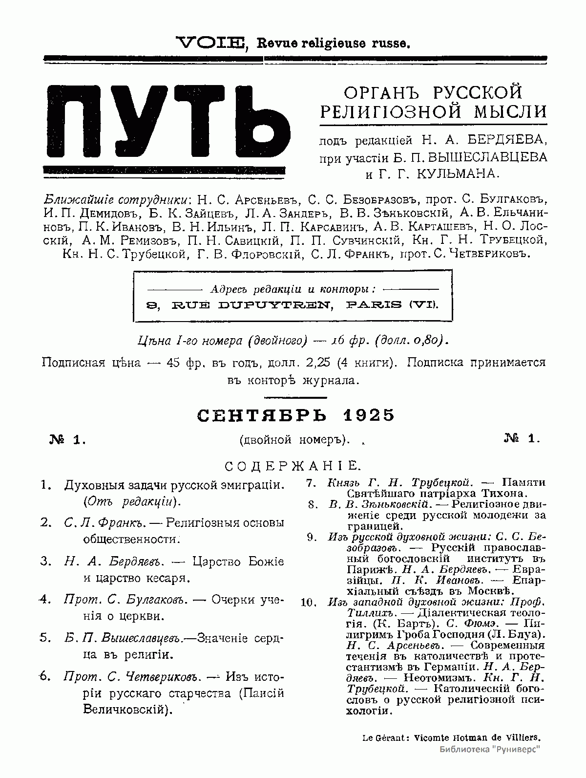 Журнал «Путь» был изданием Религиозно-Философской академии (Париж), его редактором и вдохновителем был