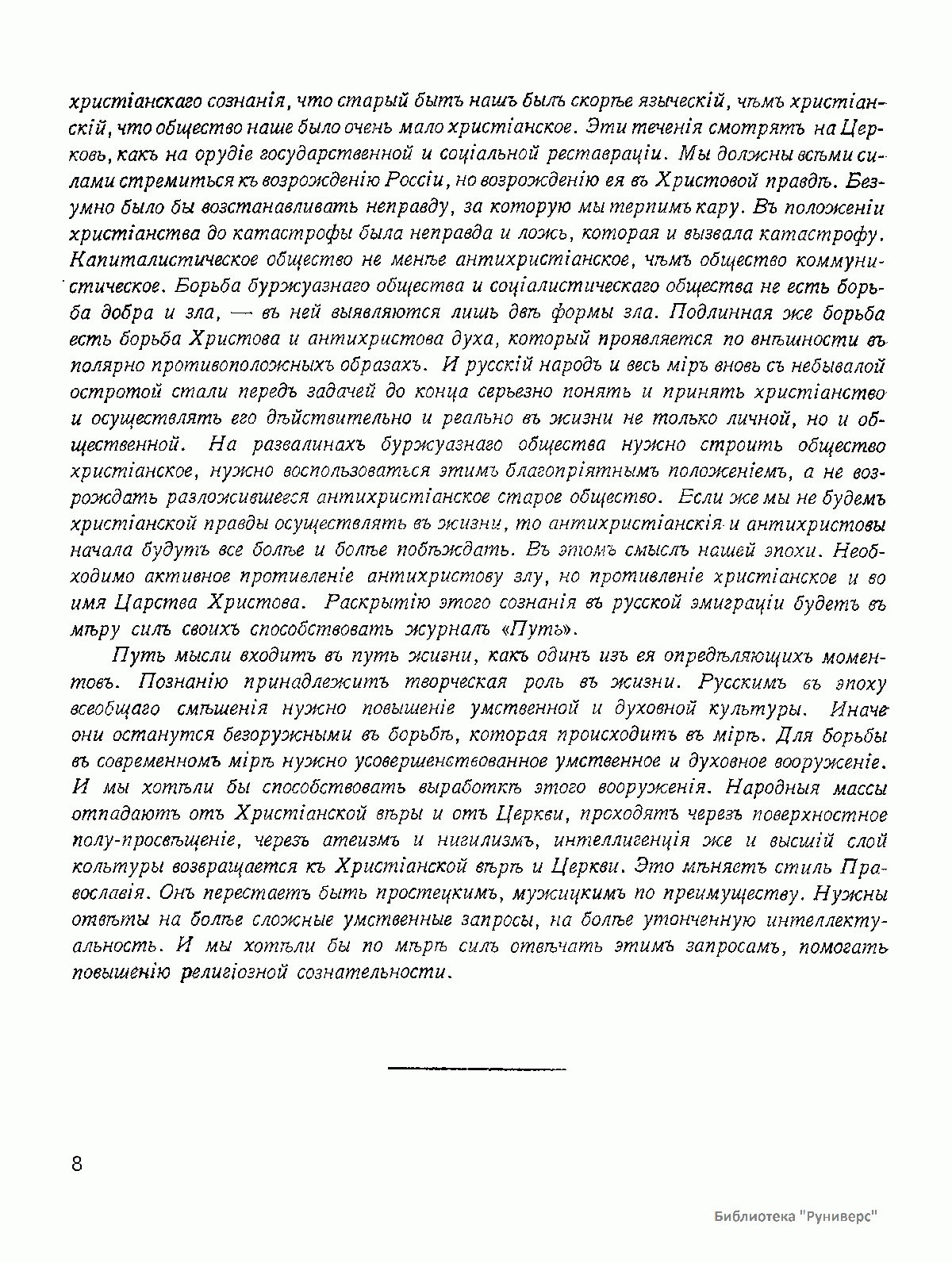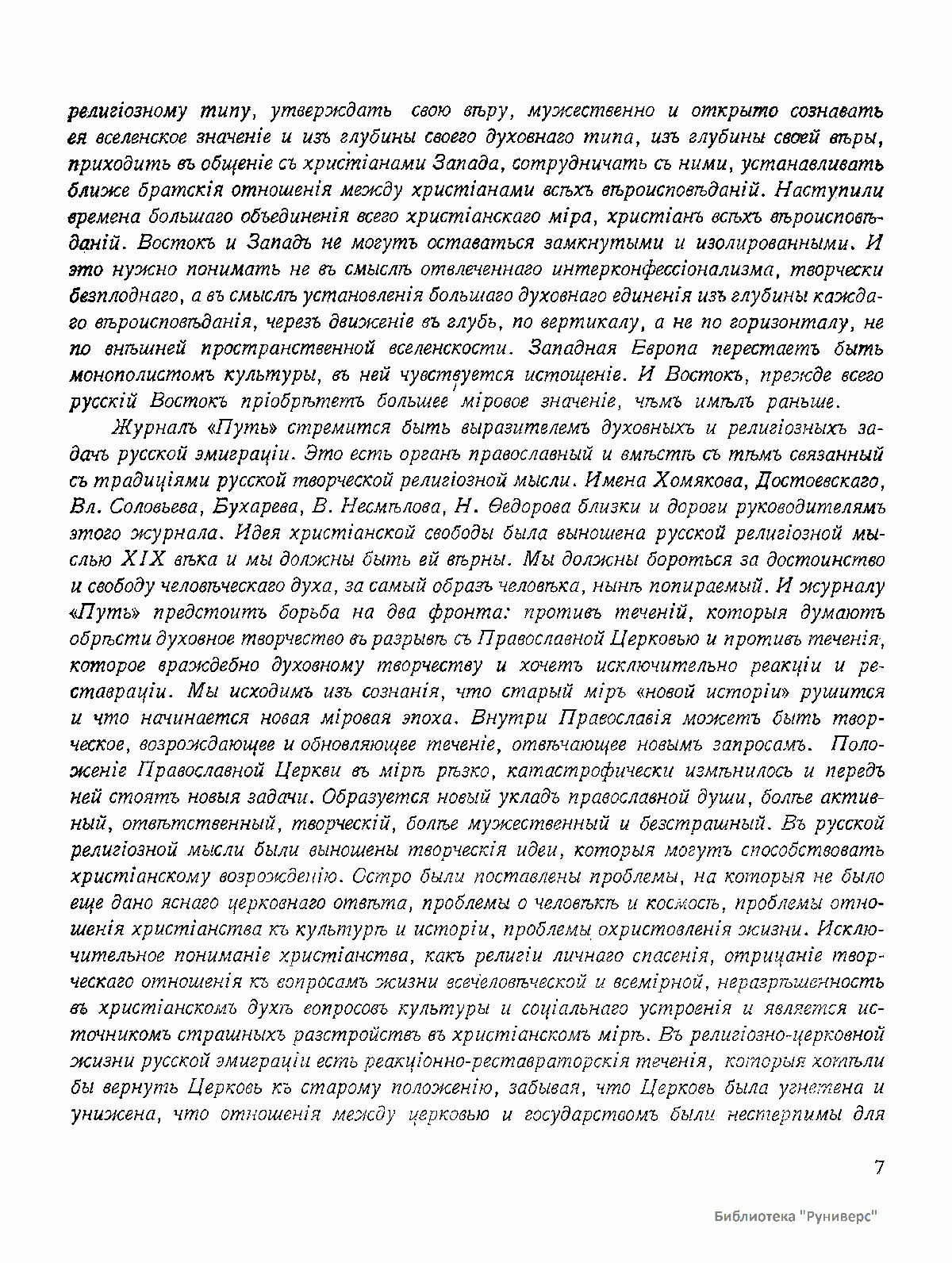 «Путь: Орган русской религиозной мысли» – журнал, издававшийся в Париже с сентября 1925 г. по март 1940 г., собравший на своих страницах все философские и богословские силы русской эмиграции. В редакционной статье «Духовные задачи русской эмиграции» («Путь», № 1. Сентябрь 1925 г.) отмечалось, что журнал ставит своей целью сохранение преемственности в процессе существования русской духовной культуры, а также стремится к преодолению сформировавшейся к тому времени эмигрантской психологии, сильно политизированной и противоречивой в своем отношении к Русской Православной Церкви и Советской России, что создавало угрозу раскола русской эмиграции.