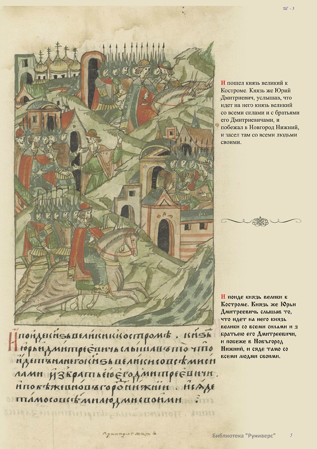 Лицевой летописный свод. XVI века — монументальный памятник древнерусского книжного искусства. На 10 тысячах листов с более чем 17 тысячами красочных миниатюр — «окон в историю» — представлена самая ранняя историческая и литературная энциклопедия. Лицевой свод дошел до наших дней в 10 томах, находящихся в разных древлехранилищах: БАН к РНБ в Санкт-Петербурге и ГИМ в Москве. Фирма «АКТЕОН» совместно с хранителями впервые осуществила научное факсимильное издание «Лицевой летописный свод XVI века». Предлагаемое издание с переводом — как дополнение в рамках научного аппарата вышеназванного факсимиле - представлено тремя разделами: библейская история, всемирная история, русская летописная история. В настоящем издании листы расположены в хронологическом порядке повествования На внешнем поле размещены транслитерация и перевод на современный русский язык. Русская летописная история 1114—1567 гг. — отражена на 6010 Лицевого летописного свода XVI века в следующих его томах: Г — Голицынский том (Отдел рукописей Российский национальной библиотеки, F.IV.225), Л — Лаптевский TOM (Отдел рукописей Российской национальной библиотеки, F.IV.233), O-I — Остермановский первый том (Отдел рукописей Библиотеки Академии наук, 31. 7. 30-1), O-II — Остермановский второй той (Отдел рукописей Библиотеки Академии наук, 31, 7. 30-2), Ш — Шумиловский том (Отдел рукописей Российской национальной библиотеки, F, IY. 232), С — Синодальный том (Отдел рукописей Государственного Исторического музея. Син. № 962), Ц— Царственная книга (Отдел рукописей Государственного Историческою музея. Син. № 149). В сносках отряжены разночтения с перепей ПСРЛ — Полным собранием русских летописей - фундаментальной для изучения истории древней и средневековой Руси книжной серией (её тексты, в основном, издавались наборно, в орфографии XIX века).