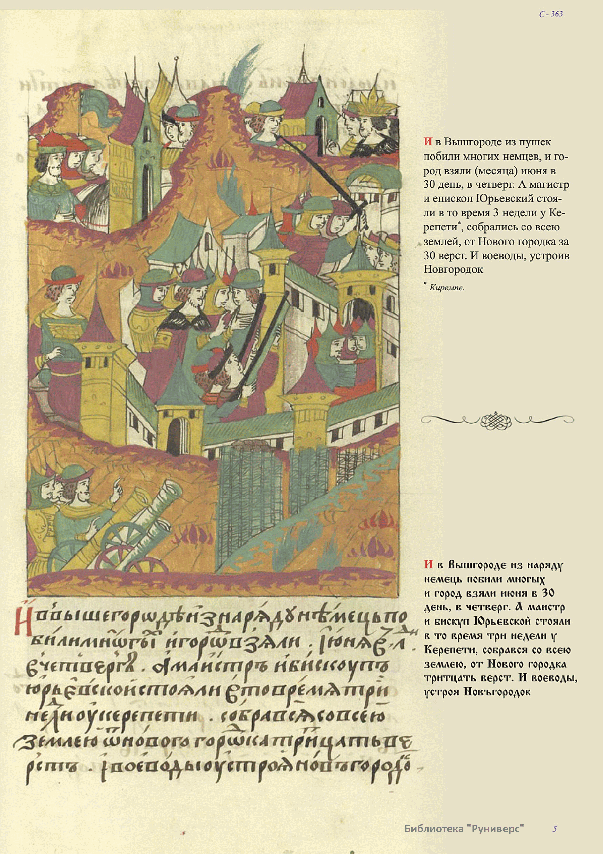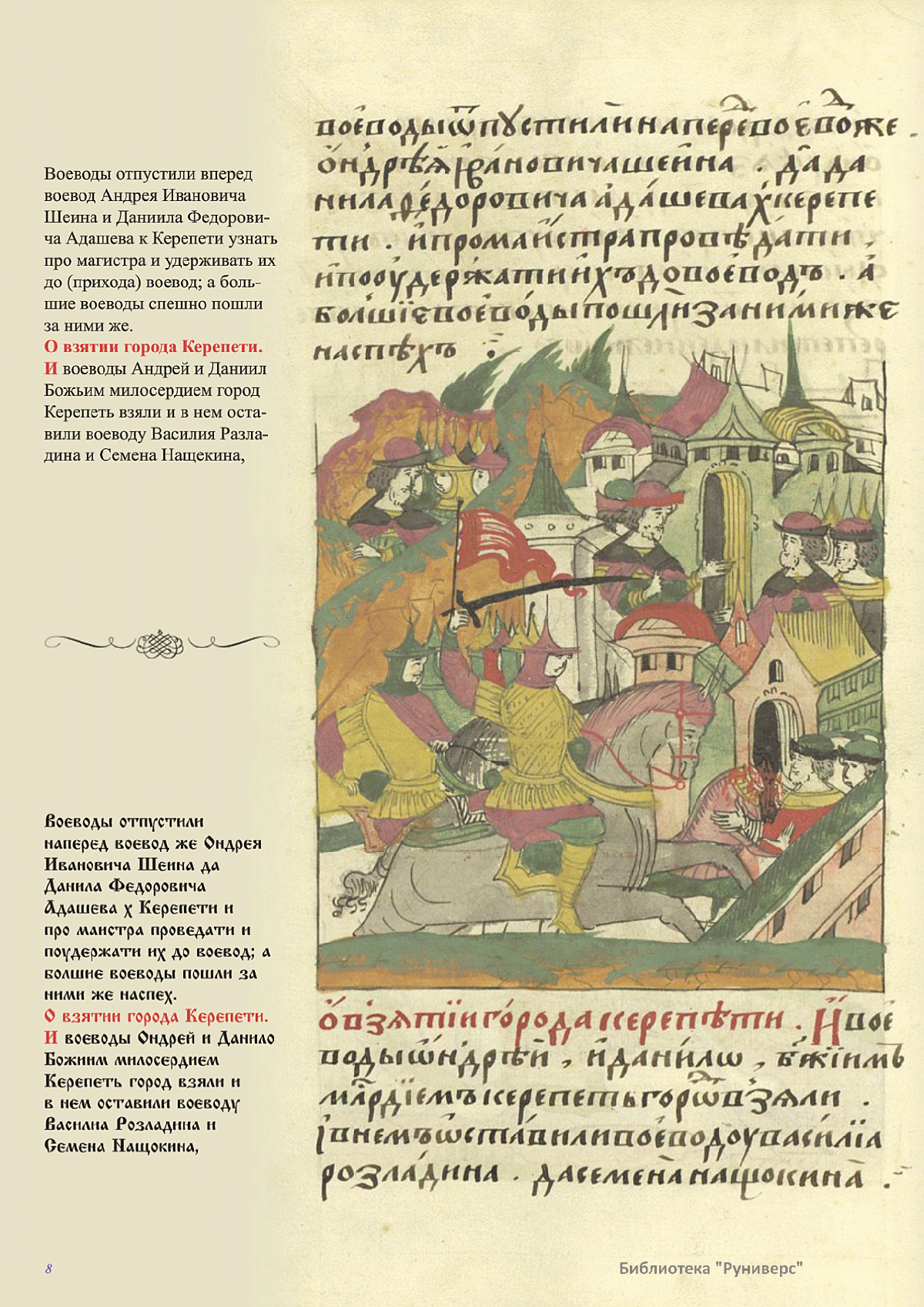 Лицевой летописный свод. XVI века — монументальный памятник древнерусского книжного искусства. На 10 тысячах листов с более чем 17 тысячами красочных миниатюр — «окон в историю» — представлена самая ранняя историческая и литературная энциклопедия. Лицевой свод дошел до наших дней в 10 томах, находящихся в разных древлехранилищах: БАН к РНБ в Санкт-Петербурге и ГИМ в Москве. Фирма «АКТЕОН» совместно с хранителями впервые осуществила научное факсимильное издание «Лицевой летописный свод XVI века». Предлагаемое издание с переводом — как дополнение в рамках научного аппарата вышеназванного факсимиле - представлено тремя разделами: библейская история, всемирная история, русская летописная история. В настоящем издании листы расположены в хронологическом порядке повествования На внешнем поле размещены транслитерация и перевод на современный русский язык. Русская летописная история 1114—1567 гг. — отражена на 6010 Лицевого летописного свода XVI века в следующих его томах: Г — Голицынский том (Отдел рукописей Российский национальной библиотеки, F.IV.225), Л — Лаптевский TOM (Отдел рукописей Российской национальной библиотеки, F.IV.233), O-I — Остермановский первый том (Отдел рукописей Библиотеки Академии наук, 31. 7. 30-1), O-II — Остермановский второй той (Отдел рукописей Библиотеки Академии наук, 31, 7. 30-2), Ш — Шумиловский том (Отдел рукописей Российской национальной библиотеки, F, IY. 232), С — Синодальный том (Отдел рукописей Государственного Исторического музея. Син. № 962), Ц— Царственная книга (Отдел рукописей Государственного Историческою музея. Син. № 149). В сносках отряжены разночтения с перепей ПСРЛ — Полным собранием русских летописей - фундаментальной для изучения истории древней и средневековой Руси книжной серией (её тексты, в основном, издавались наборно, в орфографии XIX века).