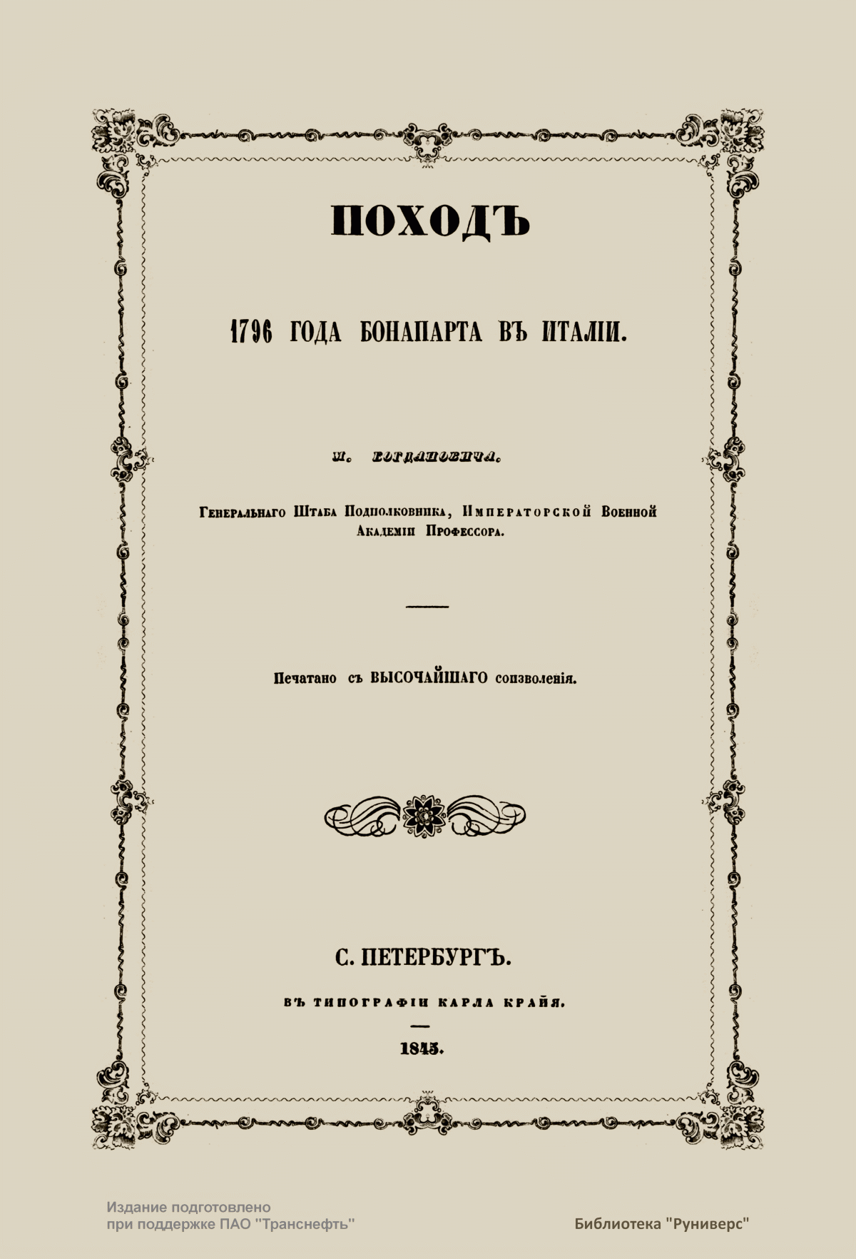 Подвиги великого полководца Бонапарта были увековечены в книгах и полотнах, его воззвания общепризнанны за образцы высокого военного красноречия. «Поход 1796 года Бонапарта в Италии» — первое сочинение подполковника, профессора Императорской военной академии М. И. Богдановича. Книга выпущена в 1845 г. в Санкт-Петербурге. Труд представляет собой критический обзор боевых действий в Италии во время войны 1796–1797 гг. Франции с первой коалицией европейских держав (Австрия, Великобритания, Россия, Сардиния, Королевство обеих Сицилий и др.). Он составлен на основе произведений известнейших военных писателей Г. В. Жомини, К. Клаузевица, мемуаров Наполеона и др. Здесь рассмотрена талантливая стратегия и тактика генерала Наполеона Бонапарта, под командованием которого французские войска выигрывали сражения с превосходящими силами австро-сардинских войск. К историческому описанию военных действий приложены пять карт и планов местностей, напечатанные на одном складном листе, и отдельно — «Карта Северной Италии». Повествование дополнено кратким очерком похода 1797 г. до заключения перемирия в Леобене.