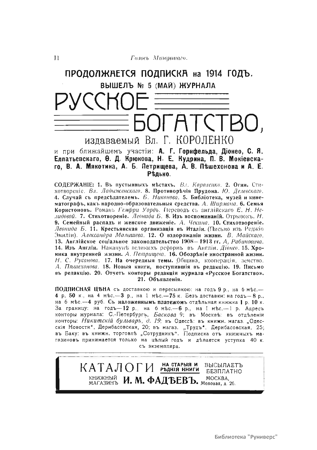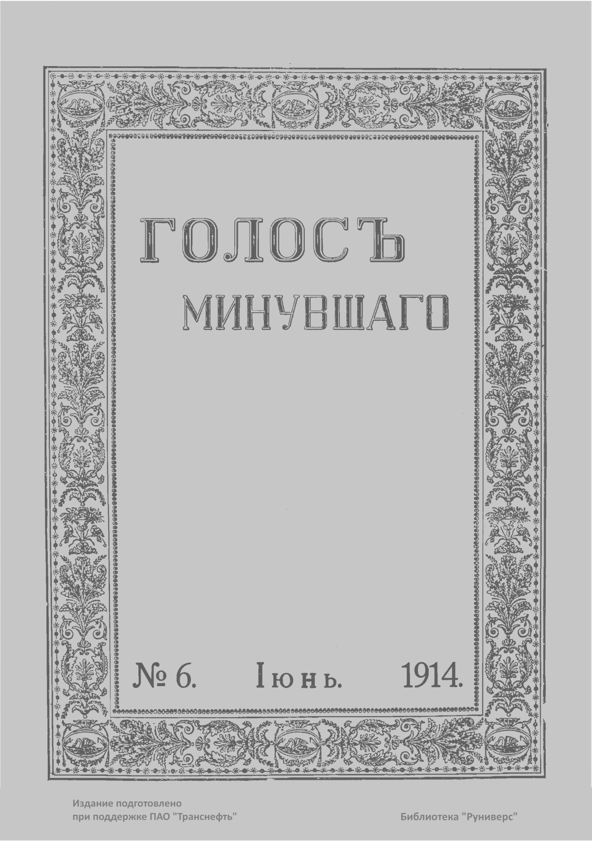 «Голос Минувшего» — журнал истории и истории литературы либерально-народнического направления, издававшийся в Москве с 1913 по 1923 год. Издателем журнала в 1913–1922 годах были известные русские историки, публицисты и общественные деятели С. П. Мельгунов (1880–1956) и В. И. Семевский (1848–1916). В редакционную коллегию также входили А. К. Дживелегов и П. Н. Сакулин. До 1919 «Голос минувшего» выходил ежемесячно, затем нерегулярно, всего было выпущено 65 номеров. В журнале публиковались интереснейшие материалы, посвященные истории литературы и общественных движений в России второй половины XVIII – начала XX веков. Здесь можно найти: статьи по вопросам русской и всеобщей истории, истории литературы, философии, искусства и археологии. В издании представлены: историческая беллетристика, биографии русских и иностранных деятелей, критика и библиография, новости русской и иностранной науки, обзор журналов русских и иностранных, хроника, мемуары, записки, дневники и письма декабристов, видных народовольцев и эсеров, крупных общественных деятелей и царских администраторов, писателей, военачальников и др. Среди авторов: Е. В. Тарле, А. Ф. Кони, А. К. Дживелегов, А. А. Кизеветтер, В. Г. Короленко и др. Стремление сделать журнал интересным для более широкого круга читателей способствовало тому, что в «Голосе Минувшего», хоть и в ограниченном количестве, печатались статьи по истории искусства и помещались иллюстрации: портреты, картины и рисунки, не знакомые или мало знакомые публике. В журнале опубликован целый ряд интересных писем, документов и воспоминаний. Абсолютное большинство текстов никогда не переиздавалось. Журнал снабжен указателями имен за 1913–1922 годы и систематическим указателем содержания.