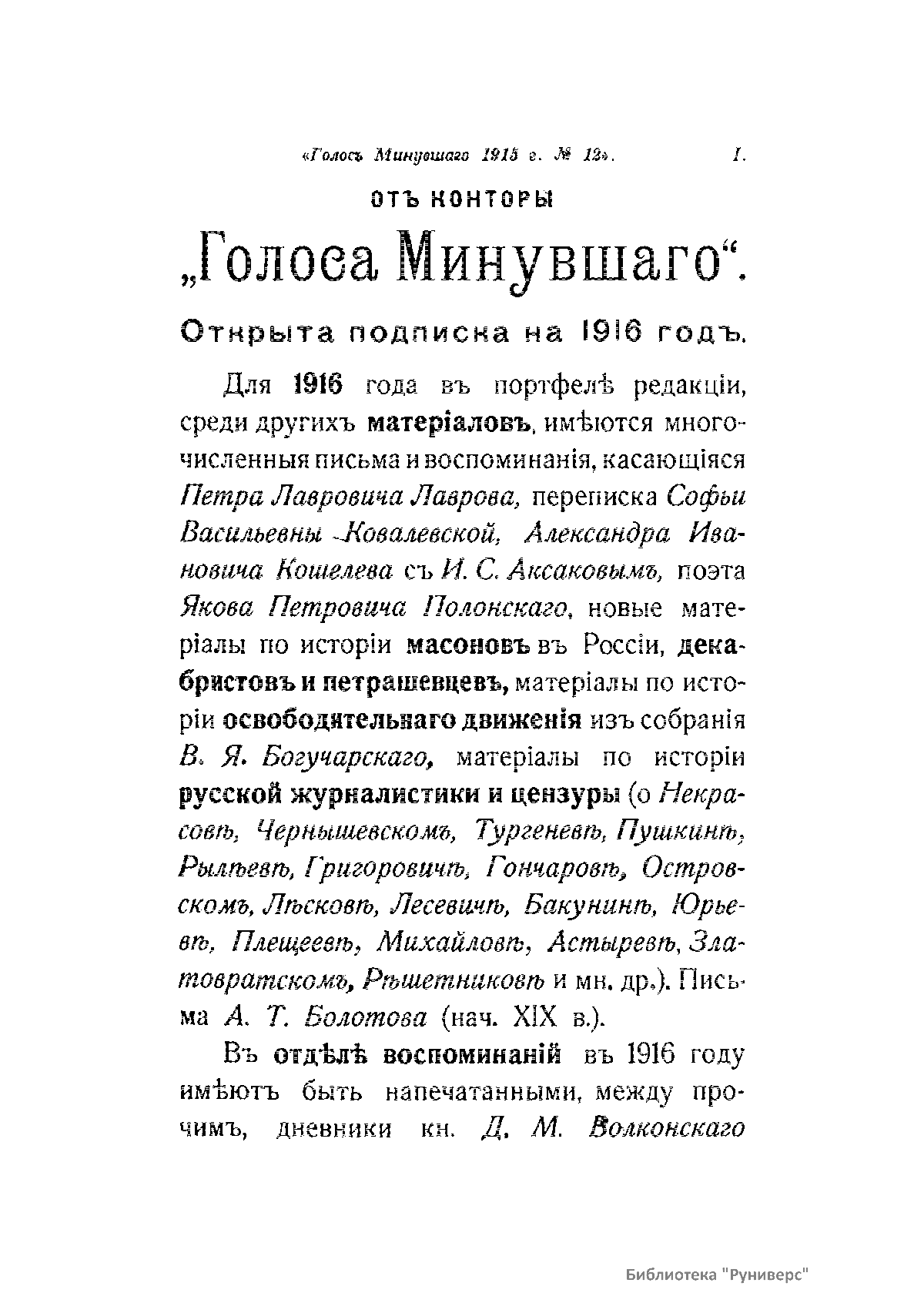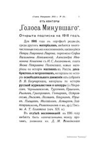 «Голос Минувшего» — журнал истории и истории литературы либерально-народнического направления, издававшийся в Москве с 1913 по 1923 год. Издателем журнала в 1913–1922 годах были известные русские историки, публицисты и общественные деятели С. П. Мельгунов (1880–1956) и В. И. Семевский (1848–1916). В редакционную коллегию также входили А. К. Дживелегов и П. Н. Сакулин. До 1919 «Голос минувшего» выходил ежемесячно, затем нерегулярно, всего было выпущено 65 номеров. В журнале публиковались интереснейшие материалы, посвященные истории литературы и общественных движений в России второй половины XVIII – начала XX веков. Здесь можно найти: статьи по вопросам русской и всеобщей истории, истории литературы, философии, искусства и археологии. В издании представлены: историческая беллетристика, биографии русских и иностранных деятелей, критика и библиография, новости русской и иностранной науки, обзор журналов русских и иностранных, хроника, мемуары, записки, дневники и письма декабристов, видных народовольцев и эсеров, крупных общественных деятелей и царских администраторов, писателей, военачальников и др. Среди авторов: Е. В. Тарле, А. Ф. Кони, А. К. Дживелегов, А. А. Кизеветтер, В. Г. Короленко и др. Стремление сделать журнал интересным для более широкого круга читателей способствовало тому, что в «Голосе Минувшего», хоть и в ограниченном количестве, печатались статьи по истории искусства и помещались иллюстрации: портреты, картины и рисунки, не знакомые или мало знакомые публике. В журнале опубликован целый ряд интересных писем, документов и воспоминаний. Абсолютное большинство текстов никогда не переиздавалось. Журнал снабжен указателями имен за 1913–1922 годы и систематическим указателем содержания.
