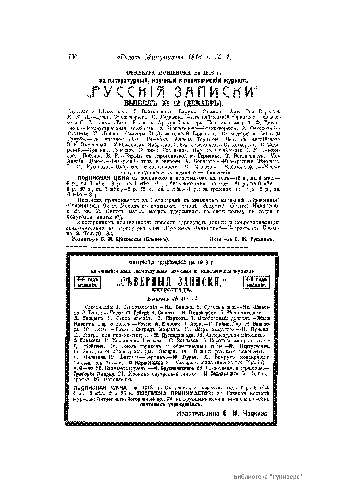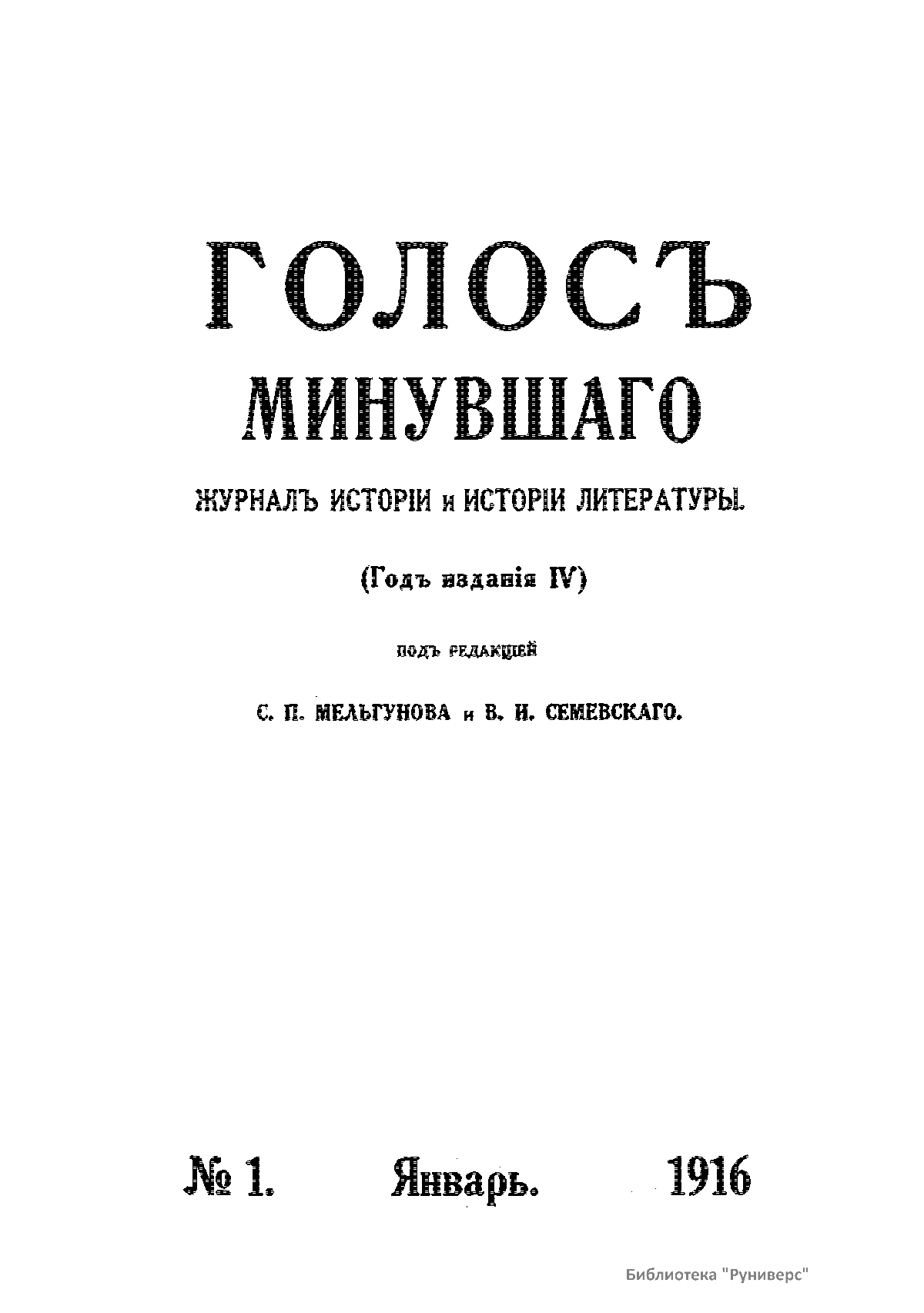 «Голос Минувшего» — журнал истории и истории литературы либерально-народнического направления, издававшийся в Москве с 1913 по 1923 год. Издателем журнала в 1913–1922 годах были известные русские историки, публицисты и общественные деятели С. П. Мельгунов (1880–1956) и В. И. Семевский (1848–1916). В редакционную коллегию также входили А. К. Дживелегов и П. Н. Сакулин. До 1919 «Голос минувшего» выходил ежемесячно, затем нерегулярно, всего было выпущено 65 номеров. В журнале публиковались интереснейшие материалы, посвященные истории литературы и общественных движений в России второй половины XVIII – начала XX веков. Здесь можно найти: статьи по вопросам русской и всеобщей истории, истории литературы, философии, искусства и археологии. В издании представлены: историческая беллетристика, биографии русских и иностранных деятелей, критика и библиография, новости русской и иностранной науки, обзор журналов русских и иностранных, хроника, мемуары, записки, дневники и письма декабристов, видных народовольцев и эсеров, крупных общественных деятелей и царских администраторов, писателей, военачальников и др. Среди авторов: Е. В. Тарле, А. Ф. Кони, А. К. Дживелегов, А. А. Кизеветтер, В. Г. Короленко и др. Стремление сделать журнал интересным для более широкого круга читателей способствовало тому, что в «Голосе Минувшего», хоть и в ограниченном количестве, печатались статьи по истории искусства и помещались иллюстрации: портреты, картины и рисунки, не знакомые или мало знакомые публике. В журнале опубликован целый ряд интересных писем, документов и воспоминаний. Абсолютное большинство текстов никогда не переиздавалось. Журнал снабжен указателями имен за 1913–1922 годы и систематическим указателем содержания.