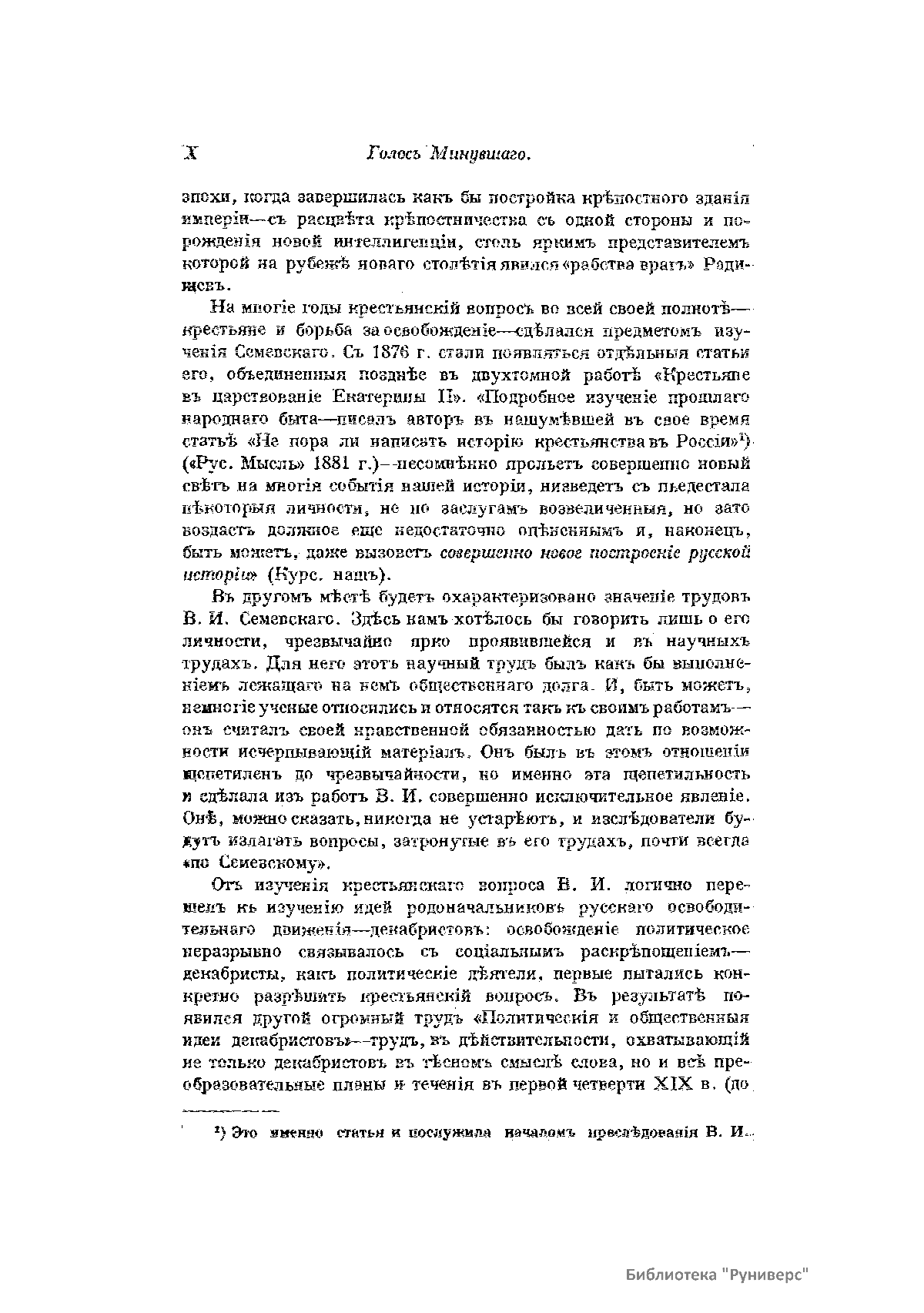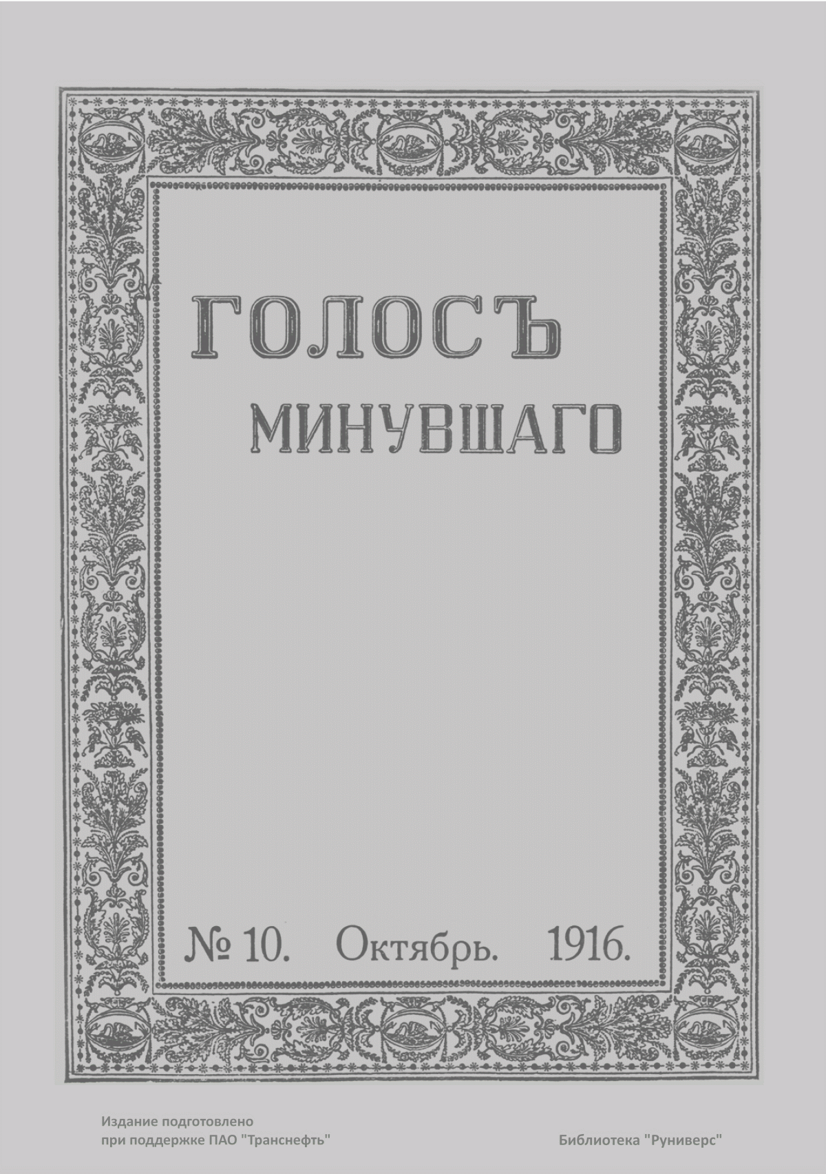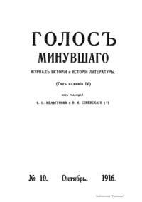 «Голос Минувшего» — журнал истории и истории литературы либерально-народнического направления, издававшийся в Москве с 1913 по 1923 год. Издателем журнала в 1913–1922 годах были известные русские историки, публицисты и общественные деятели С. П. Мельгунов (1880–1956) и В. И. Семевский (1848–1916). В редакционную коллегию также входили А. К. Дживелегов и П. Н. Сакулин. До 1919 «Голос минувшего» выходил ежемесячно, затем нерегулярно, всего было выпущено 65 номеров. В журнале публиковались интереснейшие материалы, посвященные истории литературы и общественных движений в России второй половины XVIII – начала XX веков. Здесь можно найти: статьи по вопросам русской и всеобщей истории, истории литературы, философии, искусства и археологии. В издании представлены: историческая беллетристика, биографии русских и иностранных деятелей, критика и библиография, новости русской и иностранной науки, обзор журналов русских и иностранных, хроника, мемуары, записки, дневники и письма декабристов, видных народовольцев и эсеров, крупных общественных деятелей и царских администраторов, писателей, военачальников и др. Среди авторов: Е. В. Тарле, А. Ф. Кони, А. К. Дживелегов, А. А. Кизеветтер, В. Г. Короленко и др. Стремление сделать журнал интересным для более широкого круга читателей способствовало тому, что в «Голосе Минувшего», хоть и в ограниченном количестве, печатались статьи по истории искусства и помещались иллюстрации: портреты, картины и рисунки, не знакомые или мало знакомые публике. В журнале опубликован целый ряд интересных писем, документов и воспоминаний. Абсолютное большинство текстов никогда не переиздавалось. Журнал снабжен указателями имен за 1913–1922 годы и систематическим указателем содержания.