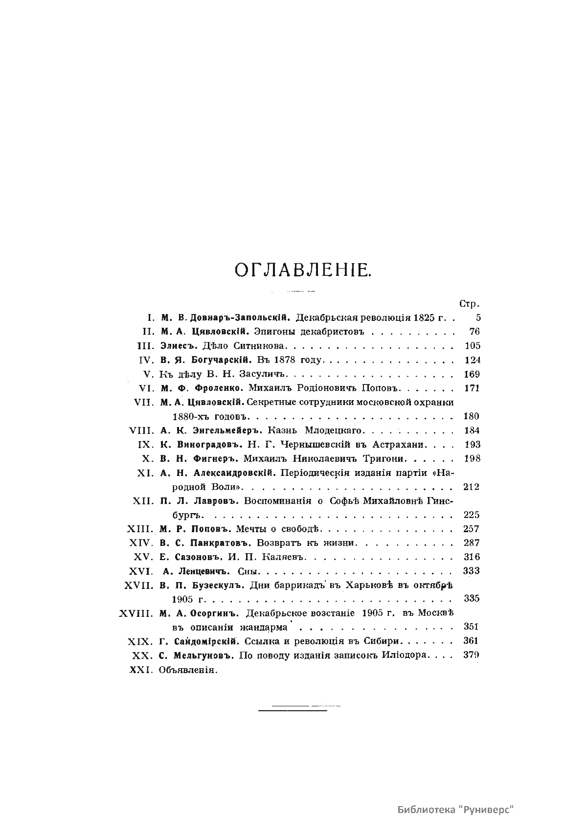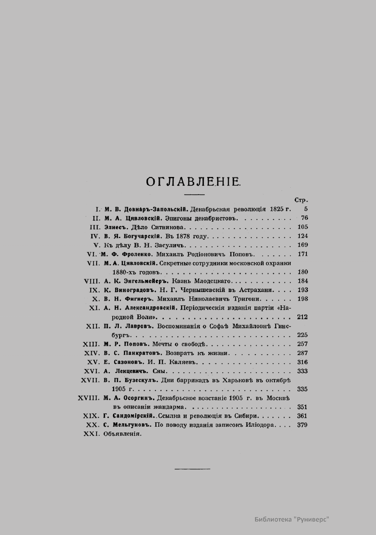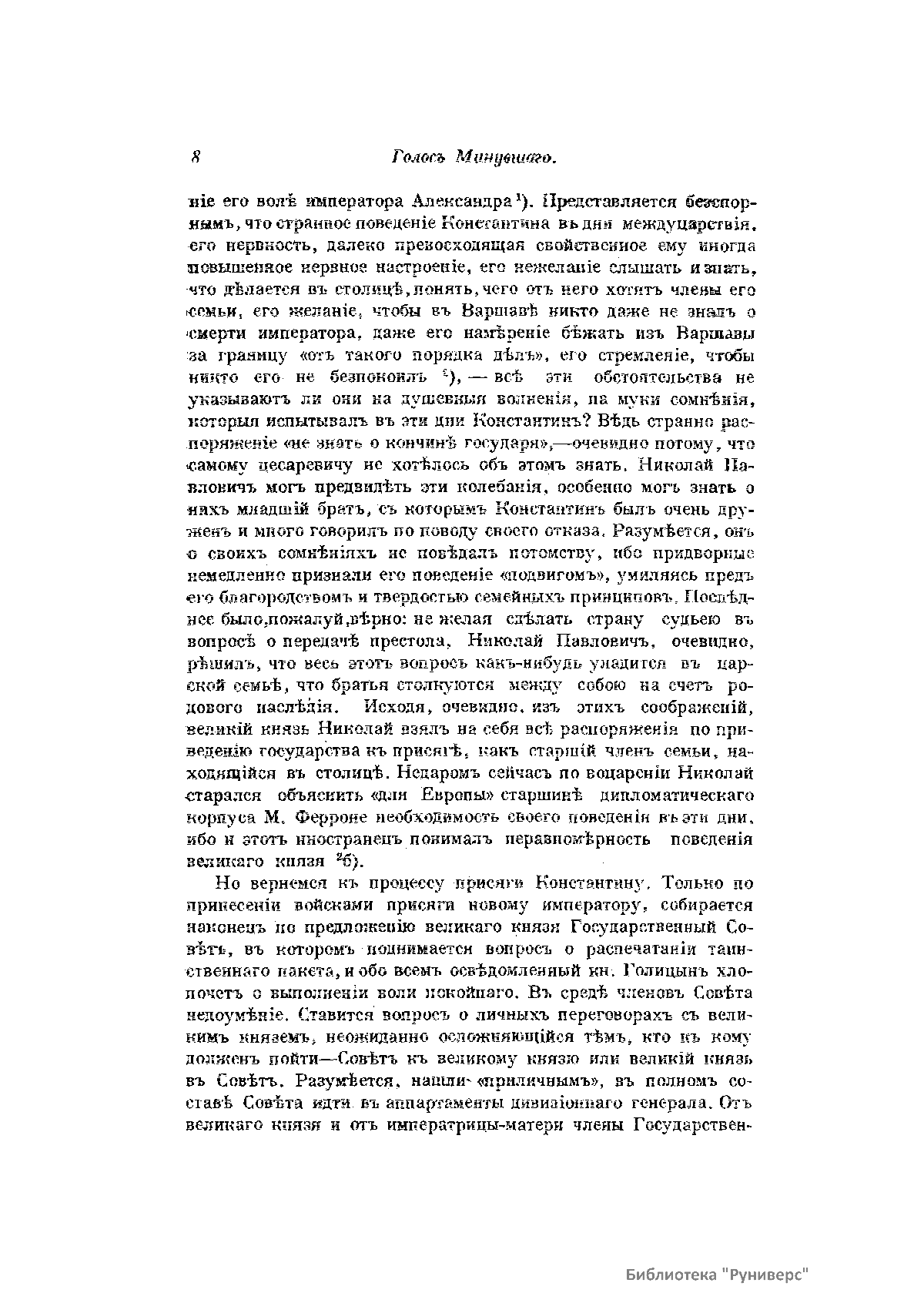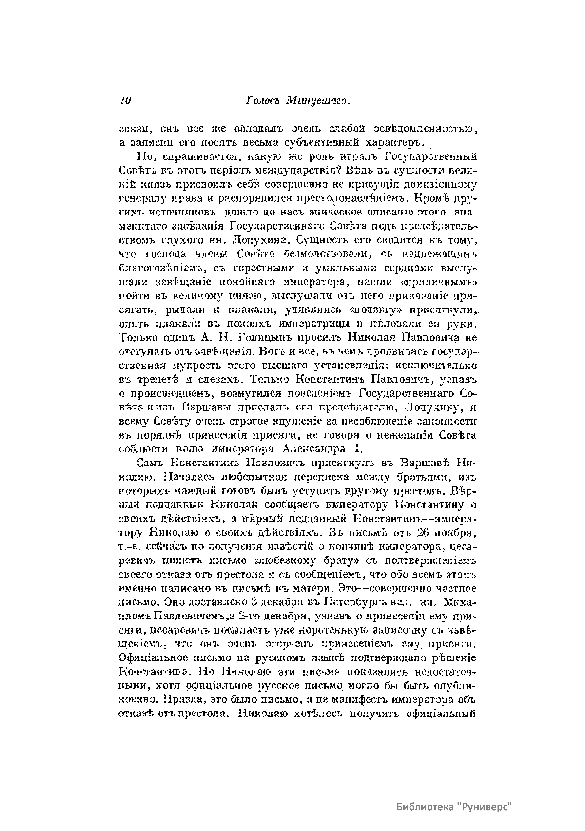 «Голос Минувшего» — журнал истории и истории литературы либерально-народнического направления, издававшийся в Москве с 1913 по 1923 год. Издателем журнала в 1913–1922 годах были известные русские историки, публицисты и общественные деятели С. П. Мельгунов (1880–1956) и В. И. Семевский (1848–1916). В редакционную коллегию также входили А. К. Дживелегов и П. Н. Сакулин. До 1919 «Голос минувшего» выходил ежемесячно, затем нерегулярно, всего было выпущено 65 номеров. В журнале публиковались интереснейшие материалы, посвященные истории литературы и общественных движений в России второй половины XVIII – начала XX веков. Здесь можно найти: статьи по вопросам русской и всеобщей истории, истории литературы, философии, искусства и археологии. В издании представлены: историческая беллетристика, биографии русских и иностранных деятелей, критика и библиография, новости русской и иностранной науки, обзор журналов русских и иностранных, хроника, мемуары, записки, дневники и письма декабристов, видных народовольцев и эсеров, крупных общественных деятелей и царских администраторов, писателей, военачальников и др. Среди авторов: Е. В. Тарле, А. Ф. Кони, А. К. Дживелегов, А. А. Кизеветтер, В. Г. Короленко и др. Стремление сделать журнал интересным для более широкого круга читателей способствовало тому, что в «Голосе Минувшего», хоть и в ограниченном количестве, печатались статьи по истории искусства и помещались иллюстрации: портреты, картины и рисунки, не знакомые или мало знакомые публике. В журнале опубликован целый ряд интересных писем, документов и воспоминаний. Абсолютное большинство текстов никогда не переиздавалось. Журнал снабжен указателями имен за 1913–1922 годы и систематическим указателем содержания.
