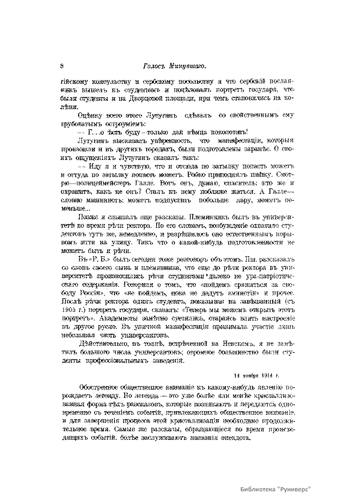 «Голос Минувшего» — журнал истории и истории литературы либерально-народнического направления, издававшийся в Москве с 1913 по 1923 год. Издателем журнала в 1913–1922 годах были известные русские историки, публицисты и общественные деятели С. П. Мельгунов (1880–1956) и В. И. Семевский (1848–1916). В редакционную коллегию также входили А. К. Дживелегов и П. Н. Сакулин. До 1919 «Голос минувшего» выходил ежемесячно, затем нерегулярно, всего было выпущено 65 номеров. В журнале публиковались интереснейшие материалы, посвященные истории литературы и общественных движений в России второй половины XVIII – начала XX веков. Здесь можно найти: статьи по вопросам русской и всеобщей истории, истории литературы, философии, искусства и археологии. В издании представлены: историческая беллетристика, биографии русских и иностранных деятелей, критика и библиография, новости русской и иностранной науки, обзор журналов русских и иностранных, хроника, мемуары, записки, дневники и письма декабристов, видных народовольцев и эсеров, крупных общественных деятелей и царских администраторов, писателей, военачальников и др. Среди авторов: Е. В. Тарле, А. Ф. Кони, А. К. Дживелегов, А. А. Кизеветтер, В. Г. Короленко и др. Стремление сделать журнал интересным для более широкого круга читателей способствовало тому, что в «Голосе Минувшего», хоть и в ограниченном количестве, печатались статьи по истории искусства и помещались иллюстрации: портреты, картины и рисунки, не знакомые или мало знакомые публике. В журнале опубликован целый ряд интересных писем, документов и воспоминаний. Абсолютное большинство текстов никогда не переиздавалось. Журнал снабжен указателями имен за 1913–1922 годы и систематическим указателем содержания.