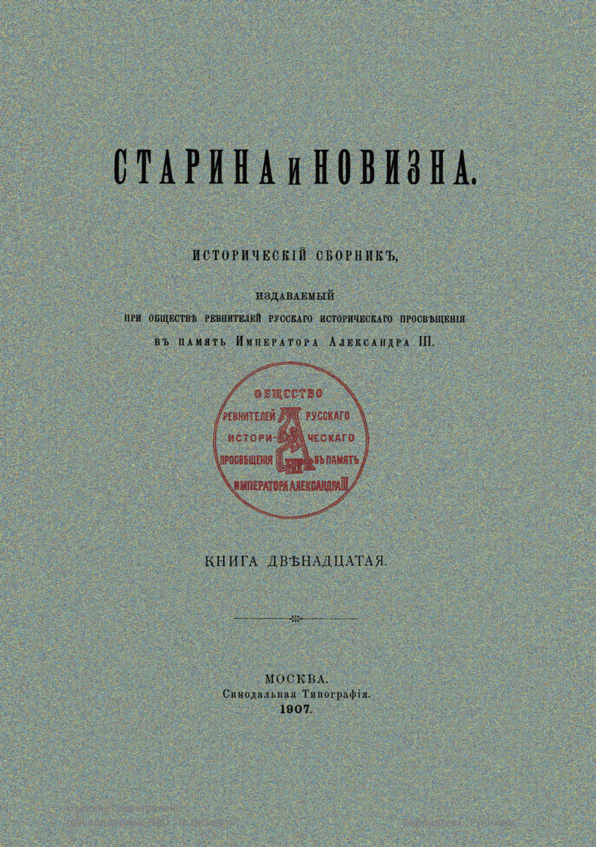 «Старина и новизна» — русский исторический сборник, издававшийся «Обществом ревнителей русского исторического просвещения в память императора Александра III». Сборник выходил в Петербурге в 1897–1904 и в Москве в 1904–1917 годах по мере накопления материала. Руководил изданием сборника граф С. Д. Шереметев (1844–1918) — историк, археолог, председатель «Общества», одного из первых объединений историков монархического направления. Члены общества способствовали изданию документов прошлого, содействуя развитию исторической науки и популяризации интереса к историческим материалам. «Старина и новизна» представляет собой собрание документальных материалов по русской истории и литературе XVII–XIX века. Вместе с Шереметевым в создании сборника участвовали блестящие историки А. П. и Н. П. Барсуковы, С. Ф. Платонов, Л. П. Майков и др.