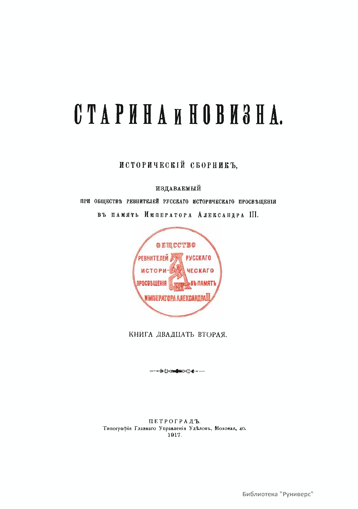 «Старина и новизна» — русский исторический сборник, издававшийся «Обществом ревнителей русского исторического просвещения в память императора Александра III». Сборник выходил в Петербурге в 1897–1904 и в Москве в 1904–1917 годах по мере накопления материала. Руководил изданием сборника граф С. Д. Шереметев (1844–1918) — историк, археолог, председатель «Общества», одного из первых объединений историков монархического направления. Члены общества способствовали изданию документов прошлого, содействуя развитию исторической науки и популяризации интереса к историческим материалам. «Старина и новизна» представляет собой собрание документальных материалов по русской истории и литературе XVII–XIX века. Вместе с Шереметевым в создании сборника участвовали блестящие историки А. П. и Н. П. Барсуковы, С. Ф. Платонов, Л. П. Майков и др.