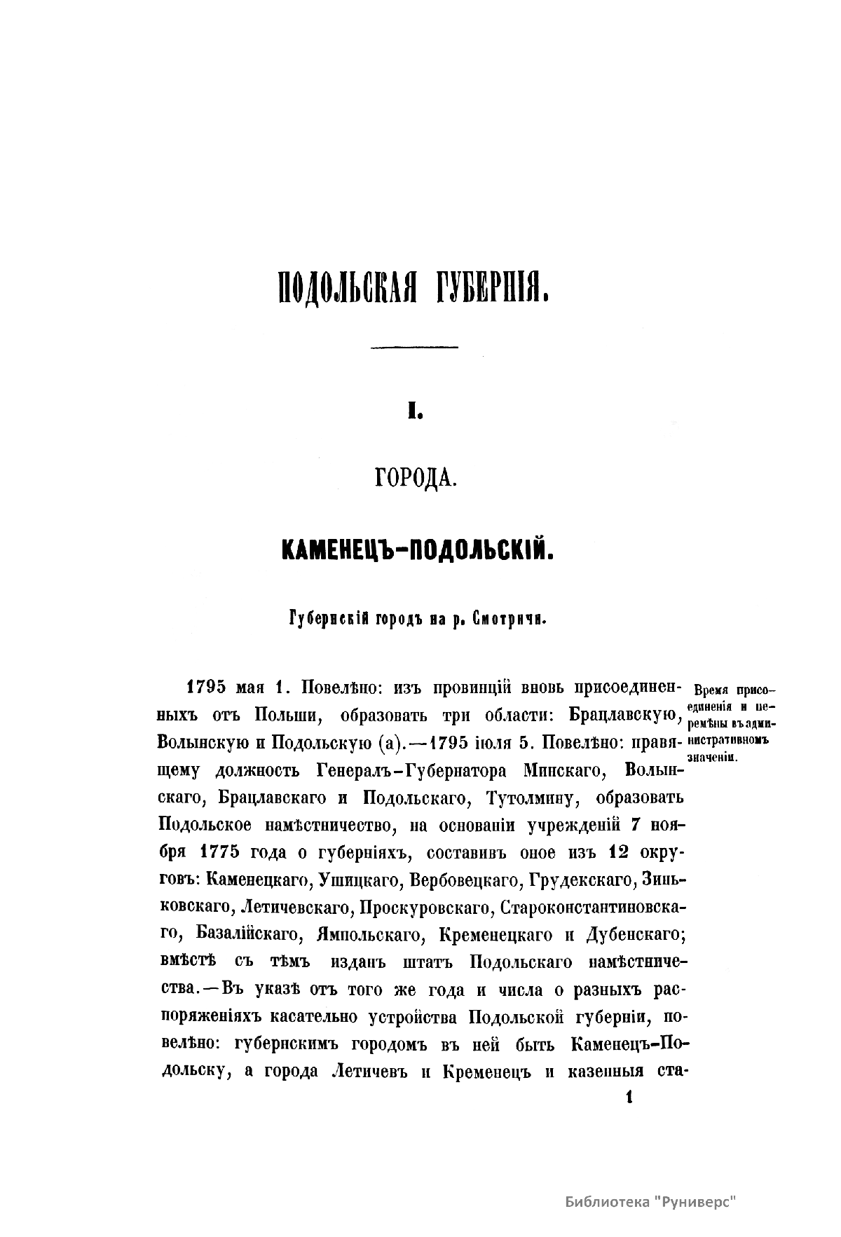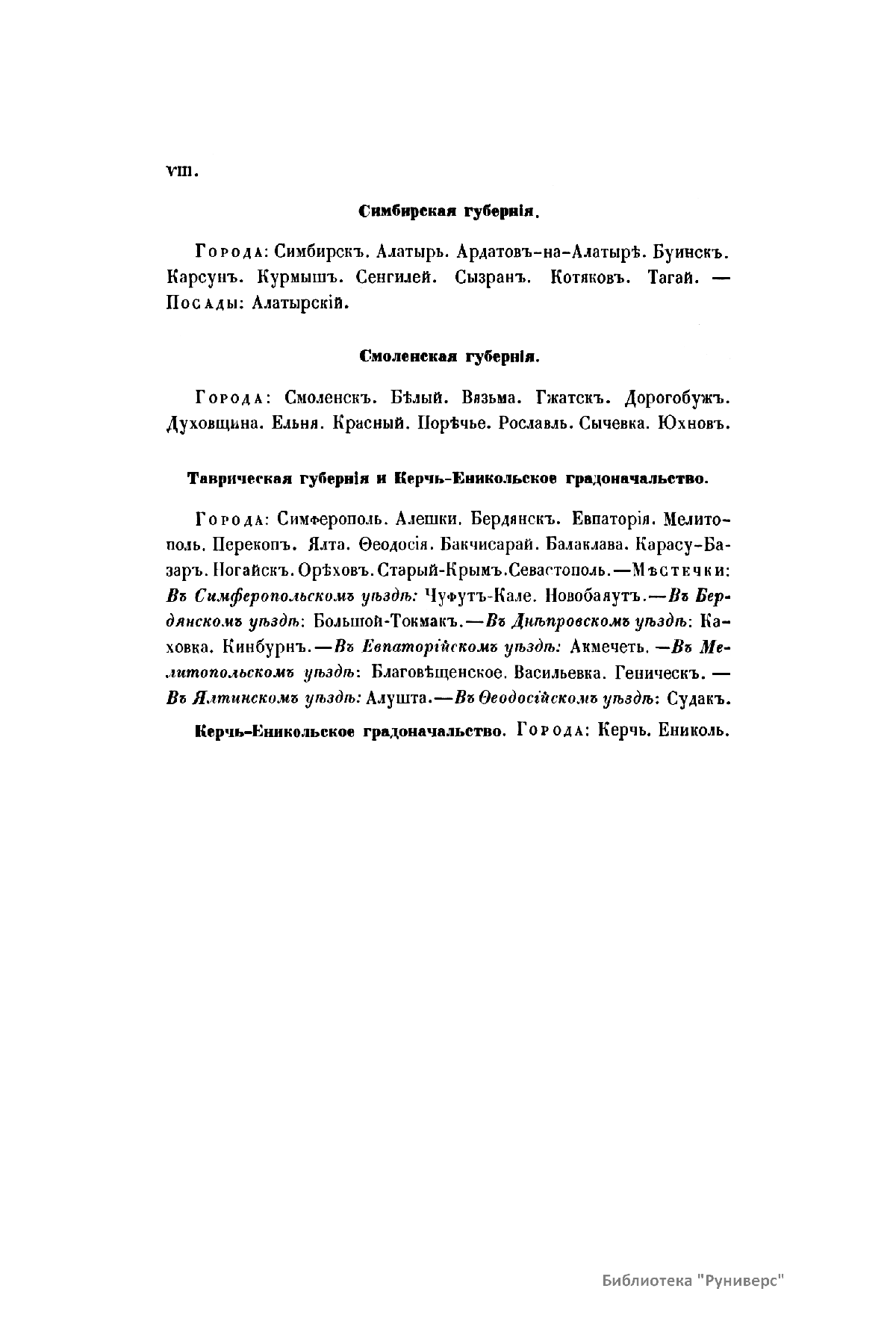 Издание заключает в себе все существующие городские поселения Российской империи, расположенные в алфавитном порядке губерний. По каждому городскому поселению указаны постановления, изданные в законодательном порядке по 1 января 1860 года. Они дают представление о значении каждого поселения в административном отношении, строительной части, городских доходах и расходах, повинностях, льготах, местных сословных правах обывателей и управления. Кроме того, по каждому городу помещаются сведения за 1858 год о населении, заимствованные из Центрального Статистического Комитета Министерства Внутренних Дел, и о количестве городских доходов и расходов, извлеченных из отчетов Городских Дум и Ратуш. Проведена обширная работа по подготовке издания. В течение нескольких лет было собрано большое количество информации для составления полного списка городских поселений. Историко-статистическое обозрение составляет восемь томов, каждый из которых посвящен отдельным губерниям. Во второй части пятого тома находится Алфавитный указатель всех имеющихся в сборнике городов с указанием томов. Шестой том посвящен Москве и городам и посадам московской губернии, а седьмой Санкт-Петербургу и городам губернии.