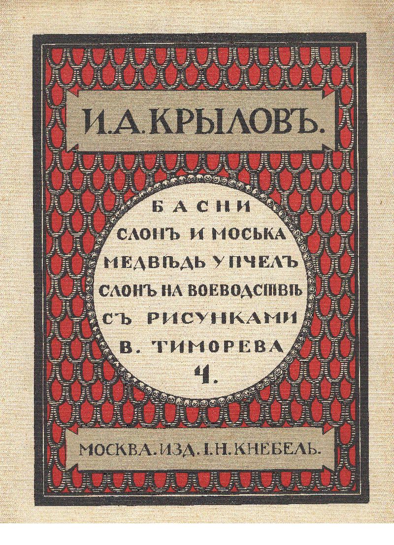 Возможно, Кнебель хотел привлечь к иллюстрированию басен различных художников. Так, например, издание 1912 года иллюстрирует Егор Нарбут. Серия оформлена в стилистике классицизма – своеобразная дань Крылову и его эпохе. Иллюстрации Тиморева на первый взгляд могут показаться не особо изящными. Они выполнены яркими красками против черно-белых точеных силуэтов Нарбута и написаны слишком натуралистично. Такие иллюстрации не соответствуют художественной эстетике начала ХХ века, но, возможно, именно такова и была задумка Кнебеля и Тиморева – изобразить героев басен в классицистическом стиле.