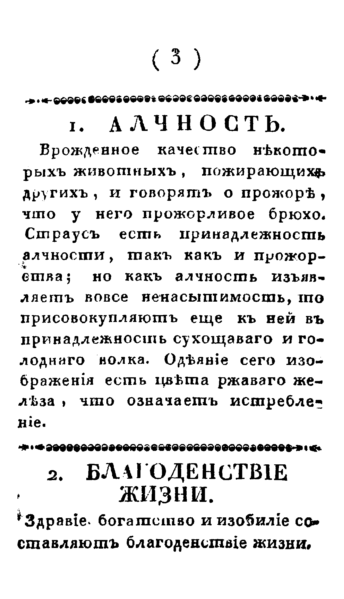 Литература для детей и юношества конца XVIII – начала XIX веков в большинстве своем назидательна и поучительна. Символы и эмблемы – часть дворянской культуры XVIII века. Вот и для детей создается изящная книжечка с эмблемами, «полезными и занимательными», что отражает воспитательно-нравственную функцию детского чтения той эпохи. В книге представлены двадцать шесть эмблем, в них через образы выражены добродетели, которым дети должны научаться, или пороки, которых юные читатели должны остерегаться. Символический образ заключен в овал, внутри которого представлен отдельный небольшой сюжет на заданную тему, что позволяет более вдумчиво «рассматривать мысль», изображенную художником. Помимо этого прилагается текст, объясняющий изображение, который чаще всего подробно раскрывает суть сюжета со ссылкой на «лучших и превосходных писателей», каковыми в то время являлись античные авторы. Гораций, Сенека, Аристотель – вот те, чьи цитаты иногда приводит неизвестный автор в объяснении эмблем.