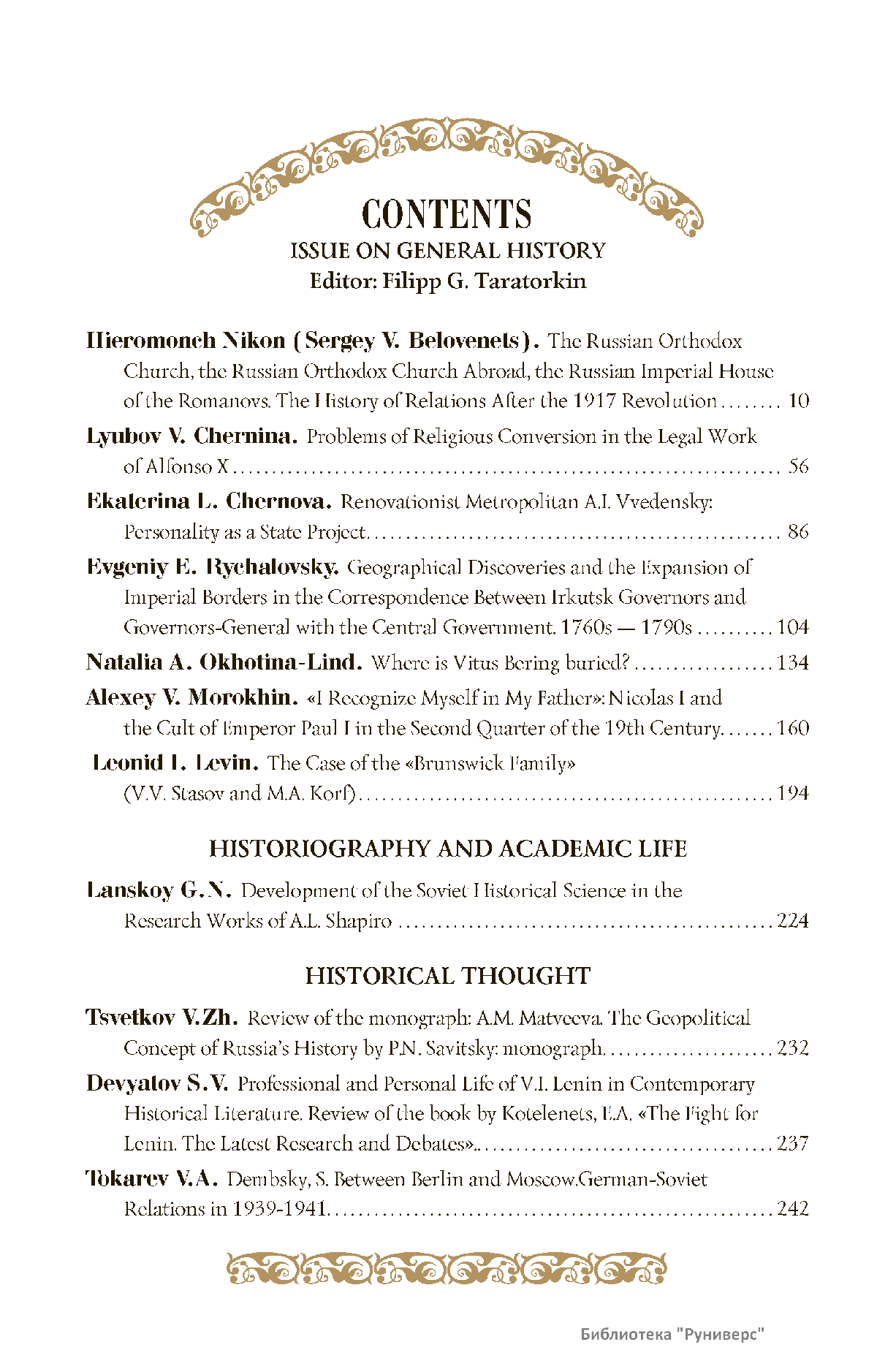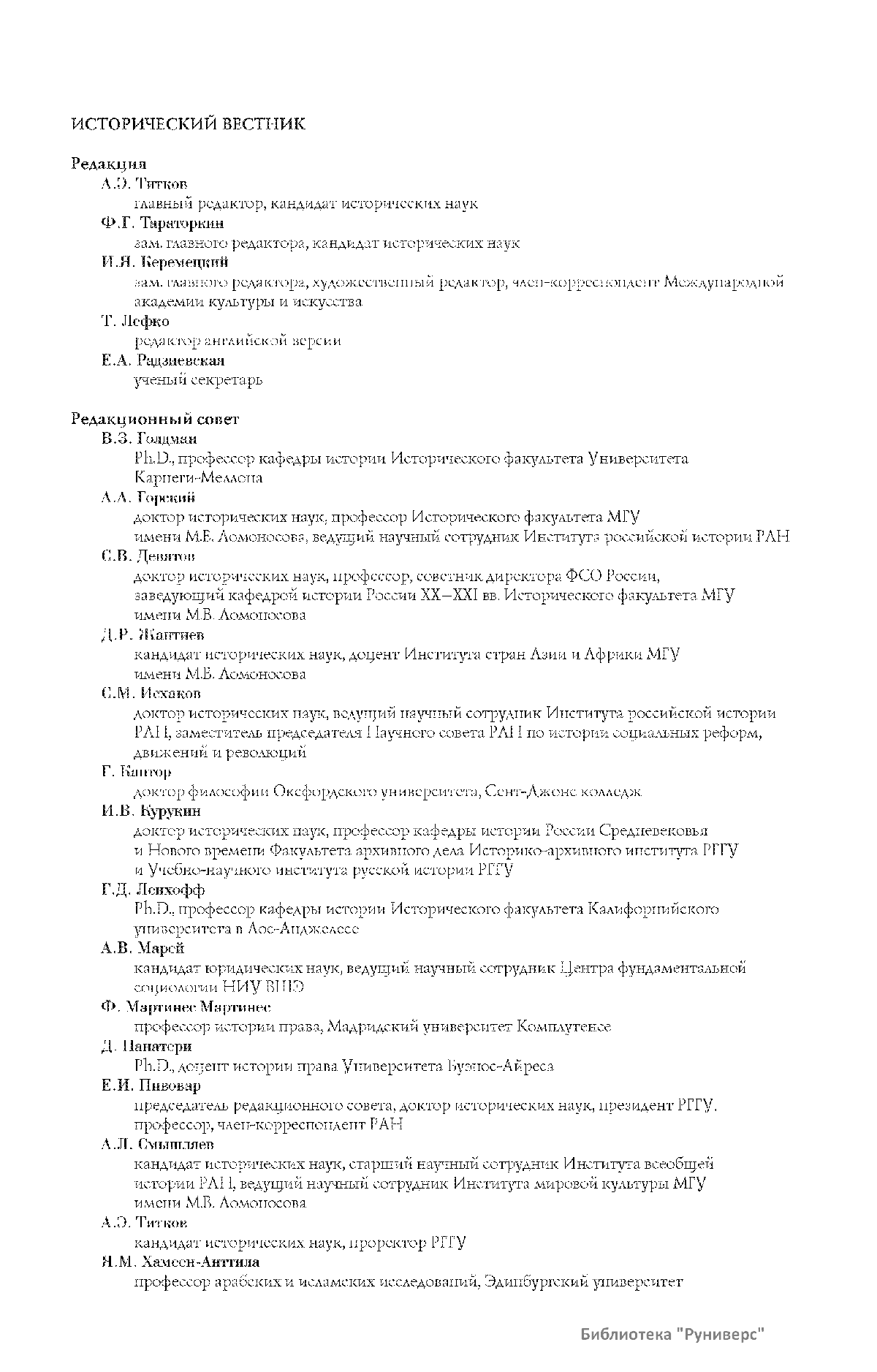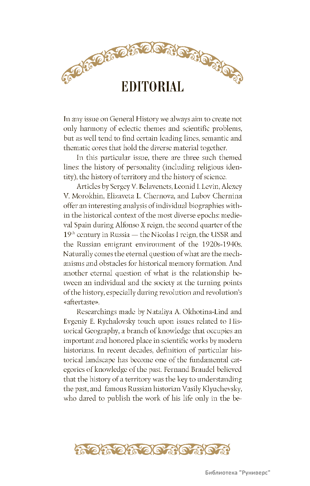 Дорогие коллеги, мы представляем вам первый номер «Исторического вестника», который одновременно обозначается 148-м томом, тем самым продолжая дореволюционное издание. Однако, перешагивая почти сто лет, мы понимаем, что реалии XXI века определяют и новое содержание журнала. История сегодня во многом актуализирована политикой. Именно геополитическая ситуация в мире, возвращающая нас к вопросам сохранения существующих границ, национальных и культурных ценностей, моральных и религиозных принципов, формирует еще одно измерение — проблему аутентичного исторического бытования народов и государств. С одной стороны, это вопрос географических ареалов государственных образований, с другой — тема, связанная с соприкосновением, взаимодействием процессов, культур и традиций. Во многом мы стоим и перед важнейшей этической проблемой. Мы должны не только вежливо и настойчиво указывать нашим уважаемым соседям на свои исторические права, но и сами уходить от искушения искусственного удревнения собственной истории или присвоения чужой. И здесь на сцену выходит его величество Исторический Научный Факт. Он и есть главный цензор и законодатель. На этом незыблемом основании будет строиться редакционная и научная работа «Исторического вестника».