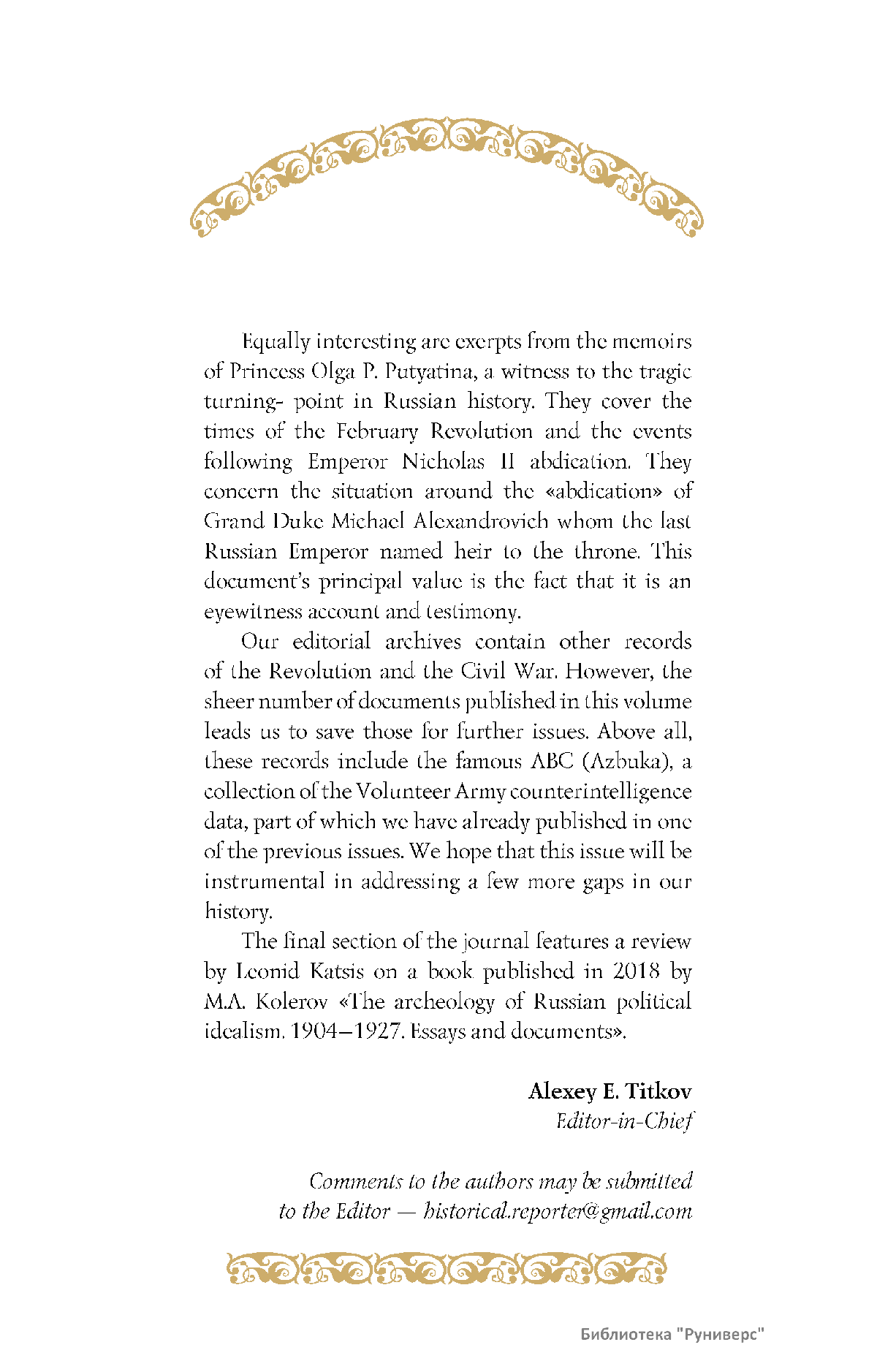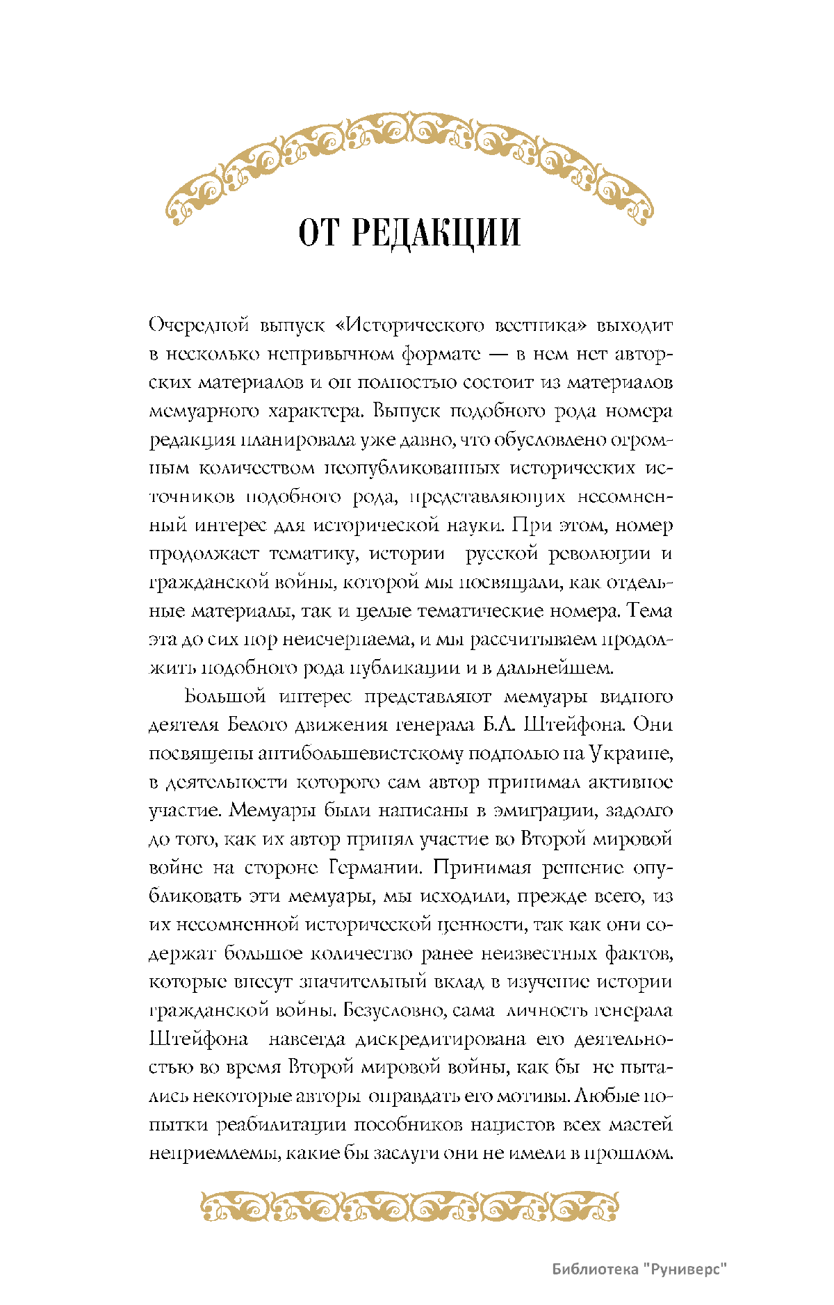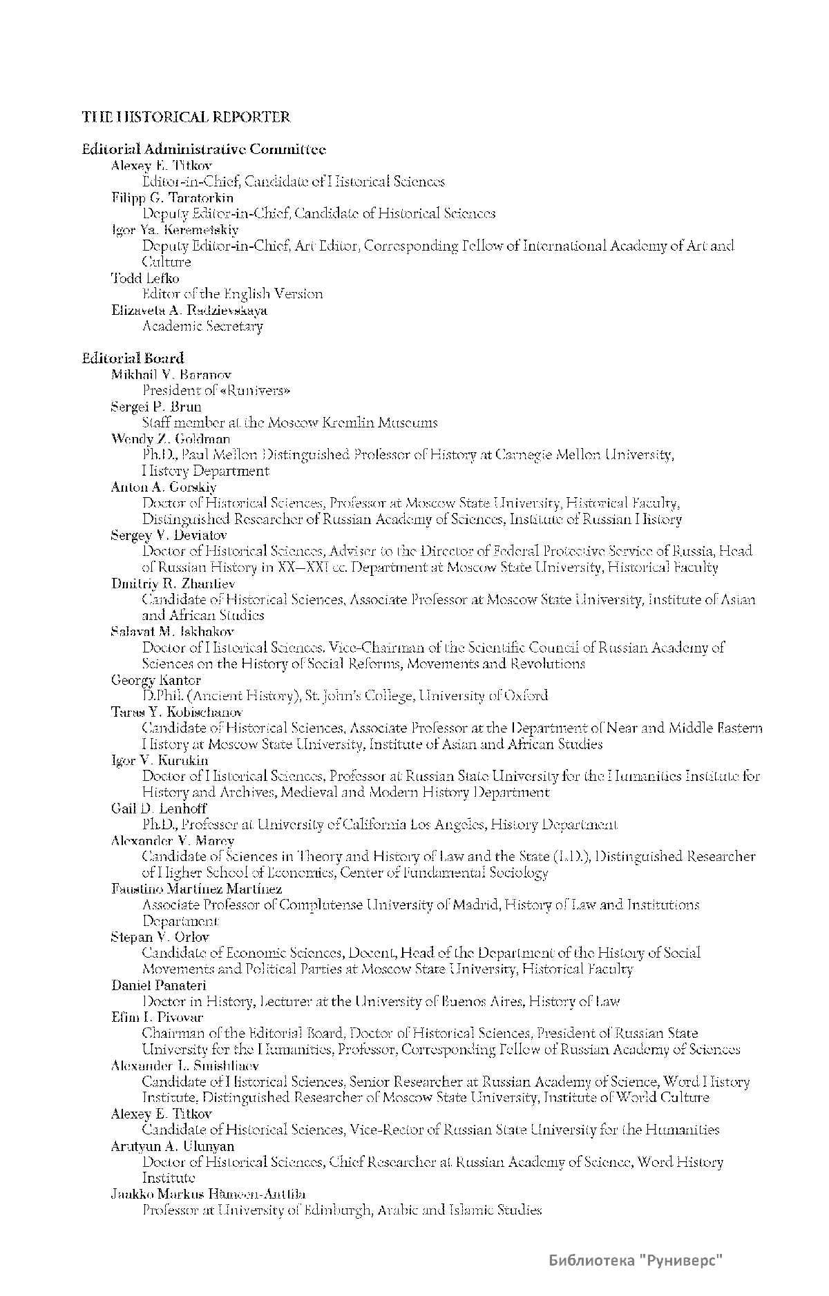 Дорогие коллеги, мы представляем вам первый номер «Исторического вестника», который одновременно обозначается 148-м томом, тем самым продолжая дореволюционное издание. Однако, перешагивая почти сто лет, мы понимаем, что реалии XXI века определяют и новое содержание журнала. История сегодня во многом актуализирована политикой. Именно геополитическая ситуация в мире, возвращающая нас к вопросам сохранения существующих границ, национальных и культурных ценностей, моральных и религиозных принципов, формирует еще одно измерение — проблему аутентичного исторического бытования народов и государств. С одной стороны, это вопрос географических ареалов государственных образований, с другой — тема, связанная с соприкосновением, взаимодействием процессов, культур и традиций. Во многом мы стоим и перед важнейшей этической проблемой. Мы должны не только вежливо и настойчиво указывать нашим уважаемым соседям на свои исторические права, но и сами уходить от искушения искусственного удревнения собственной истории или присвоения чужой. И здесь на сцену выходит его величество Исторический Научный Факт. Он и есть главный цензор и законодатель. На этом незыблемом основании будет строиться редакционная и научная работа «Исторического вестника».