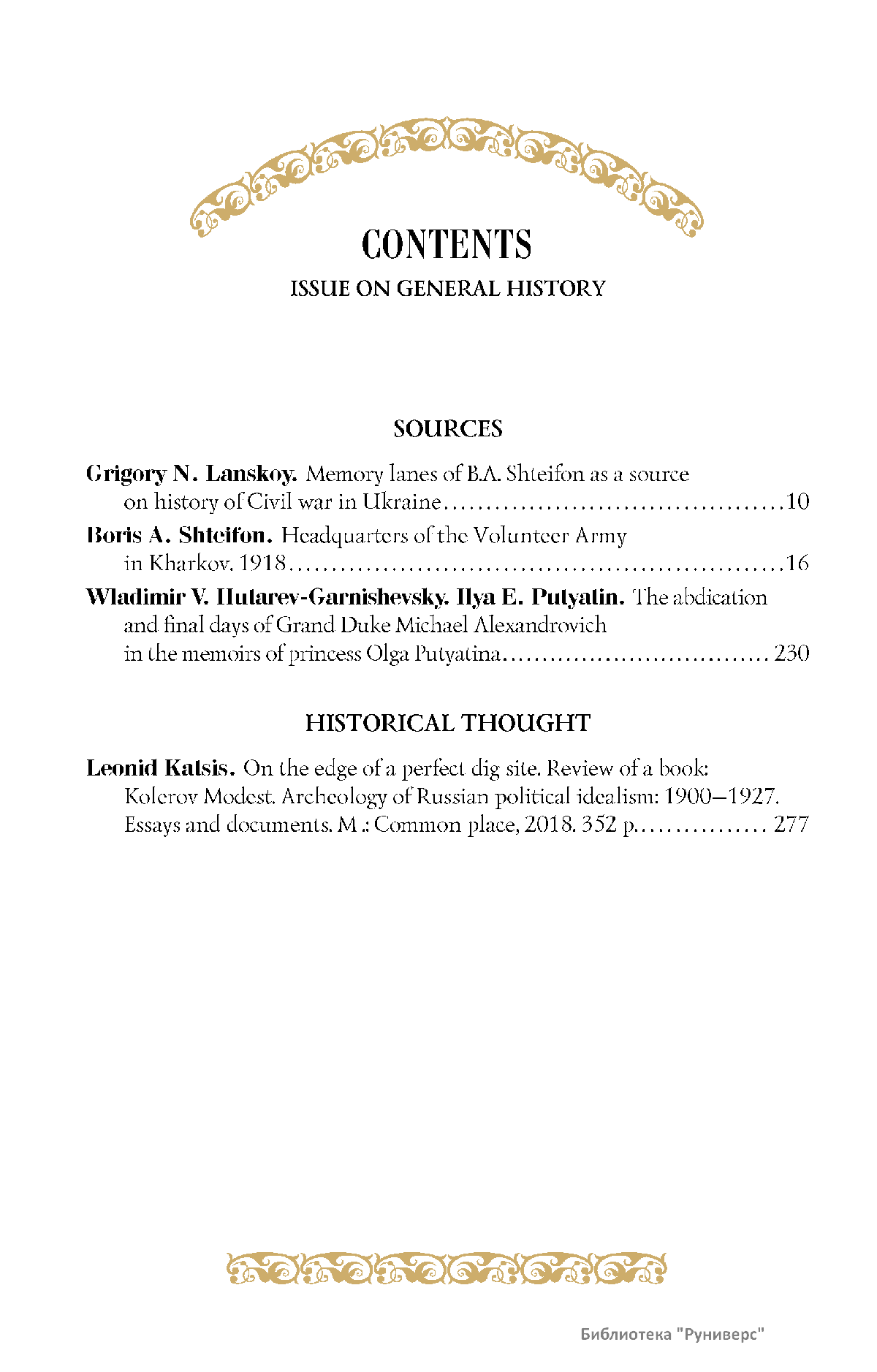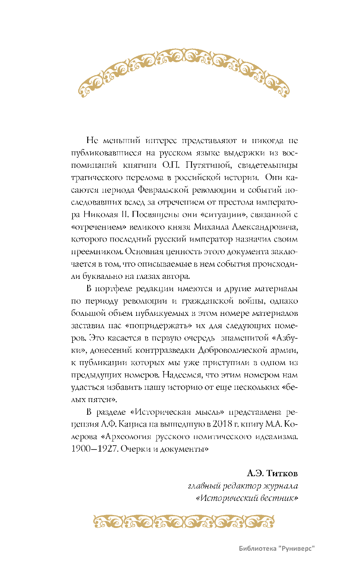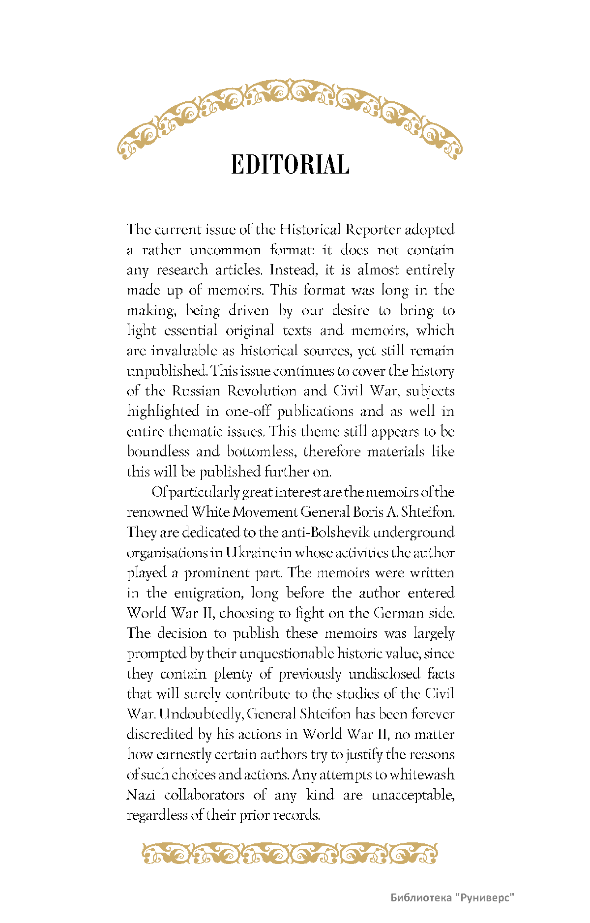 Дорогие коллеги, мы представляем вам первый номер «Исторического вестника», который одновременно обозначается 148-м томом, тем самым продолжая дореволюционное издание. Однако, перешагивая почти сто лет, мы понимаем, что реалии XXI века определяют и новое содержание журнала. История сегодня во многом актуализирована политикой. Именно геополитическая ситуация в мире, возвращающая нас к вопросам сохранения существующих границ, национальных и культурных ценностей, моральных и религиозных принципов, формирует еще одно измерение — проблему аутентичного исторического бытования народов и государств. С одной стороны, это вопрос географических ареалов государственных образований, с другой — тема, связанная с соприкосновением, взаимодействием процессов, культур и традиций. Во многом мы стоим и перед важнейшей этической проблемой. Мы должны не только вежливо и настойчиво указывать нашим уважаемым соседям на свои исторические права, но и сами уходить от искушения искусственного удревнения собственной истории или присвоения чужой. И здесь на сцену выходит его величество Исторический Научный Факт. Он и есть главный цензор и законодатель. На этом незыблемом основании будет строиться редакционная и научная работа «Исторического вестника».