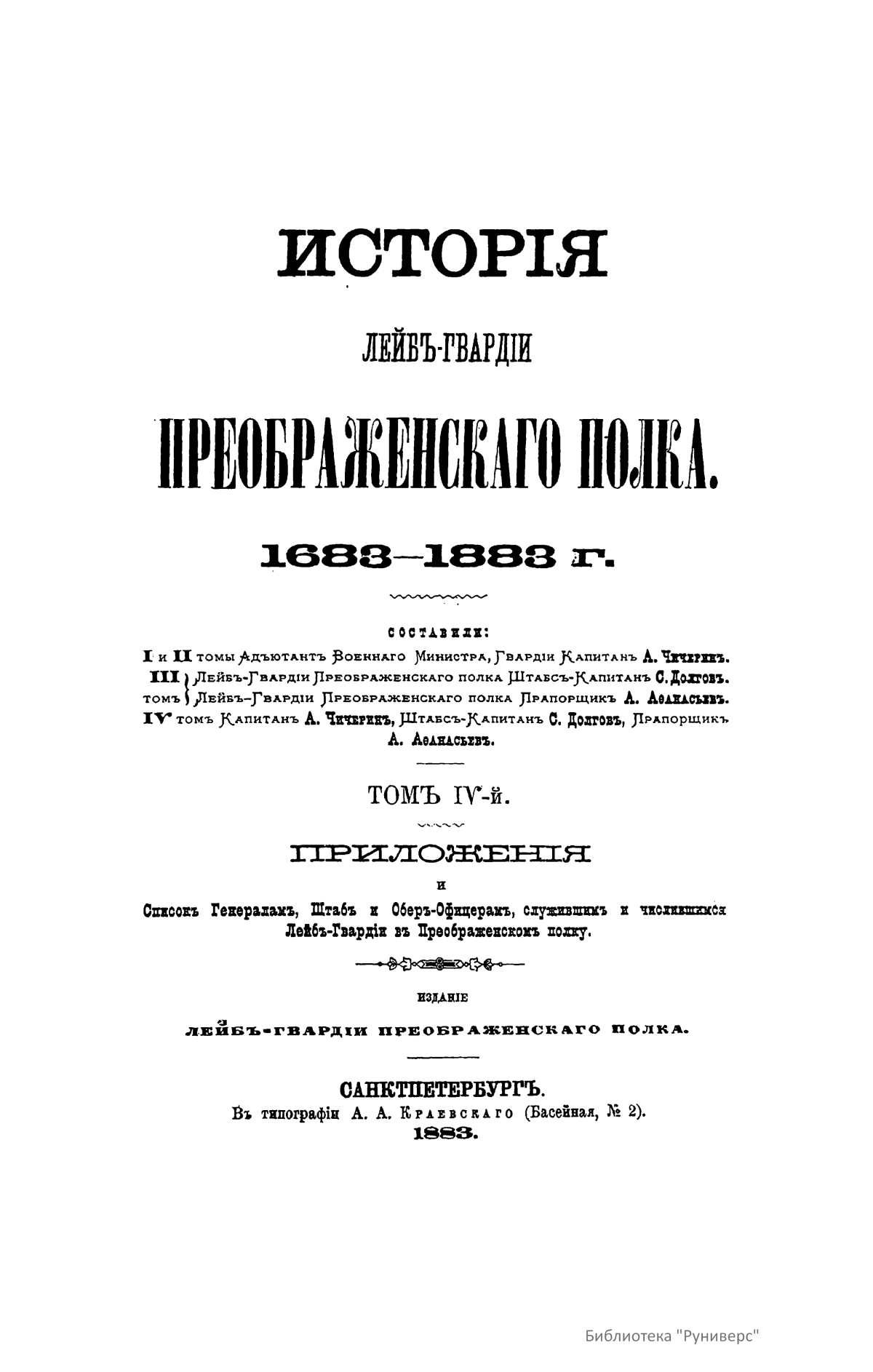 История Лейб-гвардии Преображенского полка. 1683-1883 г. Том IV-й. Приложения.