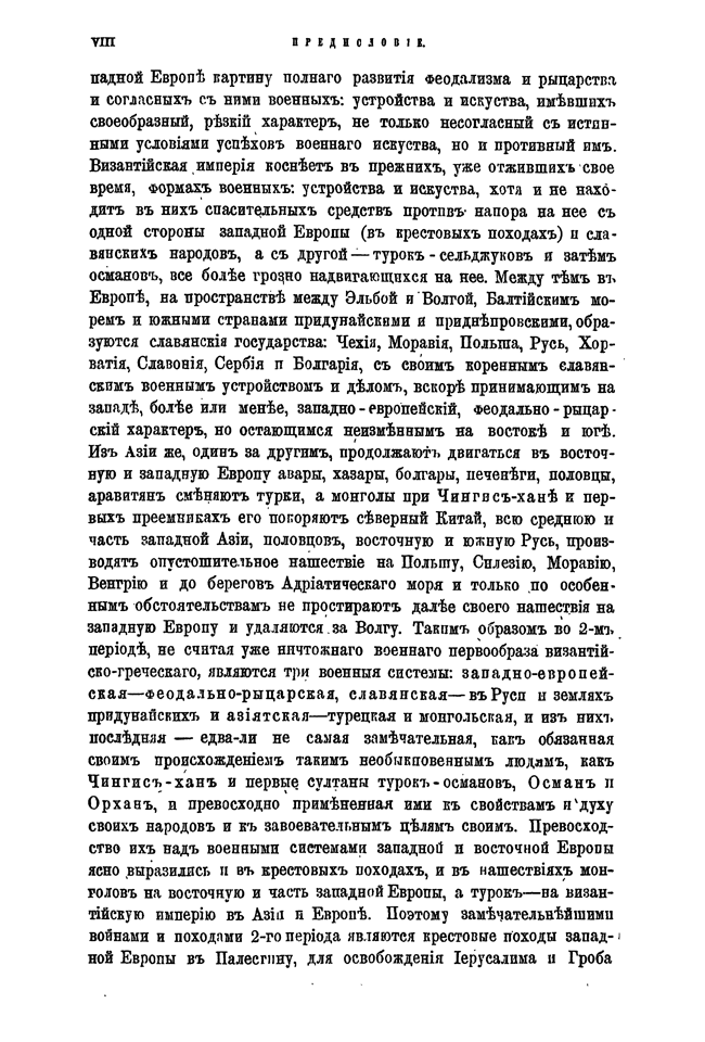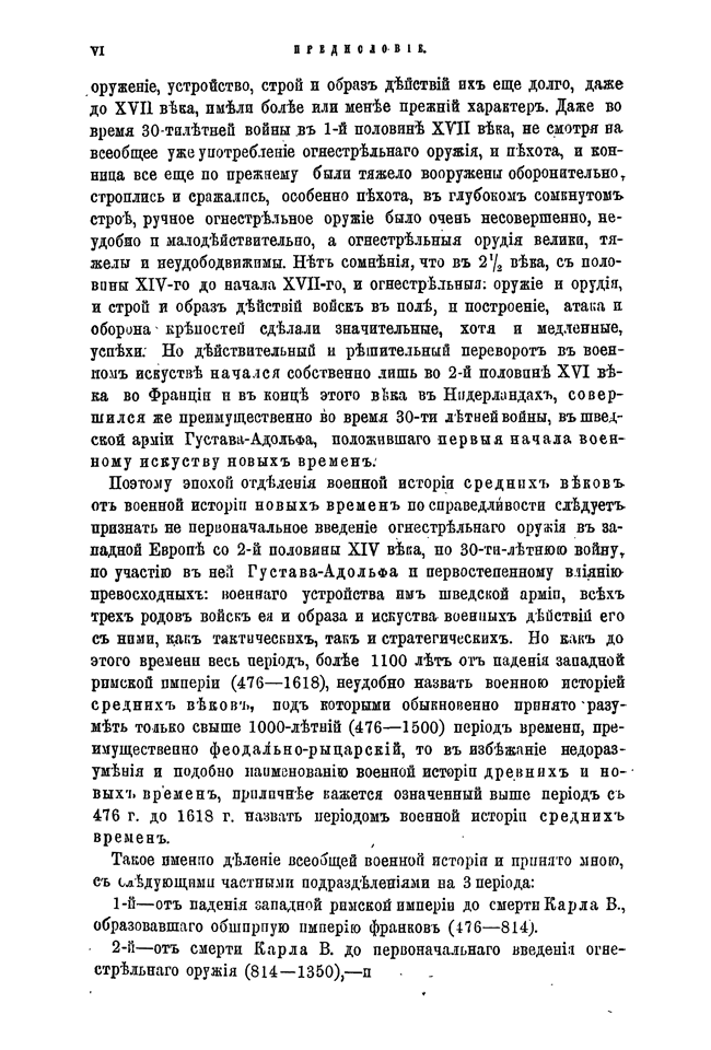 «Всеобщая военная история средних времен» состоит из двух частей. Первая посвящена историческим событиям от падения Западной Римской Империи до смерти Карла Великого, образовавшего обширную империю франков (476-814). Вторая часть рассказывает об истории следующего периода — от смерти Карла Великого до первоначального введения огнестрельного оружия (814-1350).