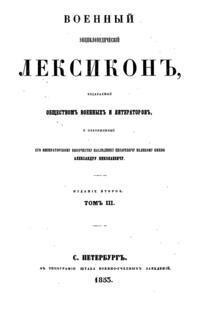Военный энциклопедический лексикон впервые издавался с 1837 по 1850 год и насчитывает 14 основных томов и один дополнительный (вышел в 1852 г.). Этот огромный труд обязан своим появлением почти исключительно энергии и настойчивости его редактора барона Л. И. Зедделера, на котором лежала вся основная масса работы. По сути своей «Лексикон» являлся первой русской военной энциклопедией (до него выходил только двухтомный «Военный словарь» С. А. Тучкова, в 1818 г.). Несмотря на довольно холодный приём военными кругами первых выпусков «Лексикона», выходившего небольшими книжками (известно, что первая часть состояла из четырёх отдельных книжек) через значительные промежутки времени и стоившего в продаже весьма немалых денег, Зедделер настойчиво занимался его изданием, вложив, помимо личного труда, и значительную часть своего состояния, и в течение 13 лет привёл его к окончанию. Программа «Лексикона» была намечена чрезвычайно широко, имея в виду крайне низкий образовательный уровень армейского офицерства времён императора Николая I и трудность пополнения общего образования при глухих стоянках и постоянном передвижении полков с места на место. В силу этого в «Лексикон» включён ряд сведений, весьма отдалённо связанных с военным делом. Барону Зедделеру удалось привлечь к составлению «Лексикона» наиболее выдающихся военных и учёных Николаевского времени, среди которых особо выделяются К. Ф. Багговут, М. И. Богданович, К. М. Базили, А. В. Висковатов, Н. С. Голицын, А. Н. Греч, Д. А. Милютин, А. И. Михайловский-Данилевский, П. И. Рикорд и другие. Из отделов «Лексикона» наиболее полным и наиболее тщательно составленным является военно-исторический отдел; слабее всего выглядит отдел военной техники, что вполне соответствует тогдашнему её состоянию. «Лексикон» построен по алфавиту статей; к некоторым томам сделано особое «Прибавление», включающее в себя некоторые статьи, пропущенные по разным причинам в предыдущих томах. В связи с долгим изданием «Лексикона» и достаточно быстрым устареванием имеющихся в нём сведений, в 1852 г. был выпущен дополнительный том под названием «Прибавление к Военному энциклопедическому лексикону».
