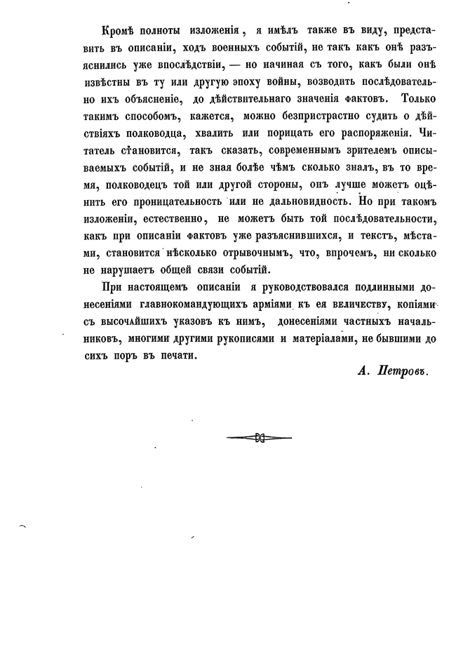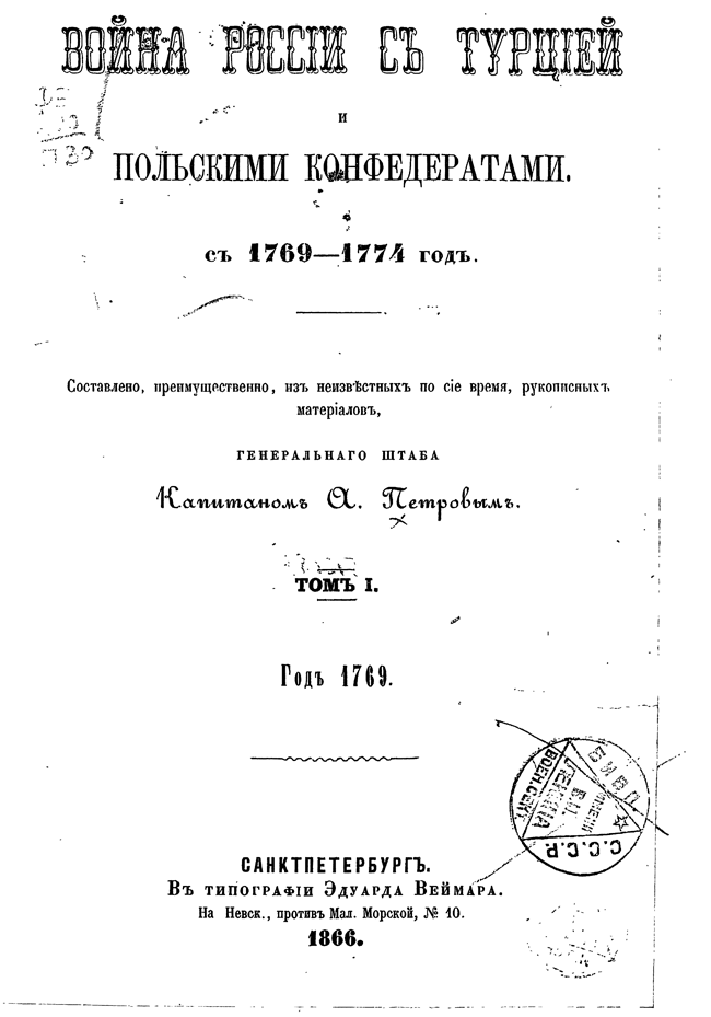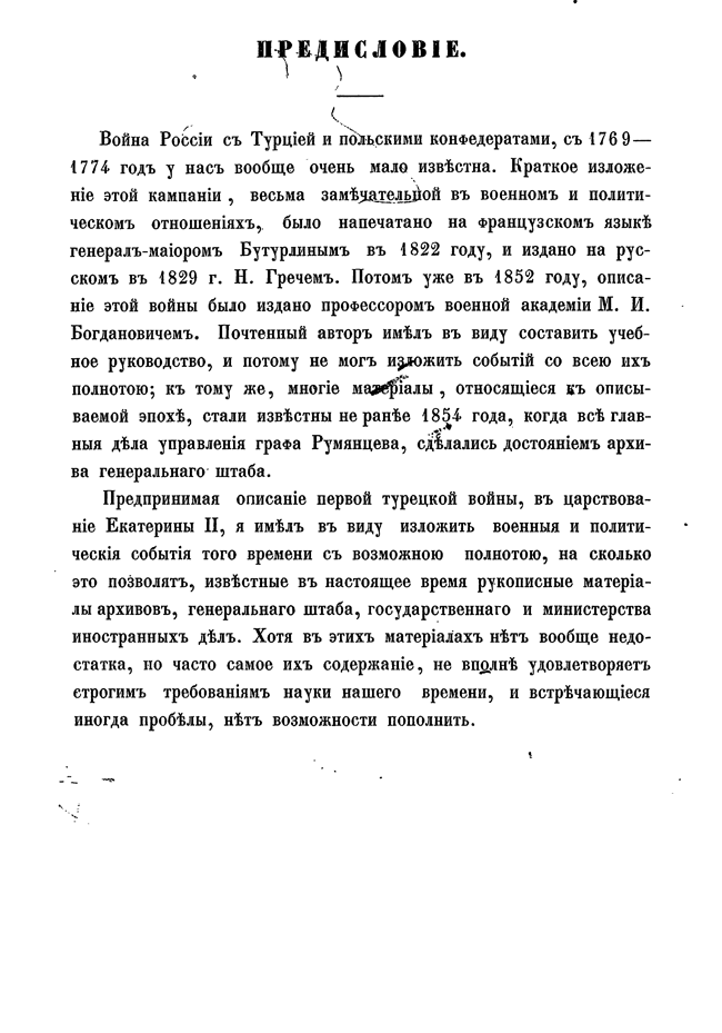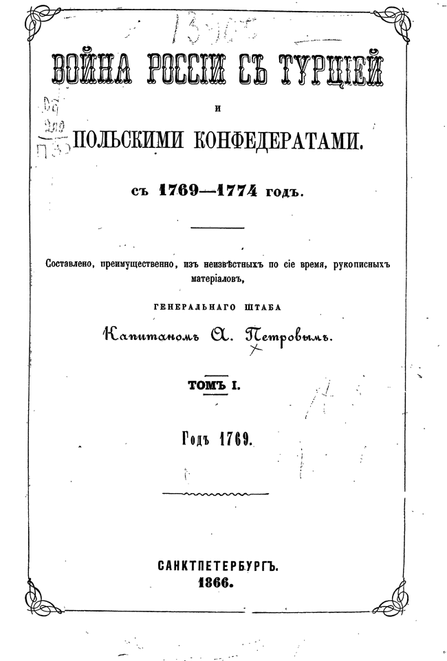 Предпринимая описание первой турецкой войны, в царствование Екатерины II, автор старался изложить военные и политические события того времени с возможною полнотой, насколько это позволяли известные ему рукописные материалы архивов, генерального штаба, государственного и министерства иностранных дел. Петрову посчасливилось одним из первых разбирать дела управления графа Румянцева, только переданные в архив генштаба.