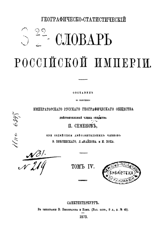Знаменитый путешественник и географ, статистик и геолог, знаток живописи и ботаник, историко-географ и энтомолог – научная деятельность Петра Петровича Семёнова-Тян-Шанского отличалась замечательной разнообразностью. Но одно направление следует подчеркнуть особо. Благодаря Семёнову был составлен обширный труд по географическому описанию России. Такого словаря не знала тогда ни одна из западноевропейских стран. Пятитомный географическо-статистический словарь издавался с 1863-го по 1885 год. Здесь тщательно собраны все имевшиеся тогда сведения о русских реках, озерах, морях, горных хребтах, населенных пунктах, губерниях, уездах. «Наша слава есть слава русской земли», – с гордостью говорил ученый о трудах и подвигах русских исследователей.