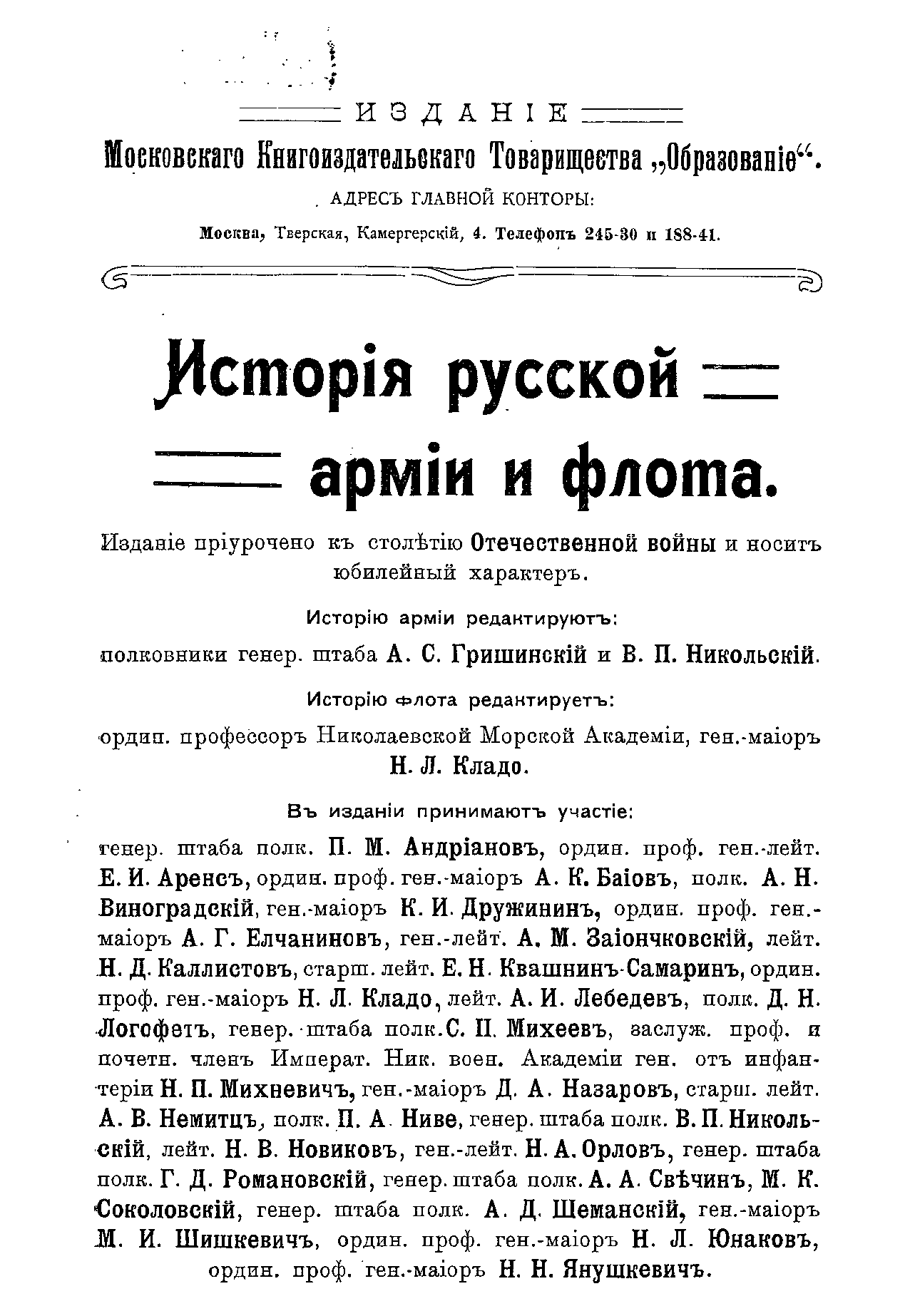 «История» рисует картину постепенного развития русского военного дела. С особым вниманием издание останавливается на наиболее выдающихся боевых эпизодах, интересуясь в тоже время организацией, бытом, вооружением и боевой подготовкой наших войск, в связи с политической жизнью государства. «История русской армии и флота» по своим размерам ( до 170 печатных листов) значительно превосходит прежние издания этого рода. Снабженная большим количеством иллюстраций и фотографий, она предназначалась для просвещения и русского офицерства, и русского общества.