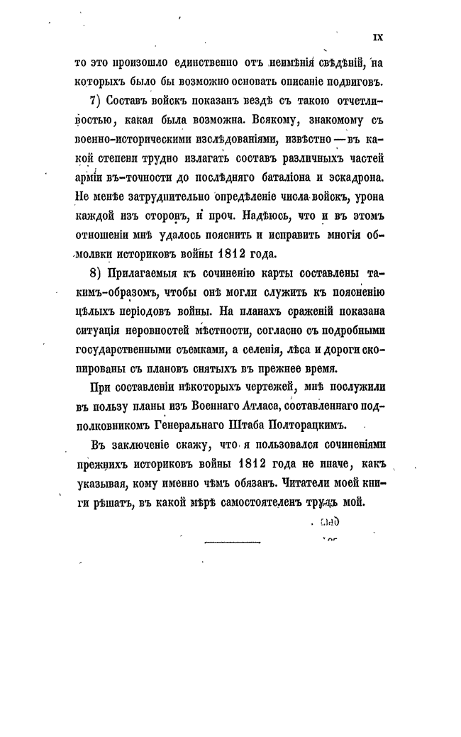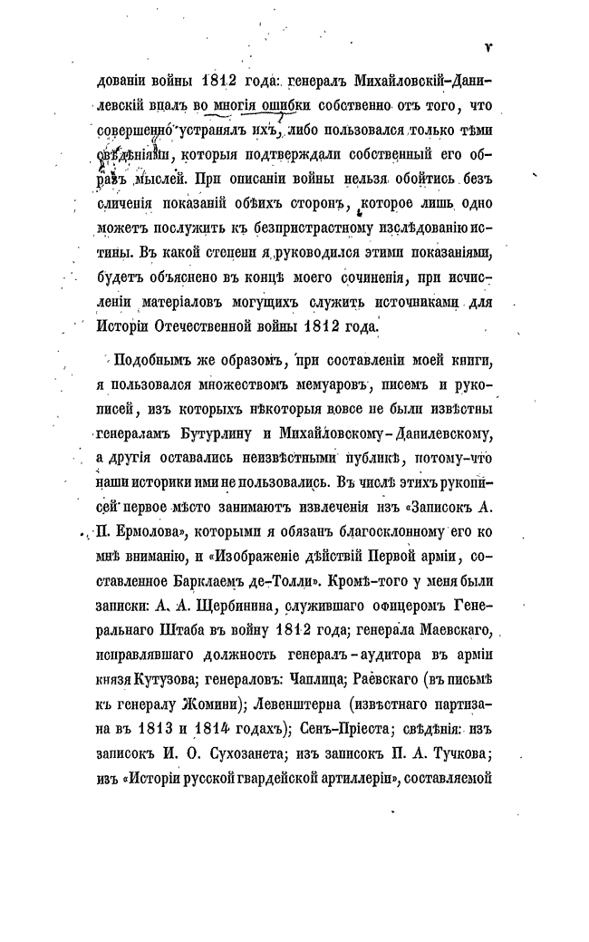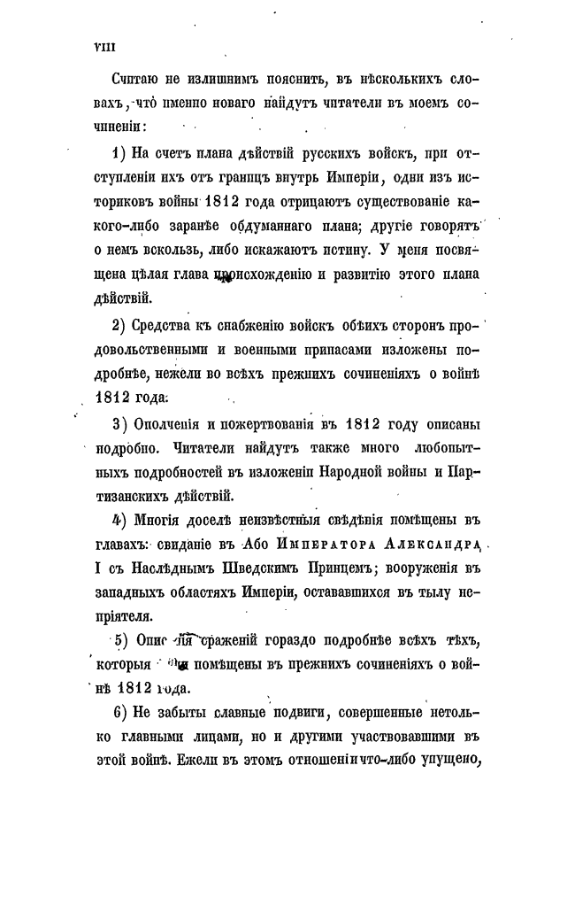 Автор считает своей обязанностью, с одной стороны, начертать высокий образ монарха, уверенного в вещественных и нравственных силах русского народа и одержавшего ценой неимоверных трудов и пожертвований верх над гениальным противником, с другой – представить картину грозного нашествия на Россию армии, составленной почти из всех европейских наций, и борьбы с ней русского народа. Автор специально указывает на то, что в своих выводах, основанных на критическом исследовании событий, он руководствовался беспристрастным отношением и к своим, и к неприятелю.