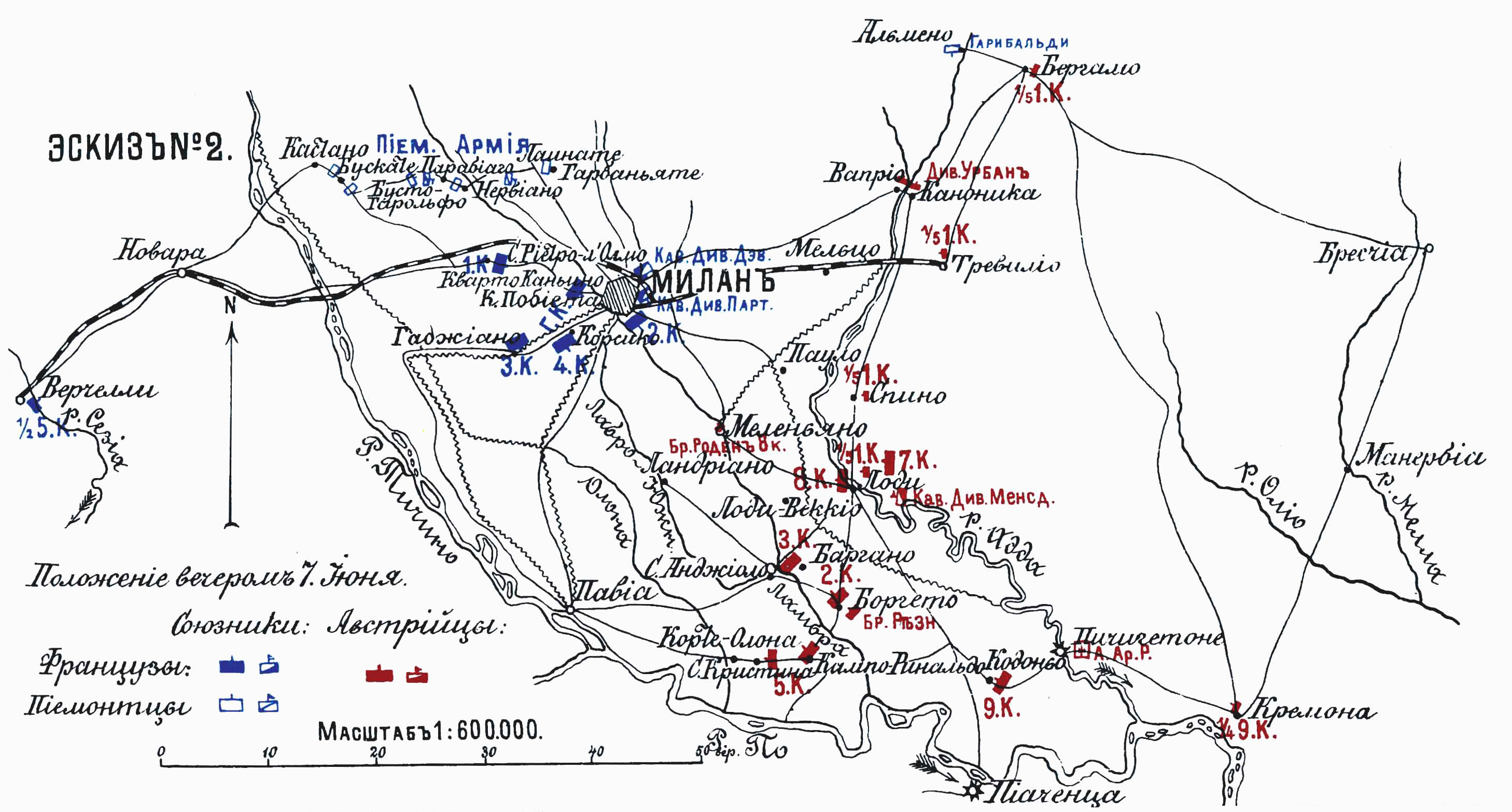 Бой при Меленьяно 8-го июня 1859 года. Эскиз №2. Положение вечером 7 июня