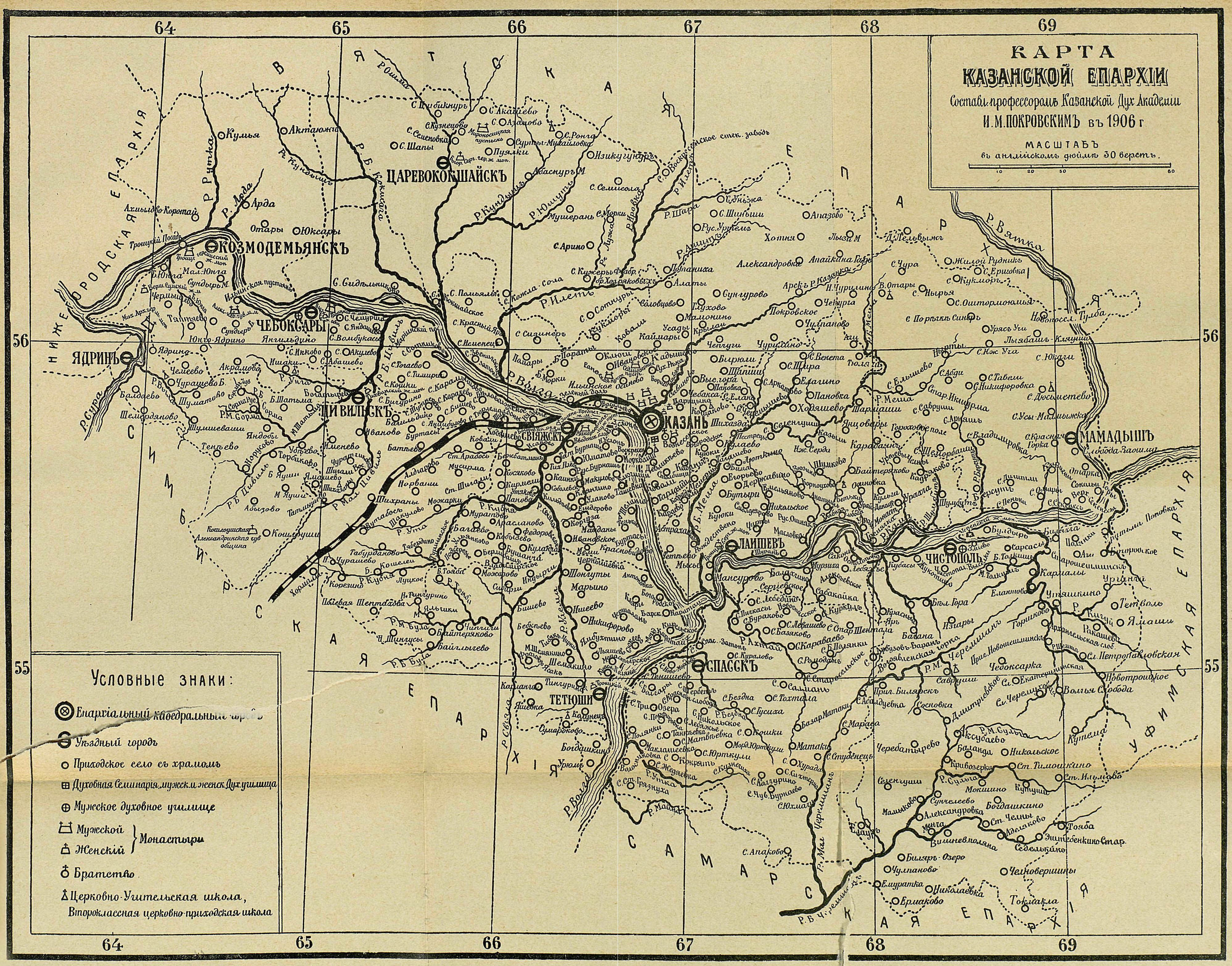 Казанская епархия. Карта составлена профессором Казанской Духовной Академии И.М.Покровским в 1906 году