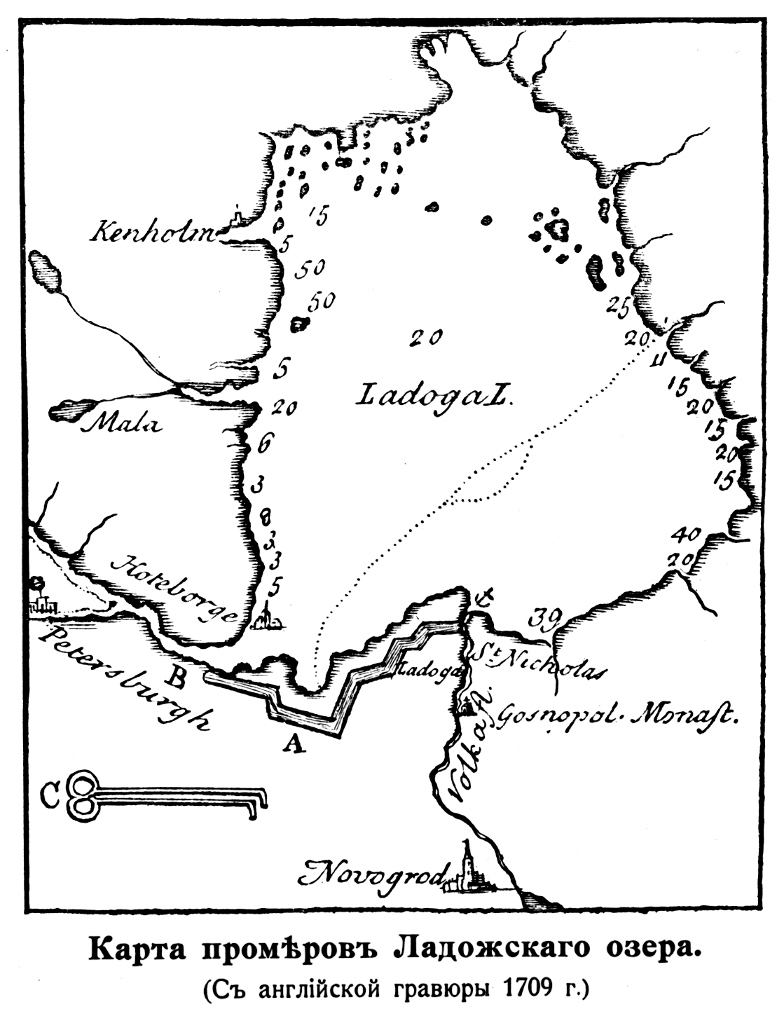 Промеры Ладожского озера (с английской гравюры 1709 года)
