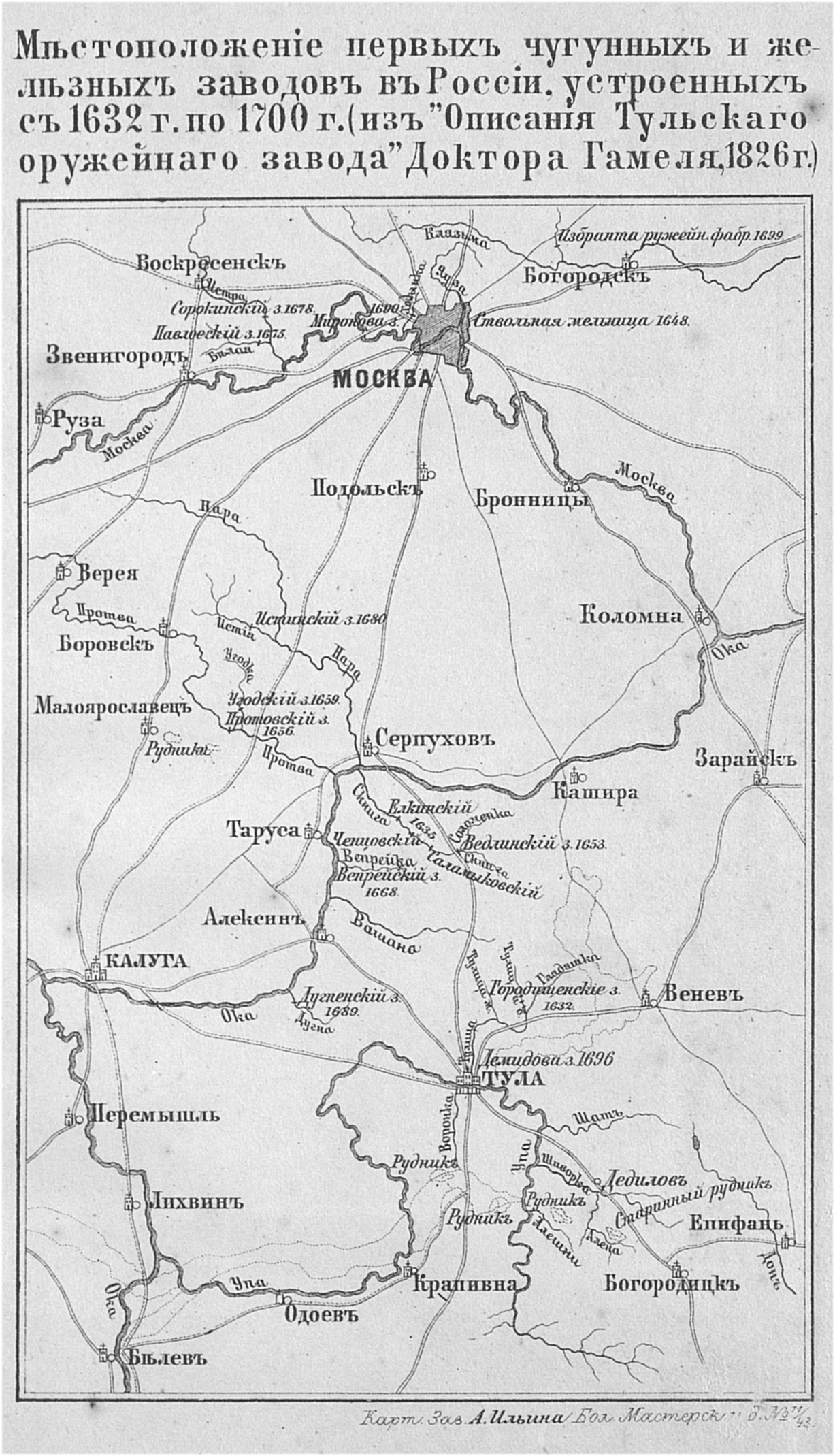 Первые чугунные и железные заводы в России, устроенные с 1632 по 1700 год (из "Описания Тульского оружейного завода" Доктора Гамеля, 1826 год)