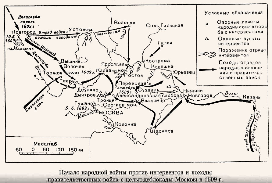 Карта: Начало народной войны против интервентов и походы правительственных войск с целью деблокады Москвы в 1609 г.
